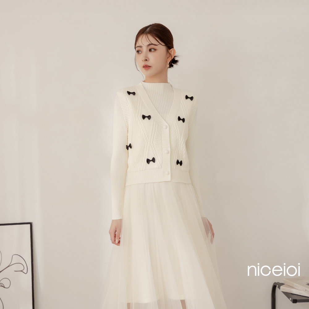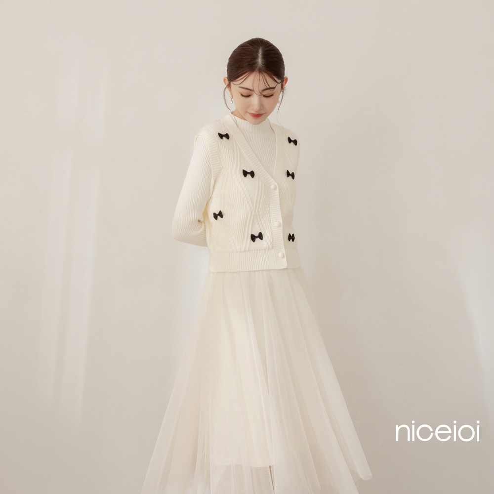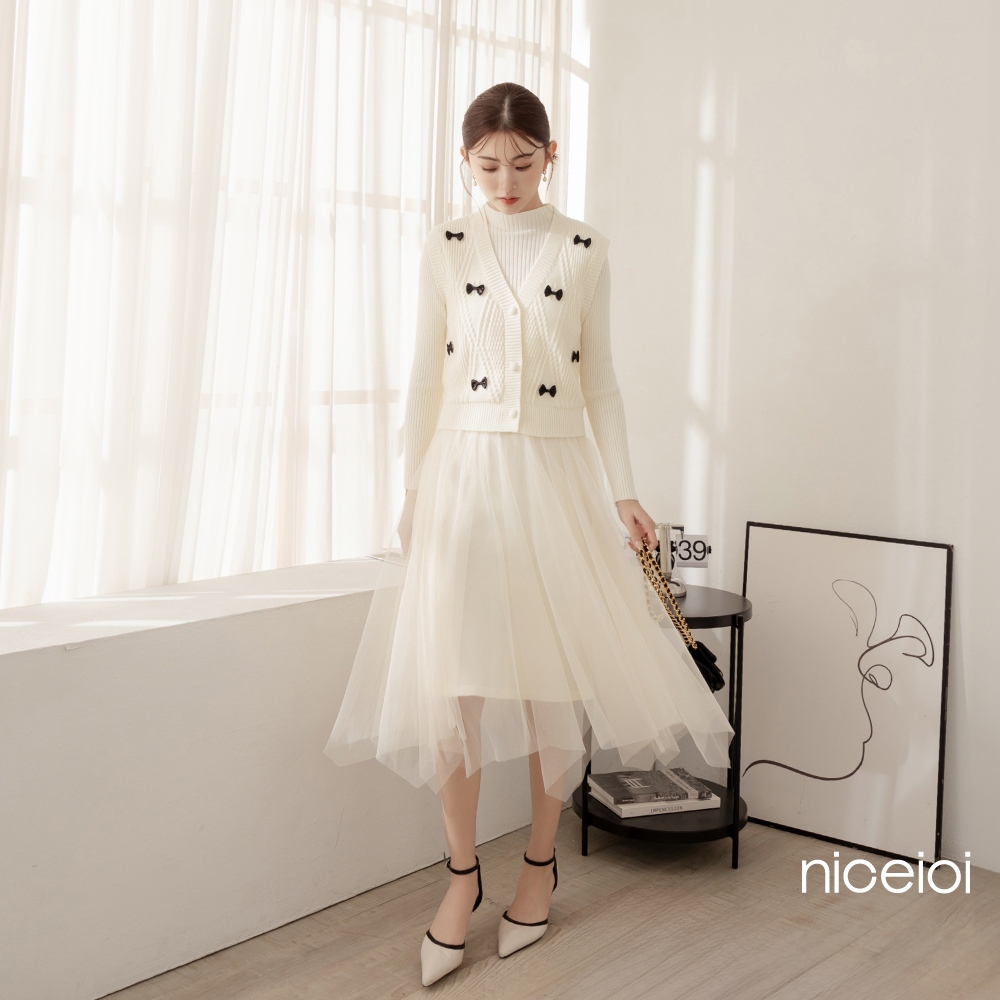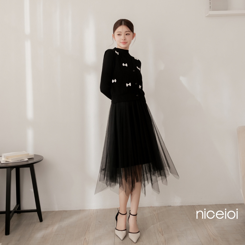 niceioi【特惠】兩件式洋裝 長洋 針織洋裝 [婚禮蝴蝶結兩件式針織紗裙長洋裝] 女裝米,F|黑,Fniceioi 官方旗艦店