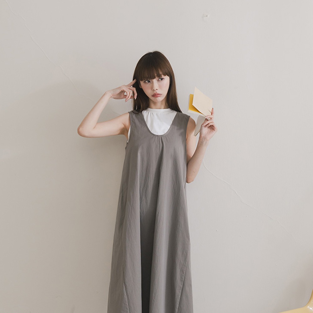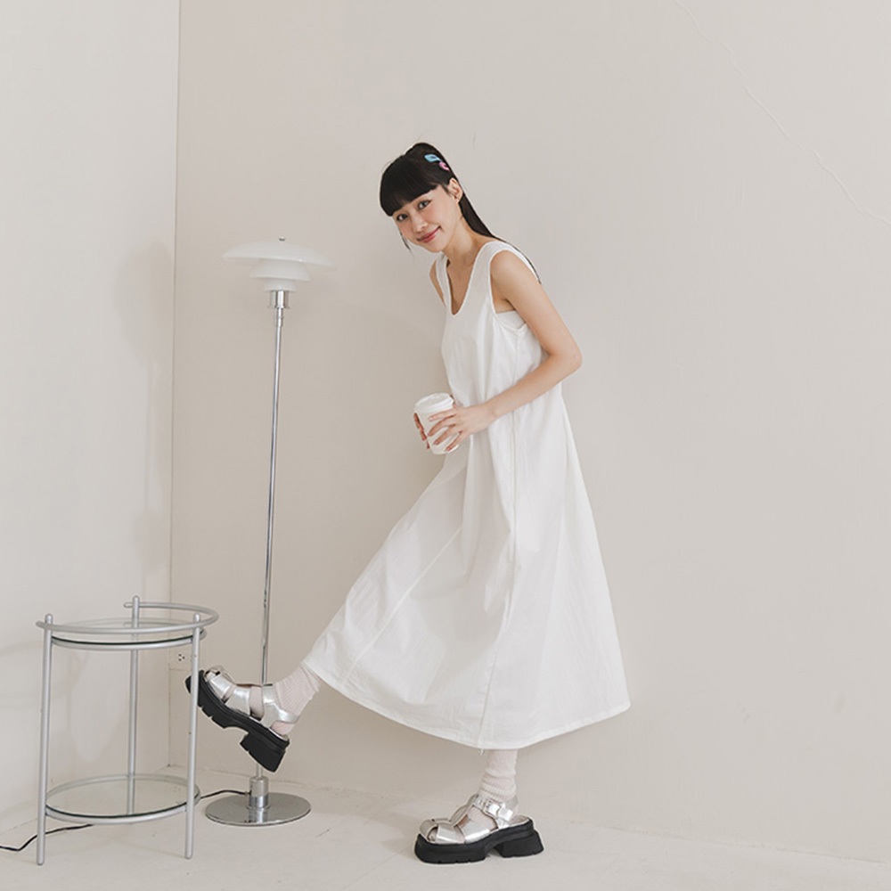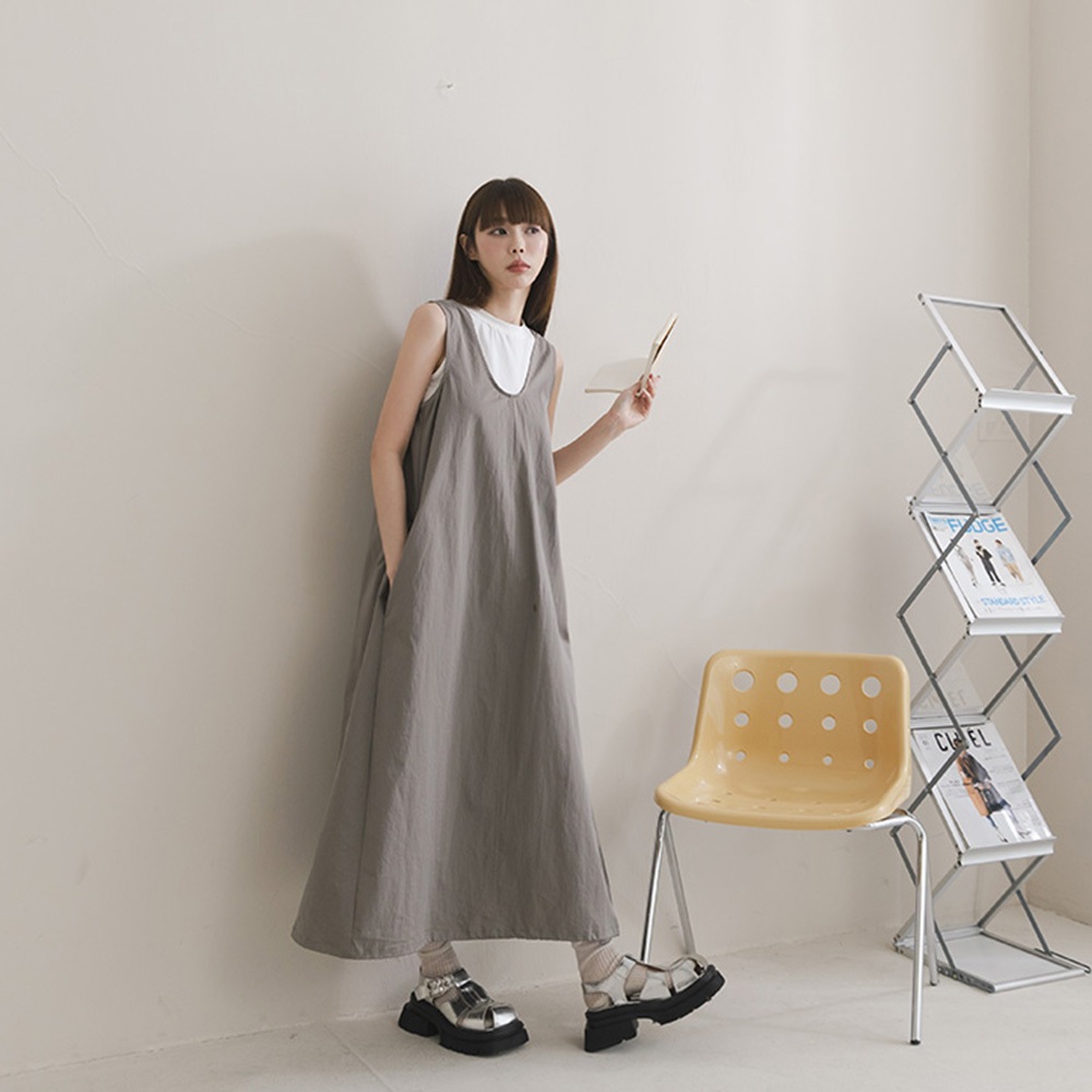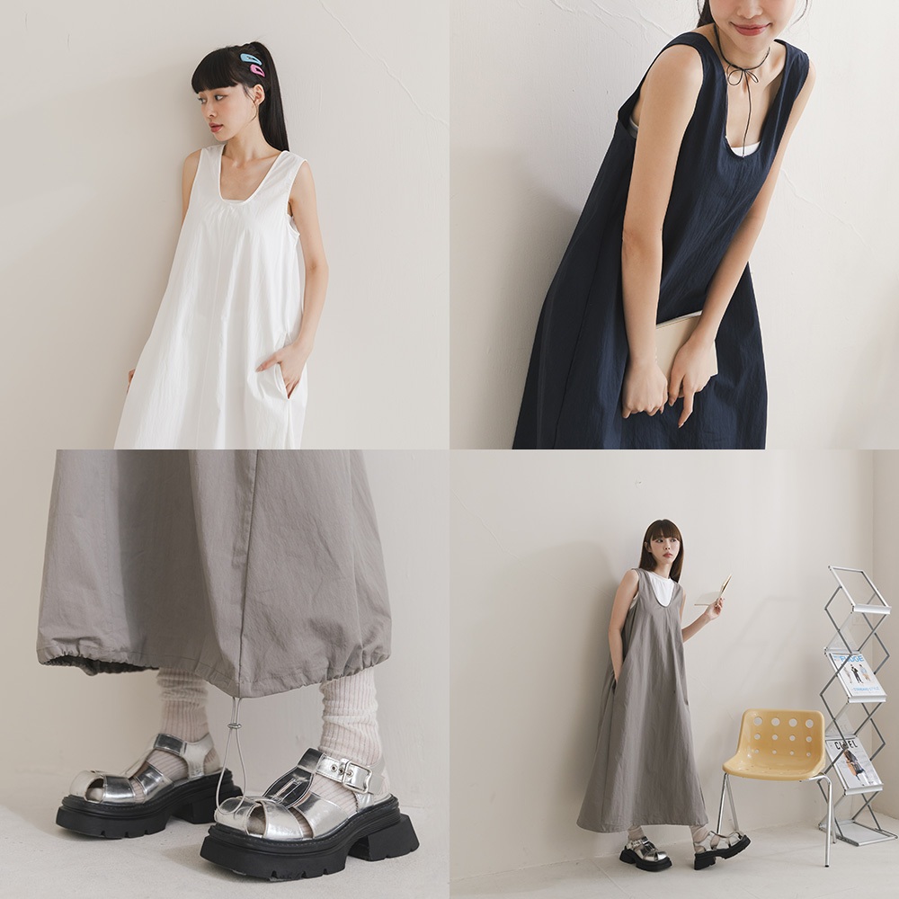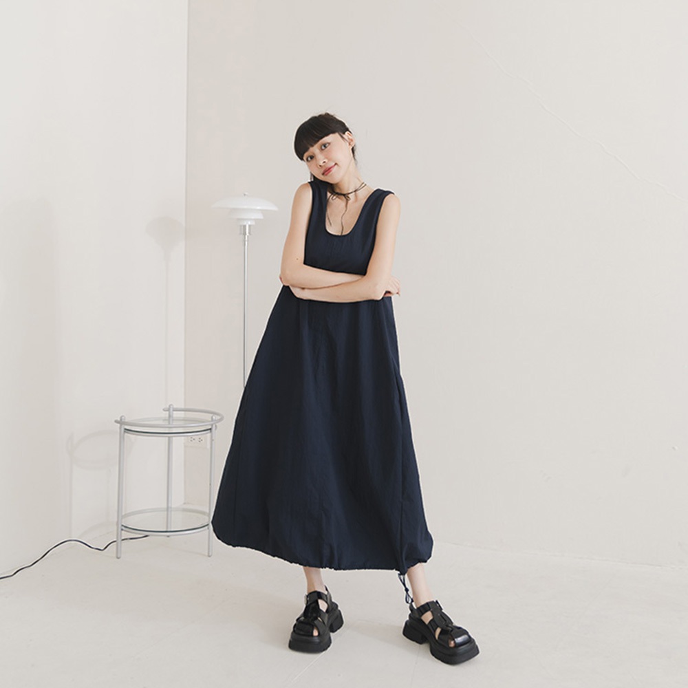 QUEENSHOP_ S 女裝 U領下擺抽繩無袖長洋裝 三色售 現+預 【01087079】灰|白|藍QUEENSHOP
