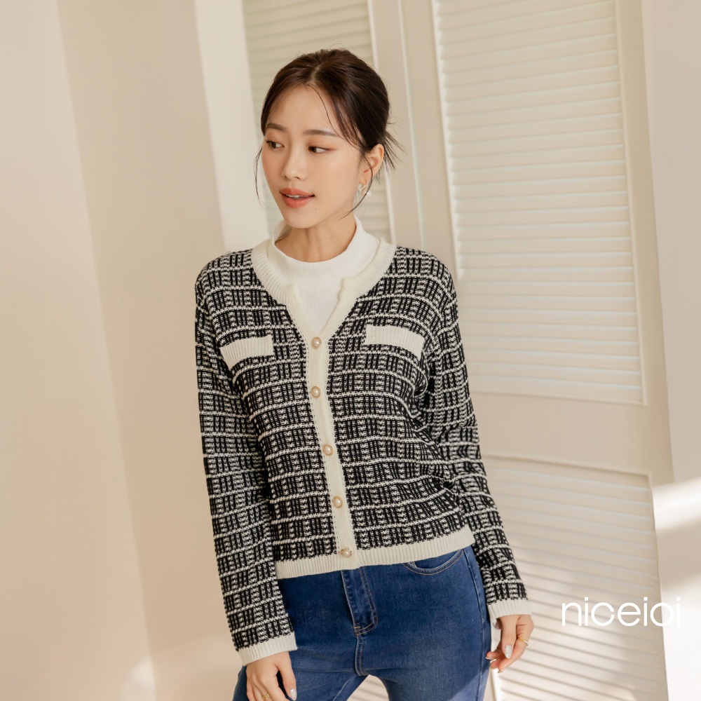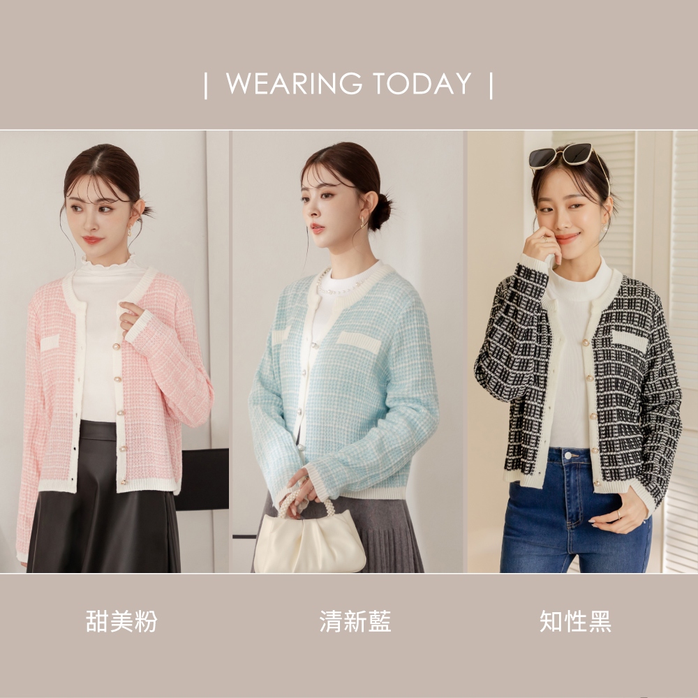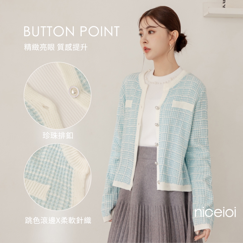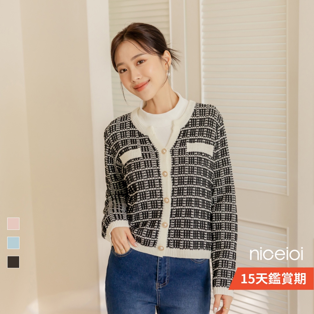niceioi【特惠】小香風外套 外套 針織外套 黑色 [珍珠釦小香風格紋針織外套] 必敗選品 女裝