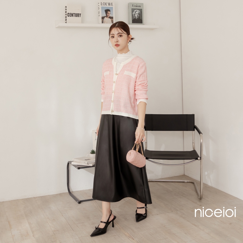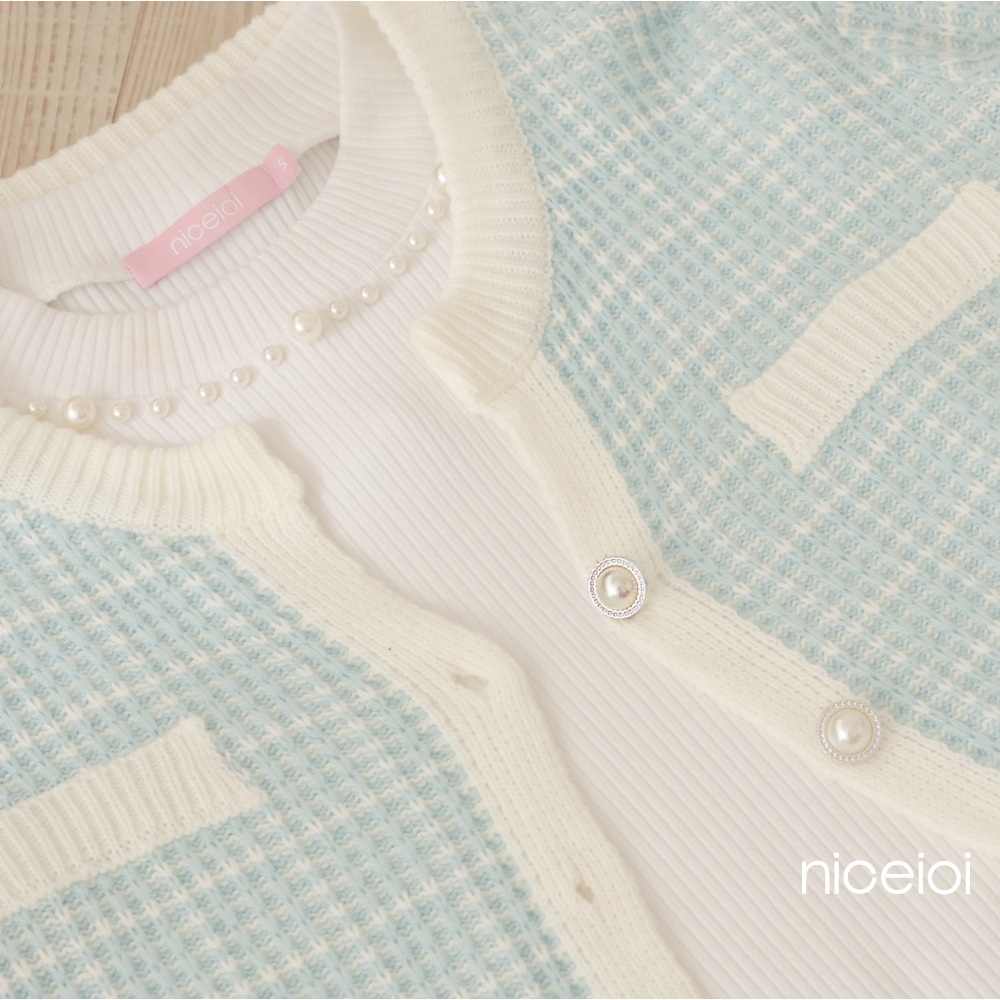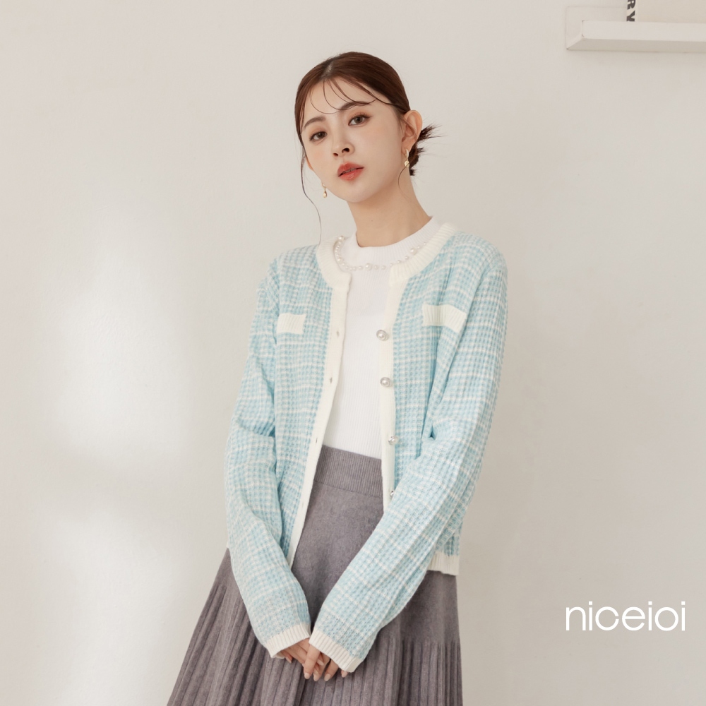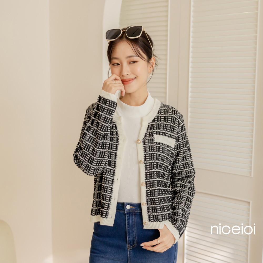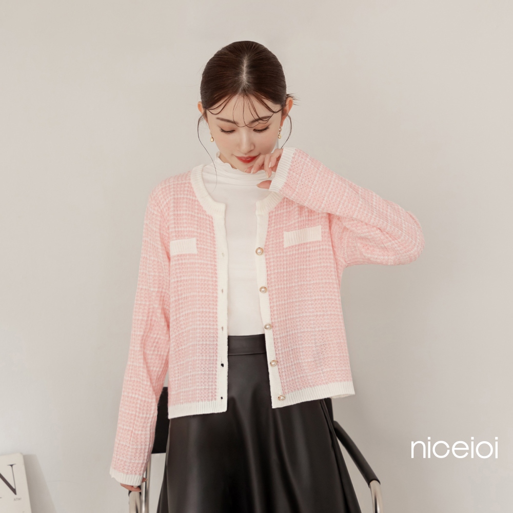 niceioi【特惠】小香風外套 外套 針織外套 黑色 [珍珠釦小香風格紋針織外套] 必敗選品 女裝