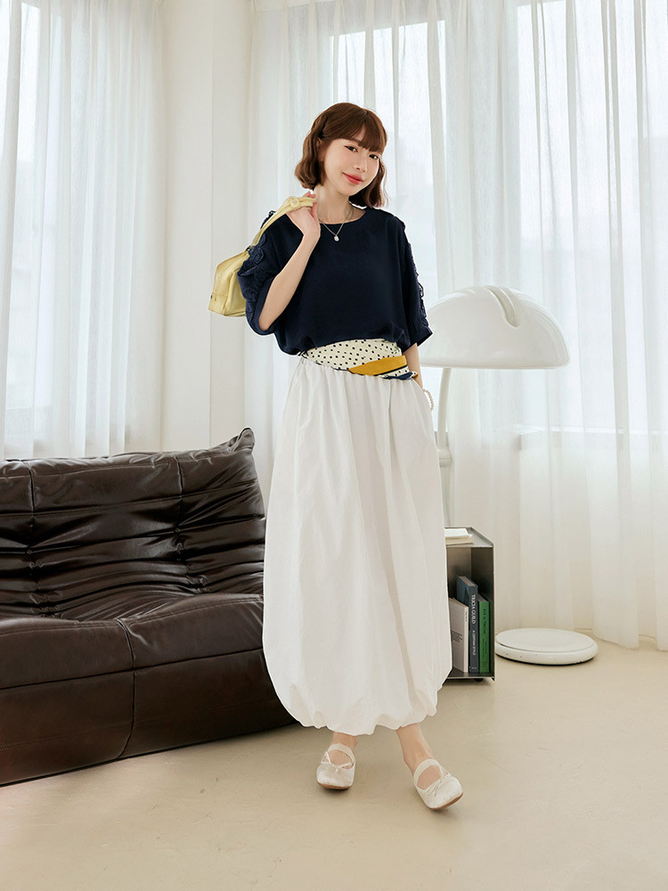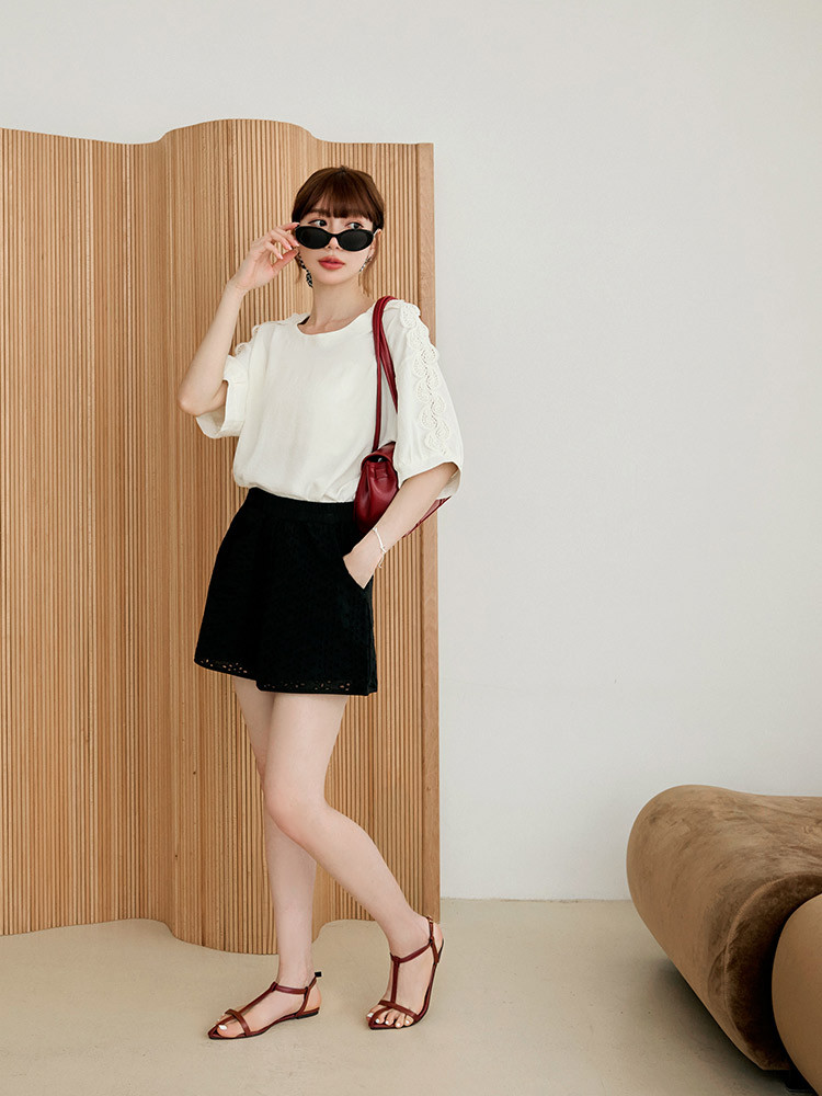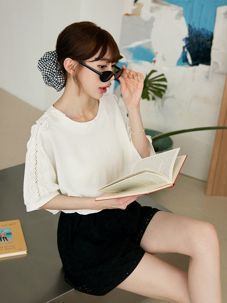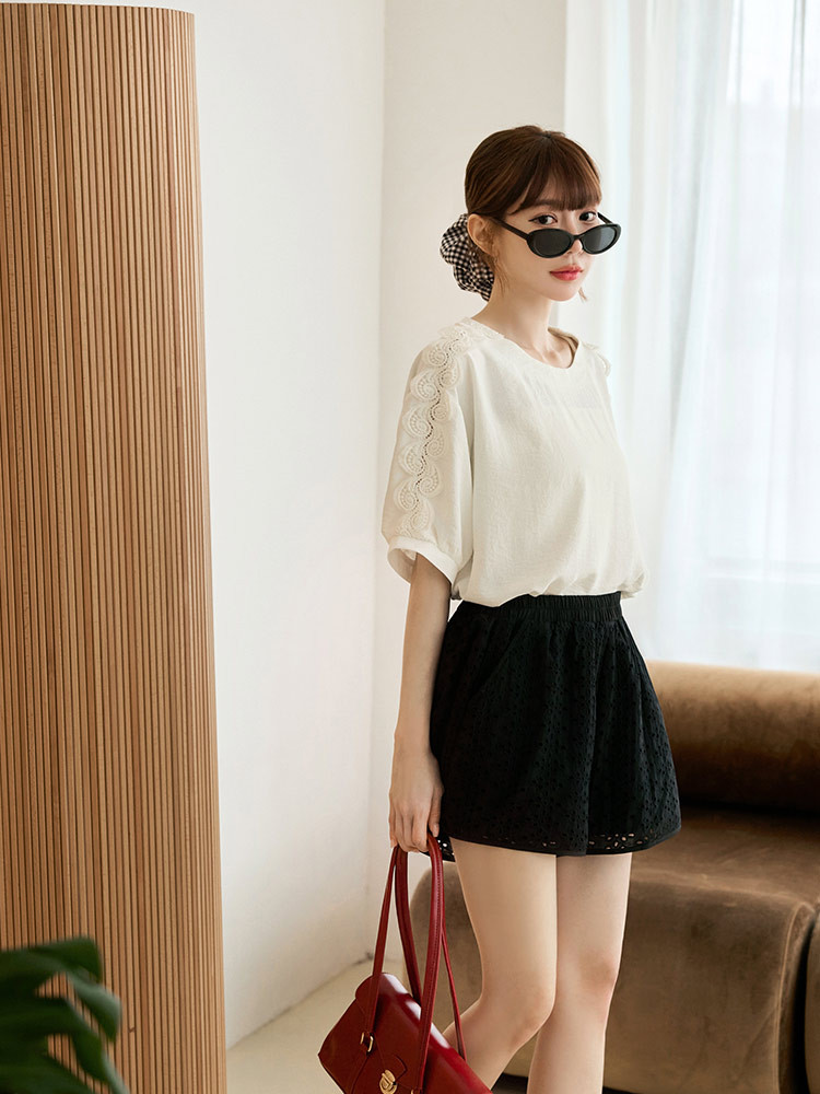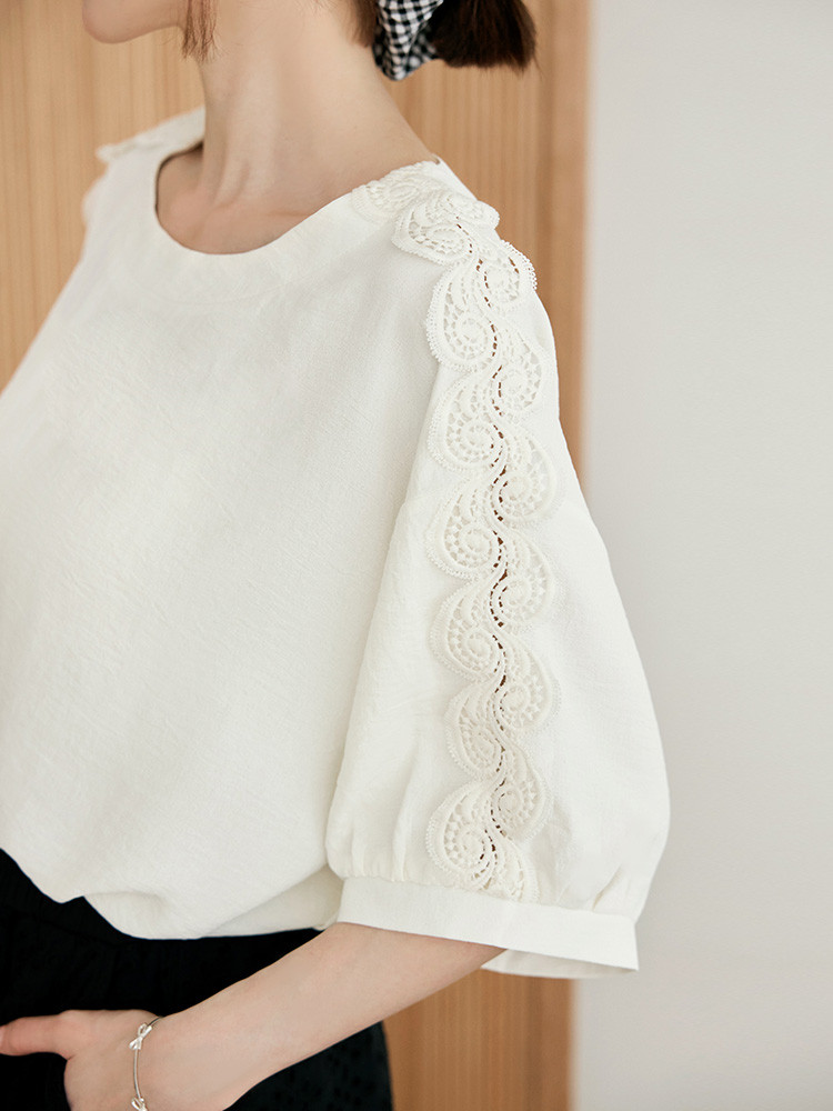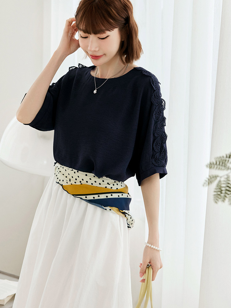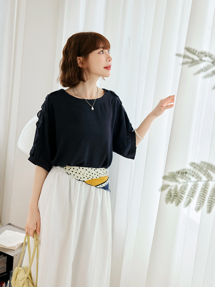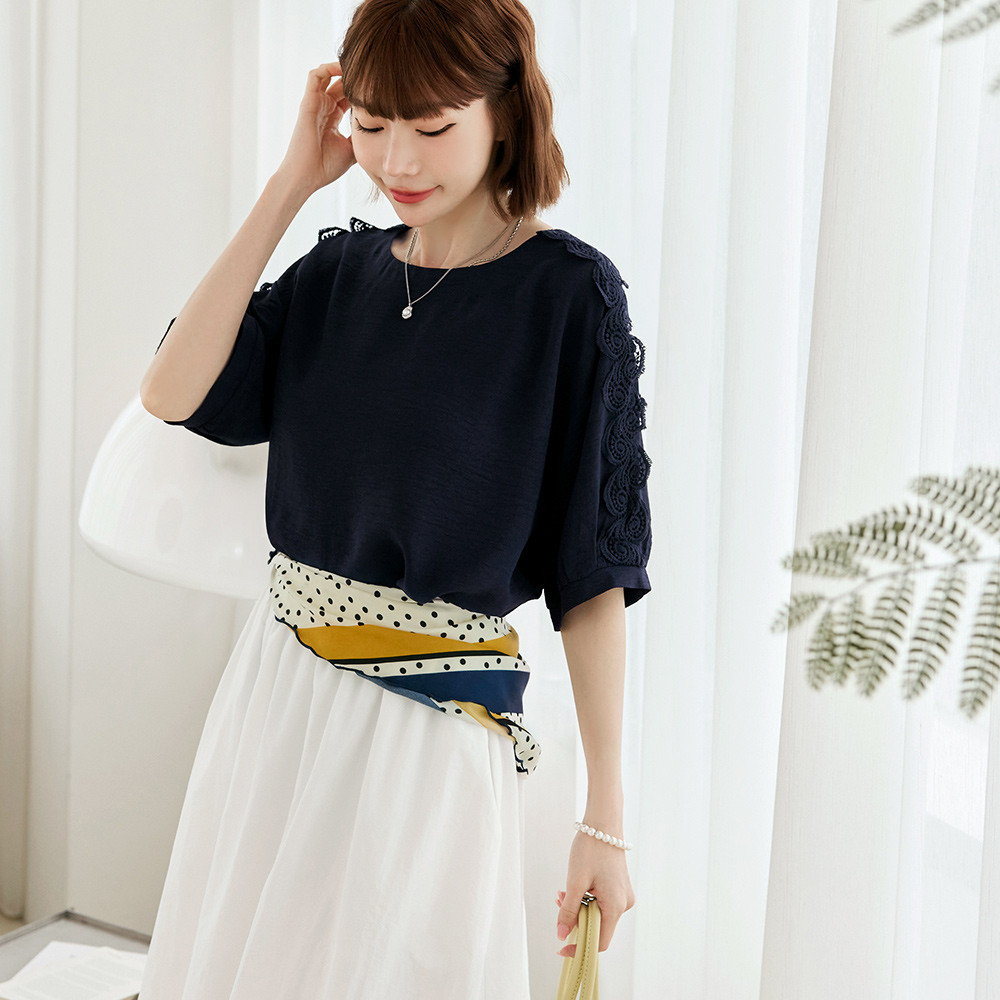 OB嚴選 鏤空蕾絲拼接泡泡袖上衣 《AB20650》象牙白,F|象牙白,XL|象牙白,2L|象牙白,3L|深藍,F|深藍,XL|深藍,2L|深藍,3LT-shirtsOB嚴選官方旗艦店
