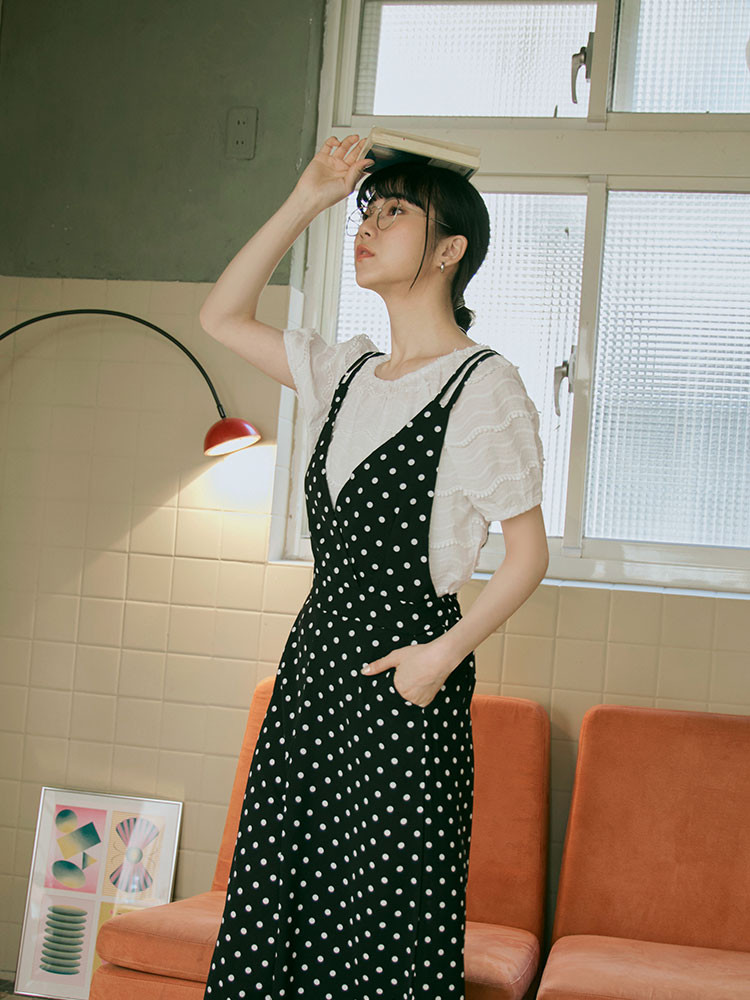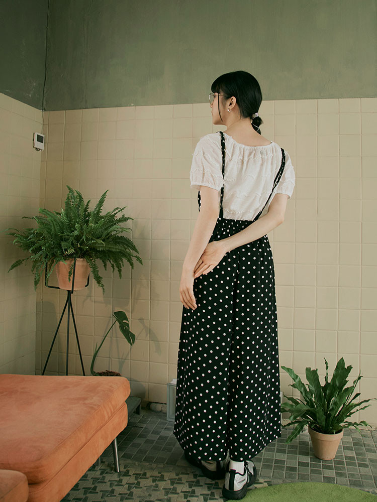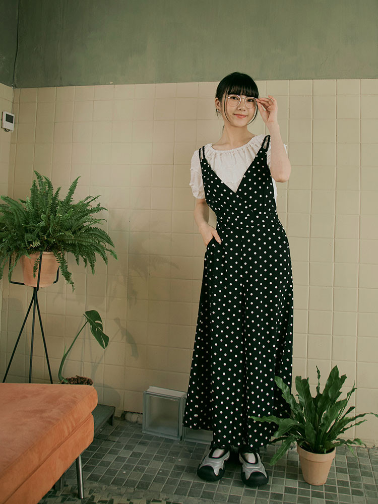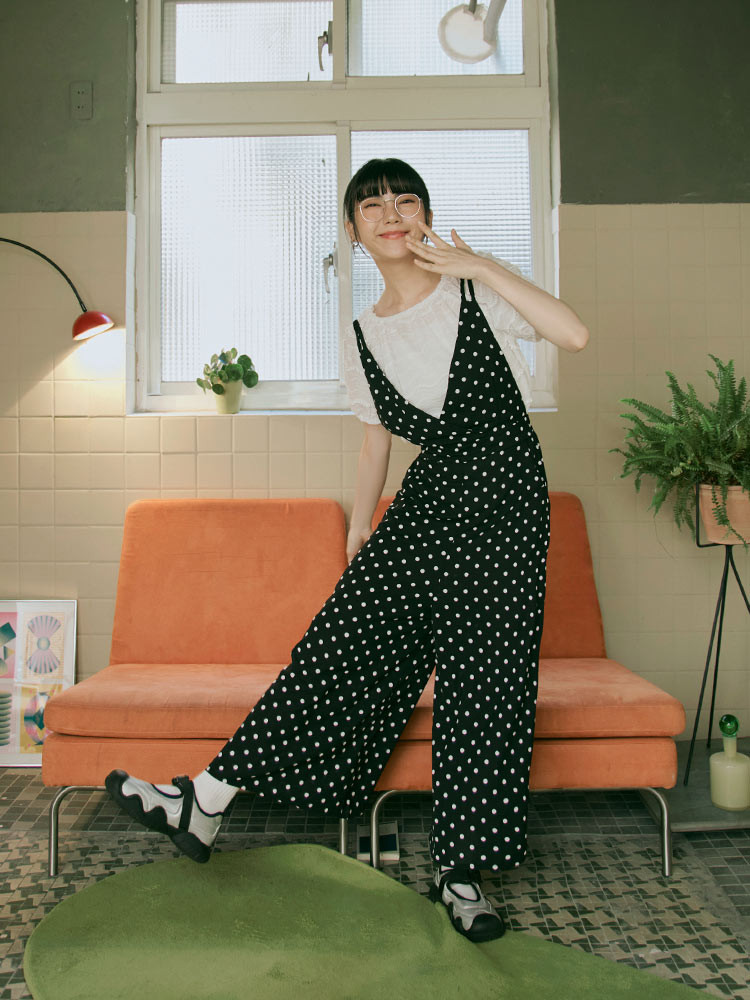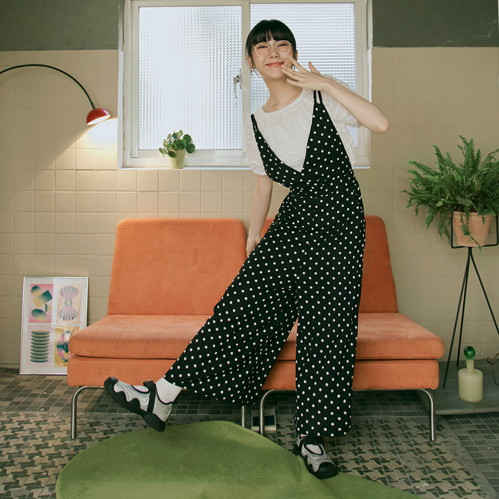 OB嚴選 摩登點點V字領腰鬆緊連身吊帶褲 《BA5490》日系/大尺碼/現貨/女裝黑底白點,M|黑底白點,L|黑底白點,XL|黑底白點,2L|黑底白點,3L|黑底白點,SJumpsuitsOB嚴選官方旗艦店