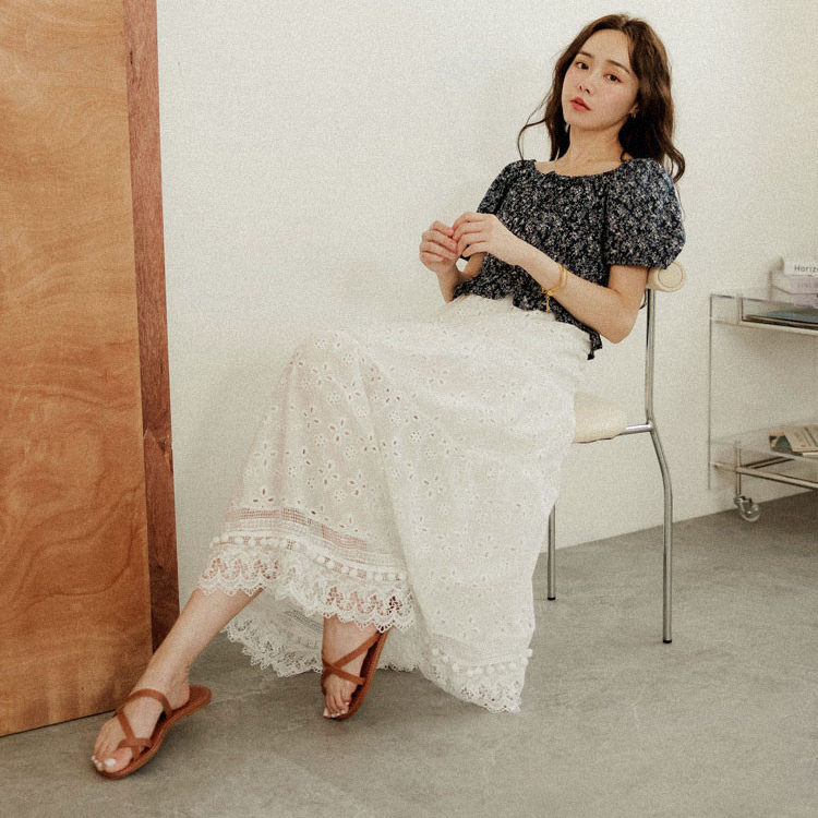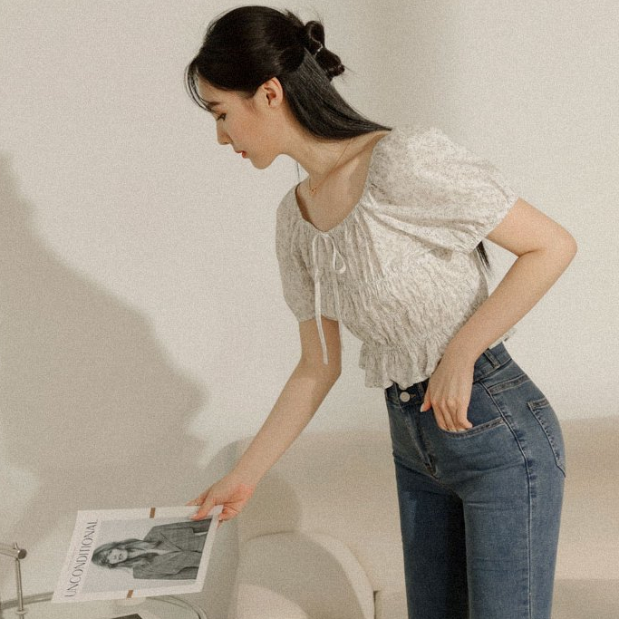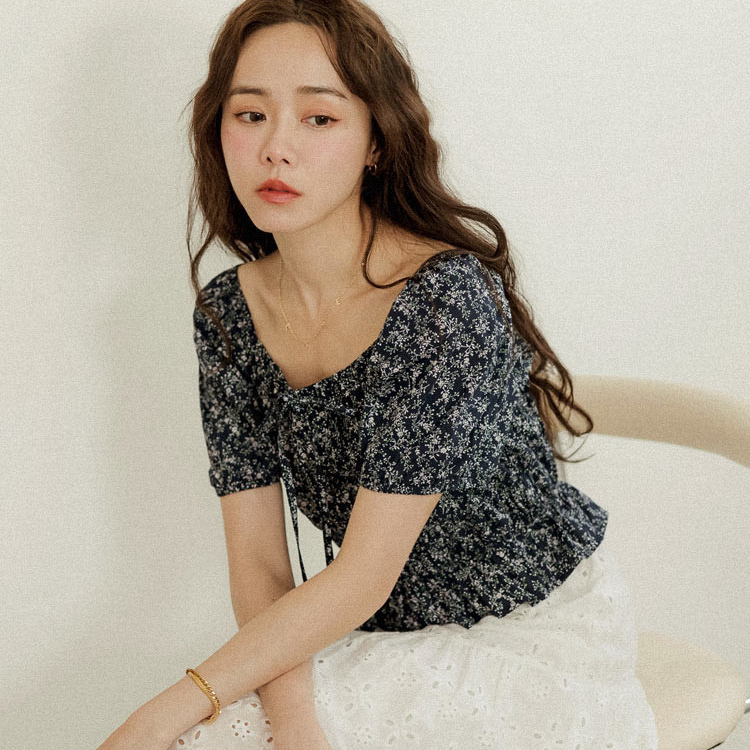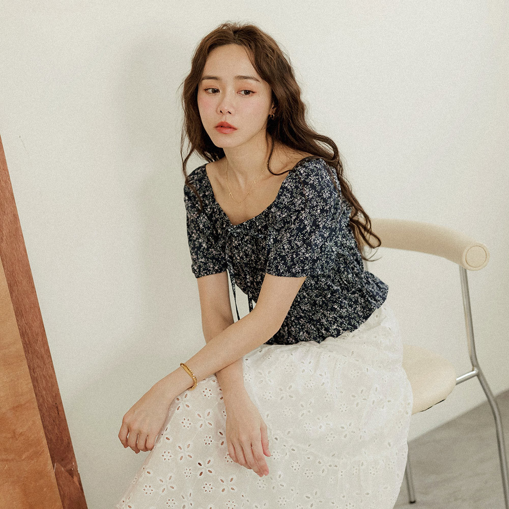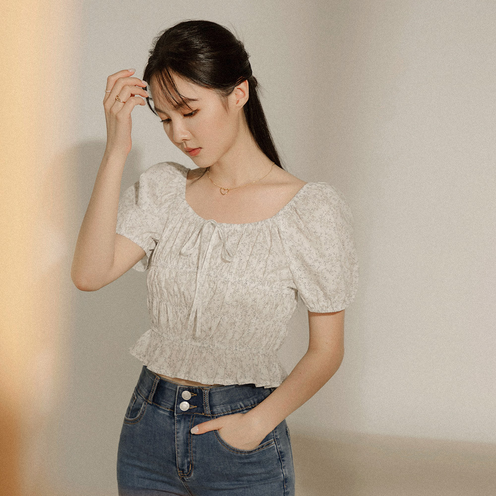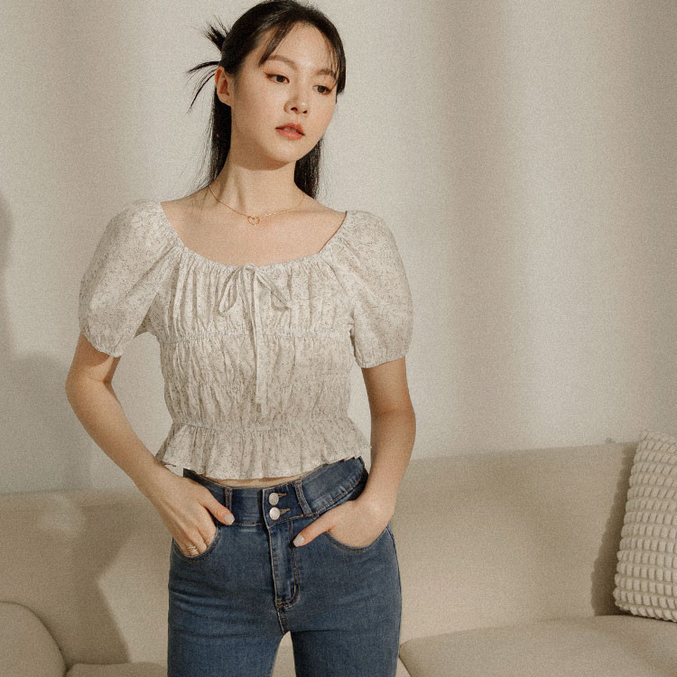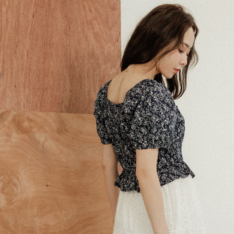 OB嚴選 純棉碎花方領抽繩鬆緊壓褶泡泡袖上衣 《AB19563》時髦/現貨/女裝深藍,S|深藍,M|深藍,L|深藍,XL|白,S|白,M|白,L|白,XLT-shirtsOB嚴選官方旗艦店
