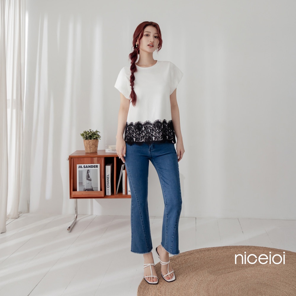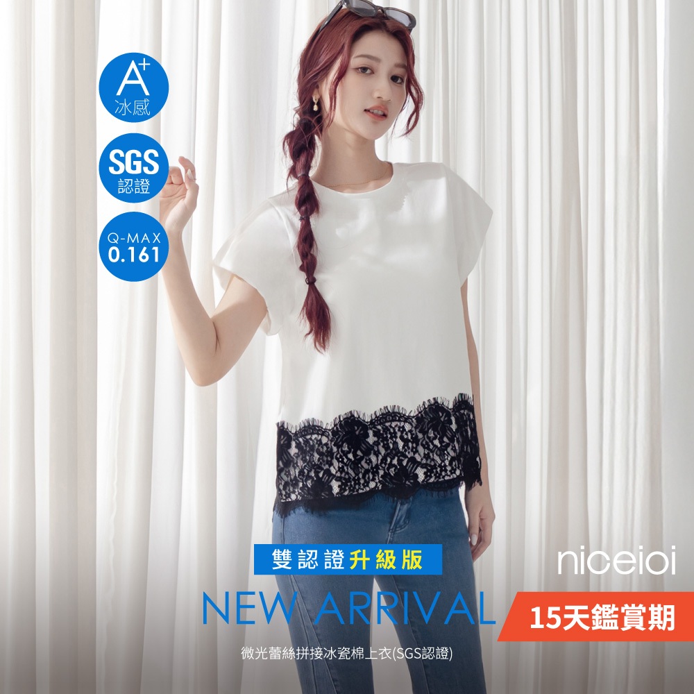 niceioi 涼感衣 短袖 蕾絲上衣 白色 [微光蕾絲拼接冰瓷棉上衣] (SGS認證) 落肩t恤 女裝
