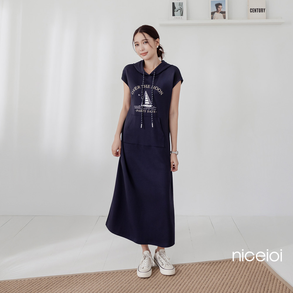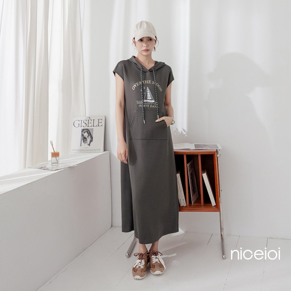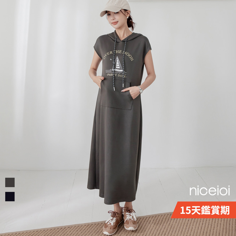 niceioi 空氣棉 洋裝 長版洋裝 深灰色 [夏夕帆船連帽抽繩空氣棉洋裝] S-XL 連帽洋裝 大尺碼洋裝 女裝