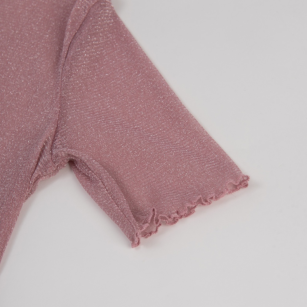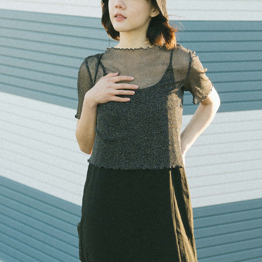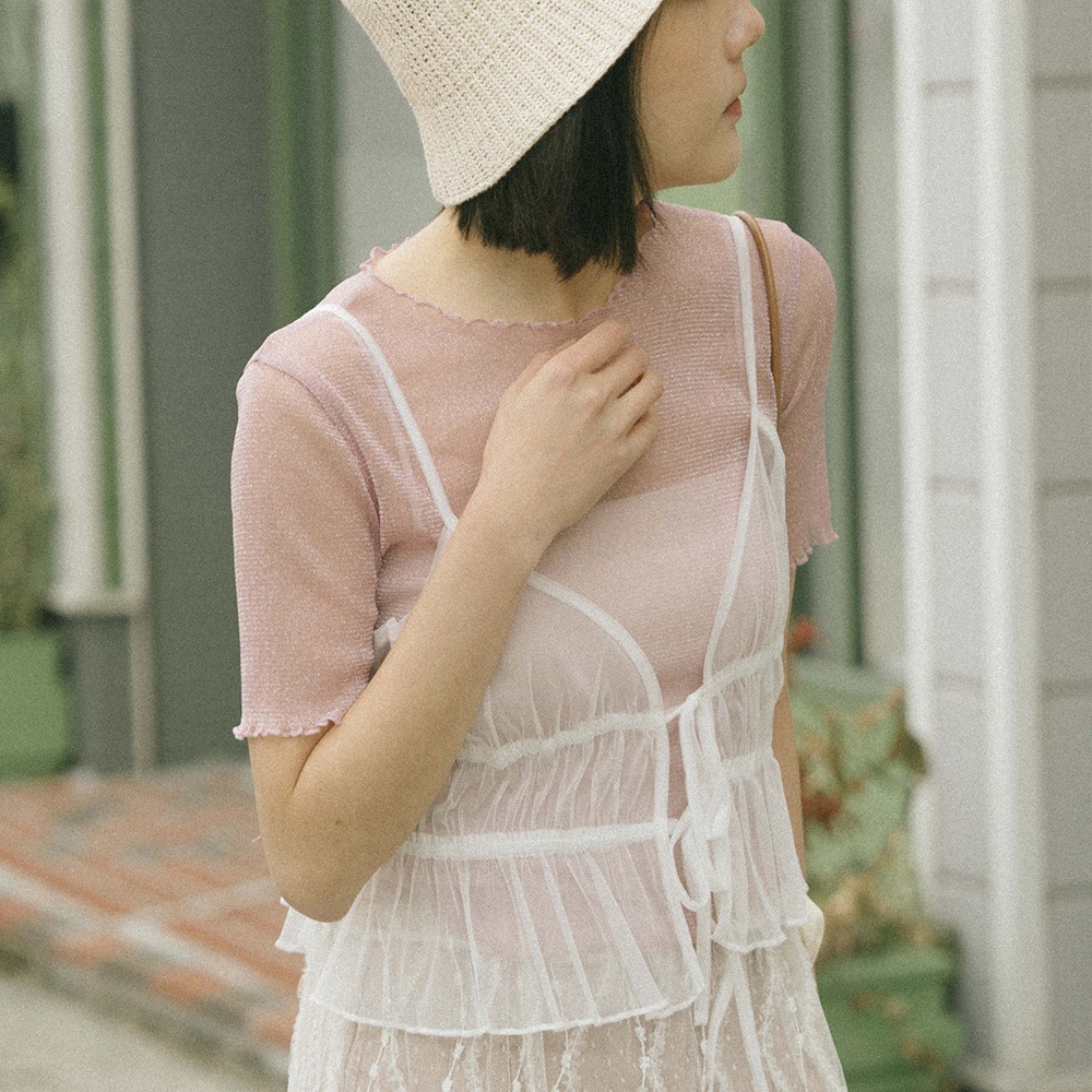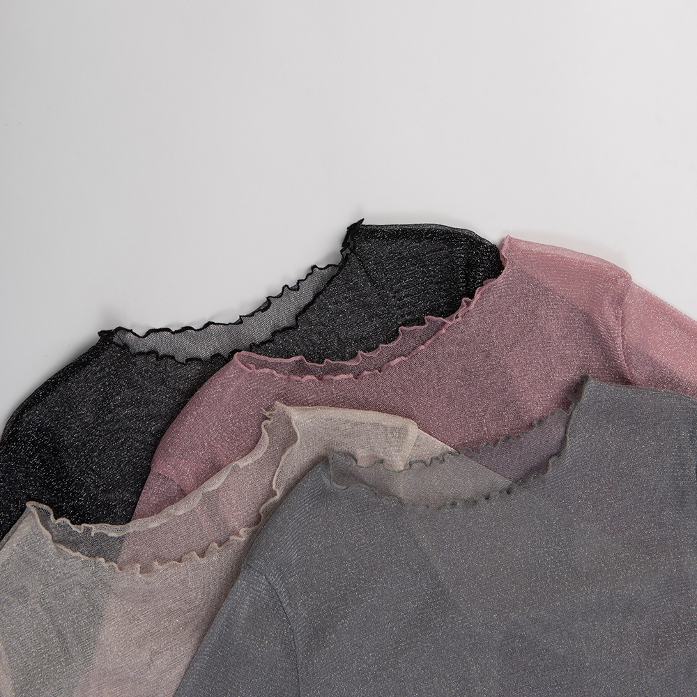 QUEENSHOP_ S 女裝 短袖 金蔥木耳邊透膚短版上衣 四色售 現+預 【01098115】黑|灰|粉|米白OthersQUEENSHOP
