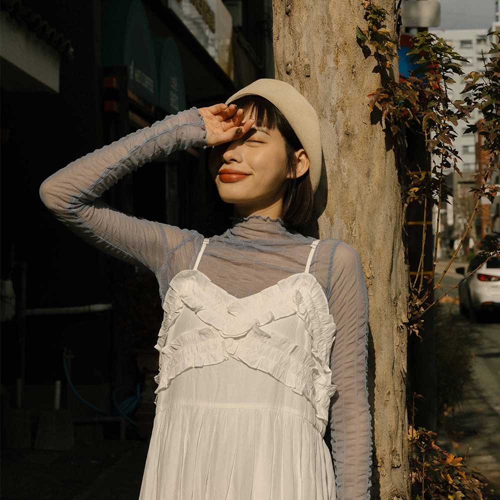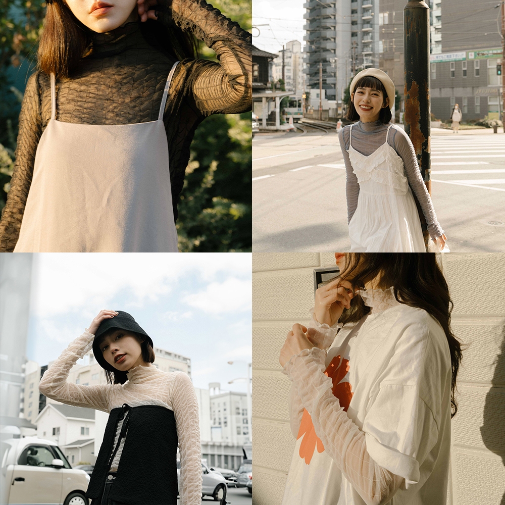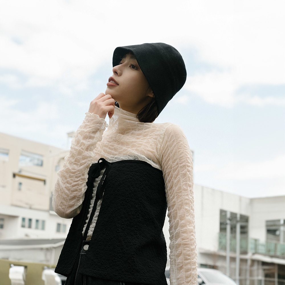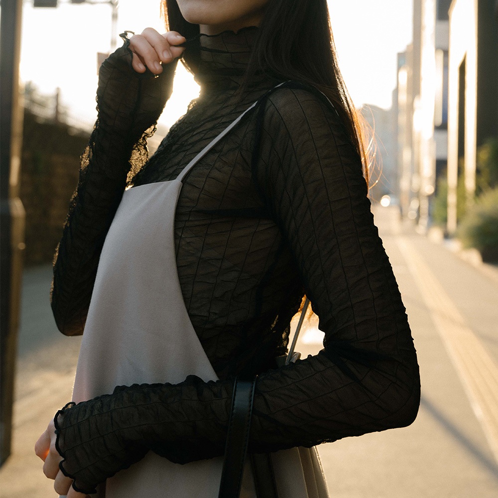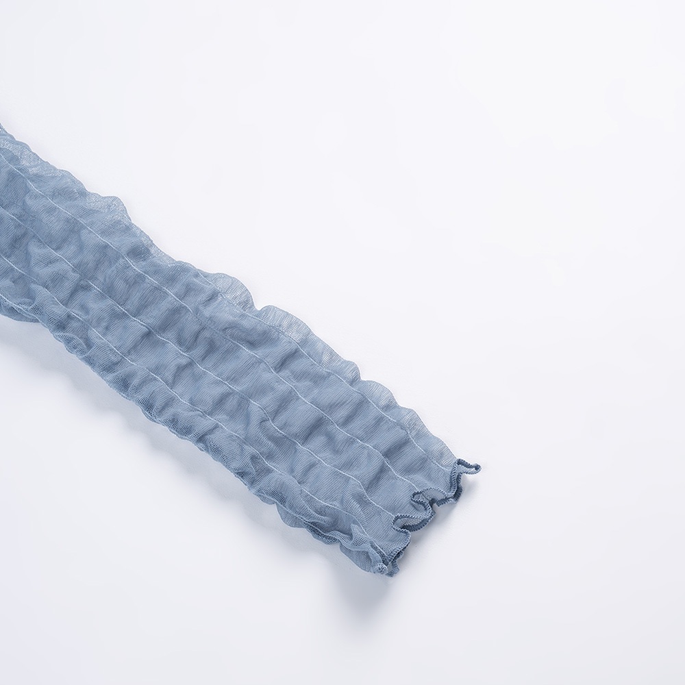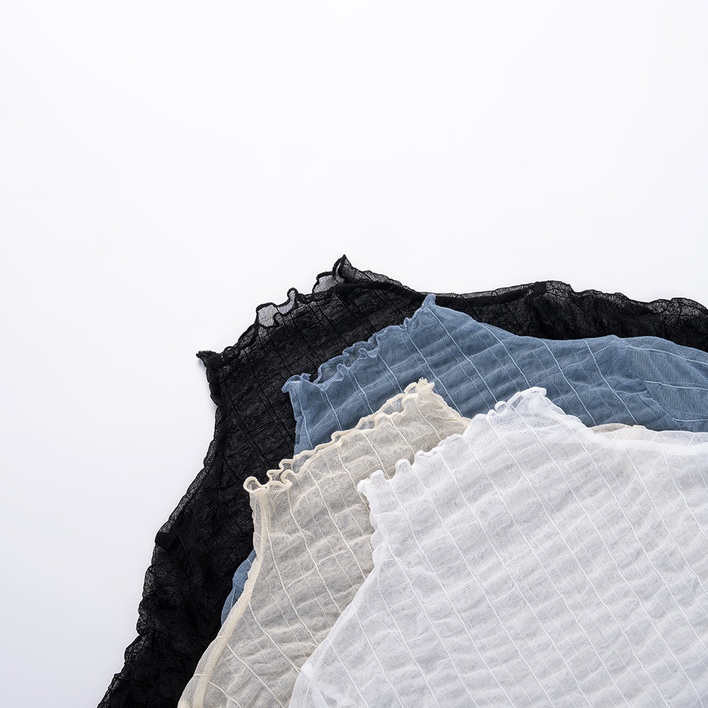 QUEENSHOP_ S 女裝 長袖 微抽皺木耳邊透膚高領上衣 四色售 現+預 【01098785】藍|杏|黑OthersQUEENSHOP