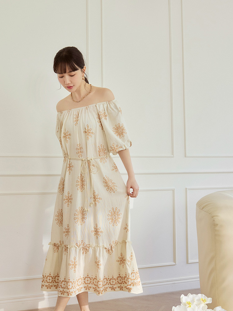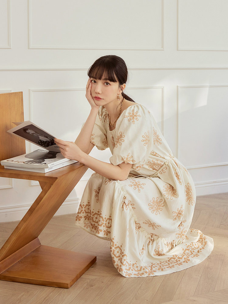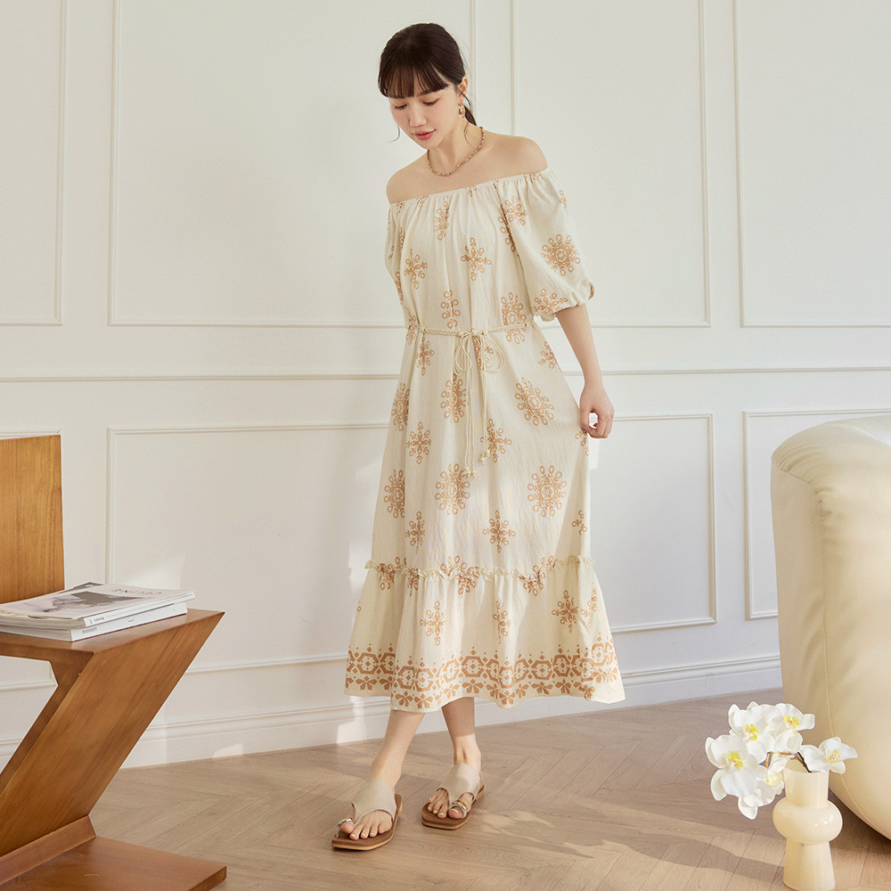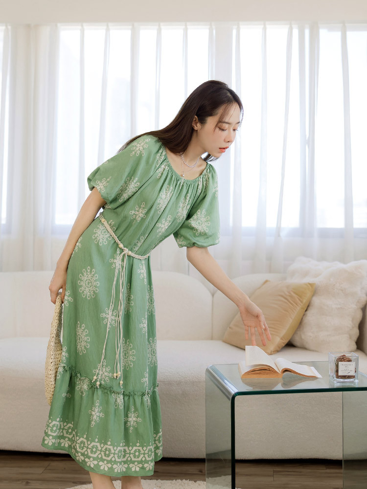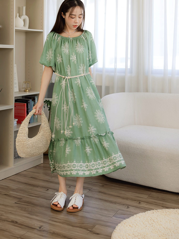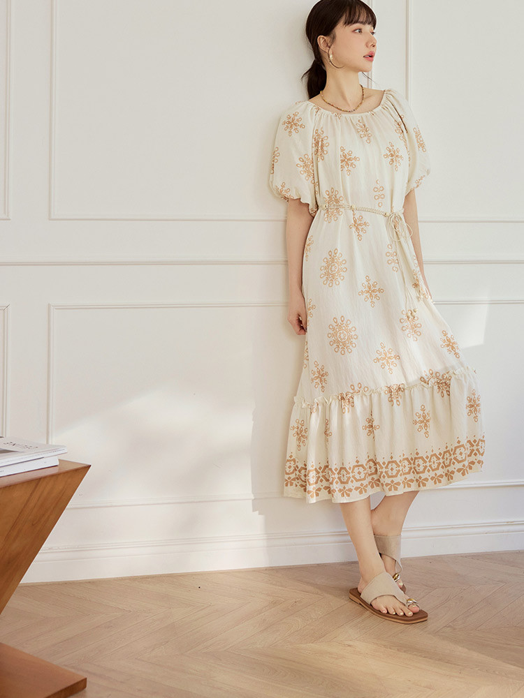 OB嚴選 波西米亞印花鬆緊領寬鬆長洋裝(附腰帶) 《DA10604》杏/奶茶,F|杏/黑,F|黑,F|綠,FOB嚴選官方旗艦店