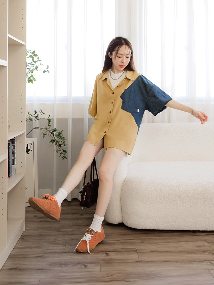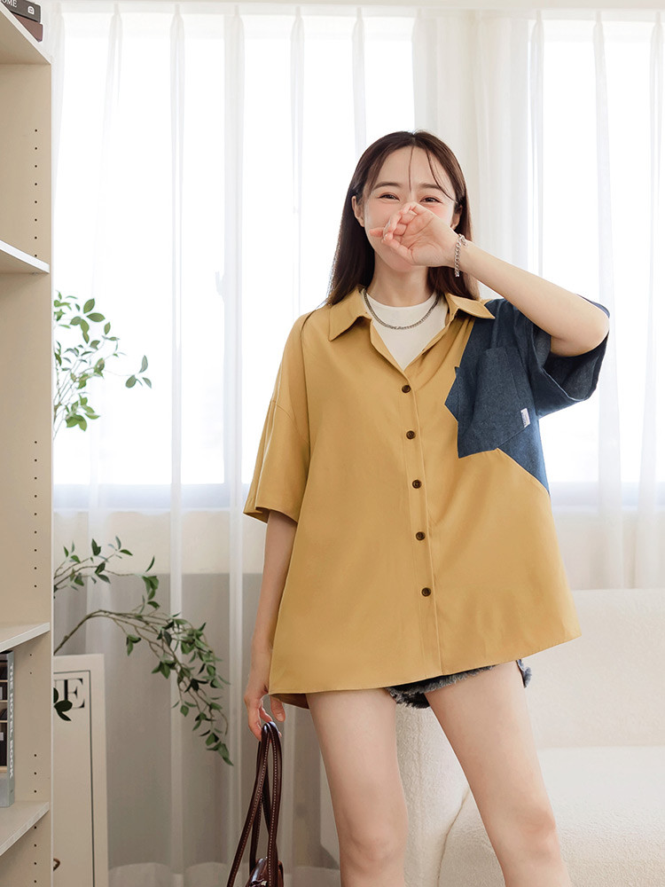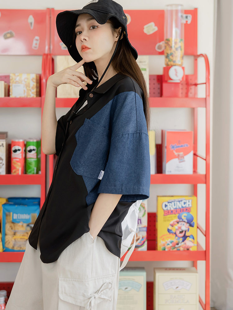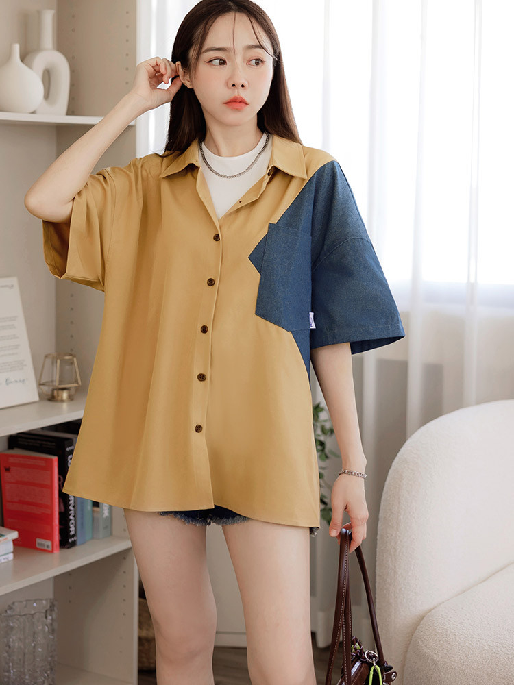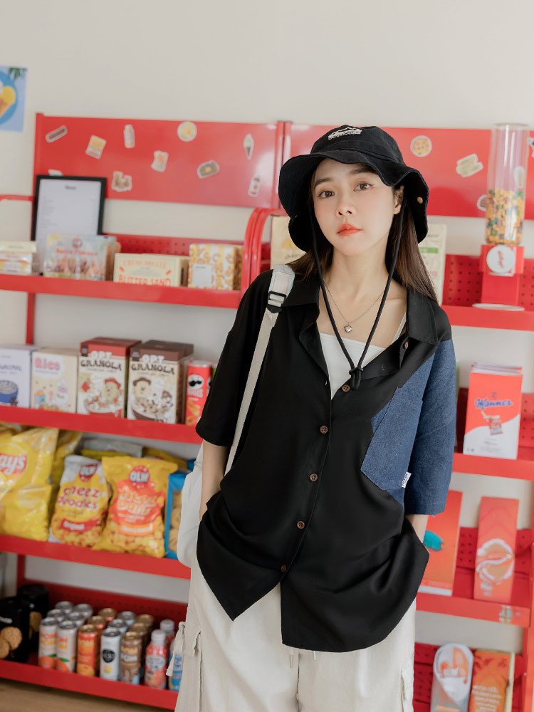 OB嚴選 撞色牛仔拼接排釦襯衫上衣 《AB20416》卡其,F|卡其,XL|卡其,2L|卡其,3L|黑,F|黑,XL|黑,2L|黑,3LT-shirtsOB嚴選官方旗艦店