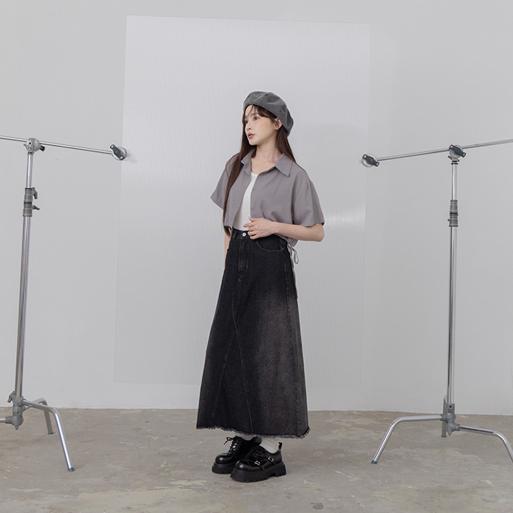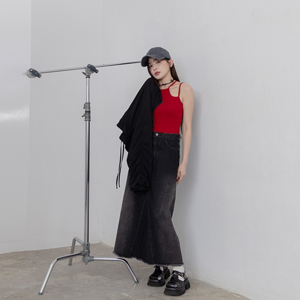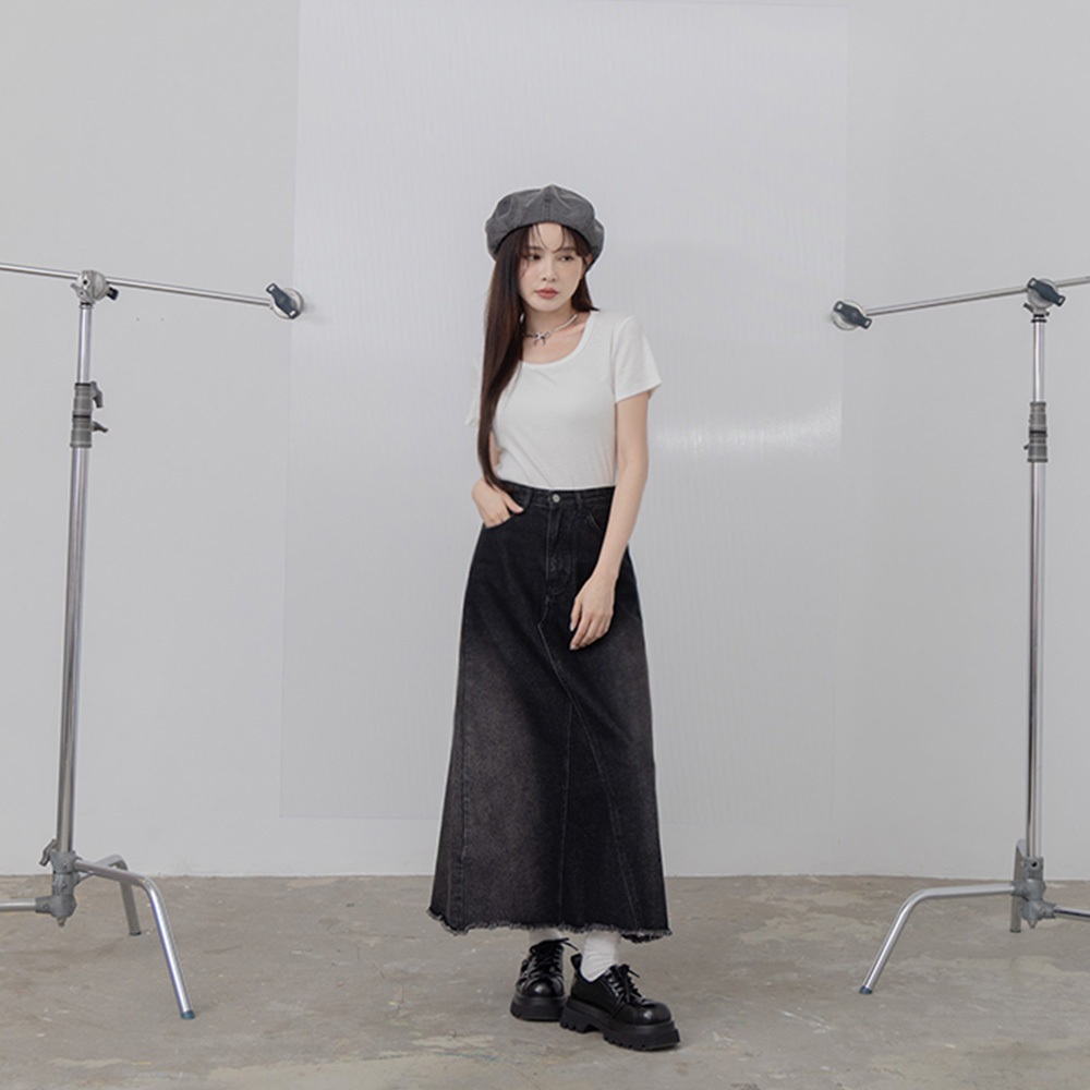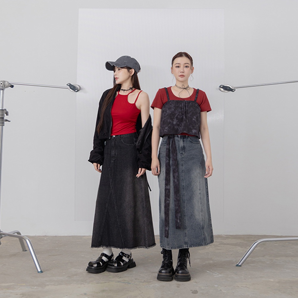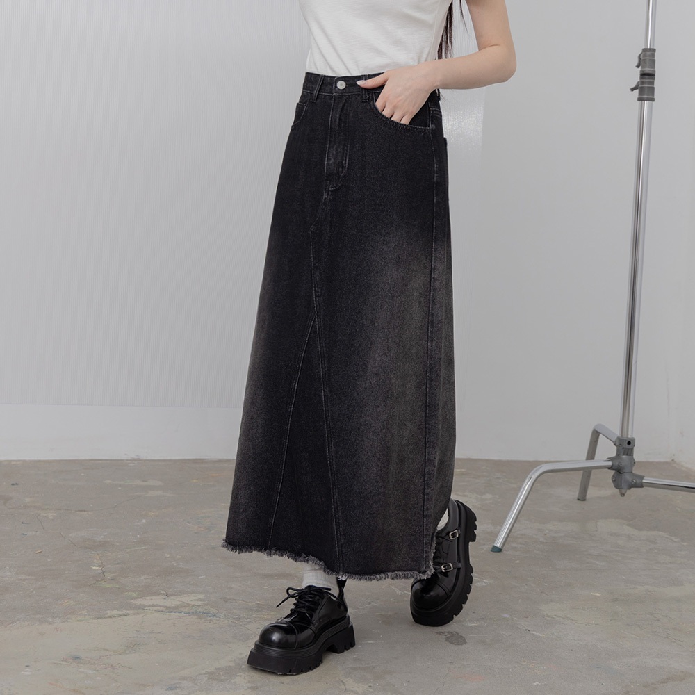 QUEENSHOP_ S 女裝 水洗感下擺鬚邊剪接牛仔長裙 S/M/L 現+預 【03021571】