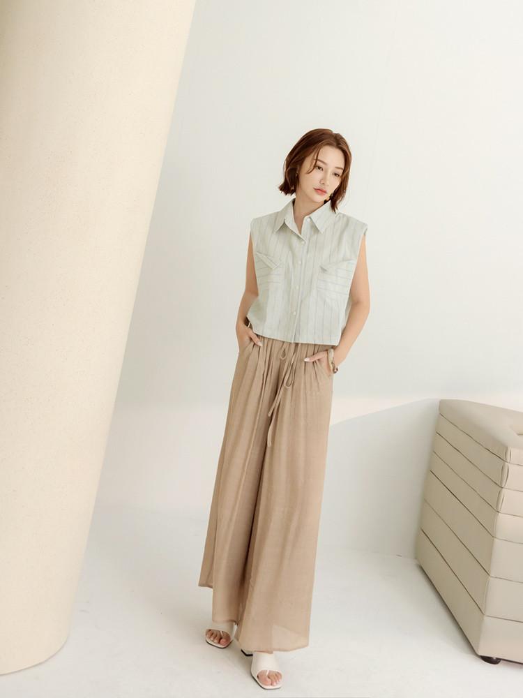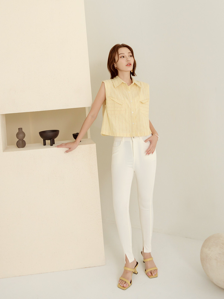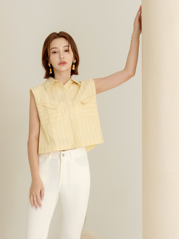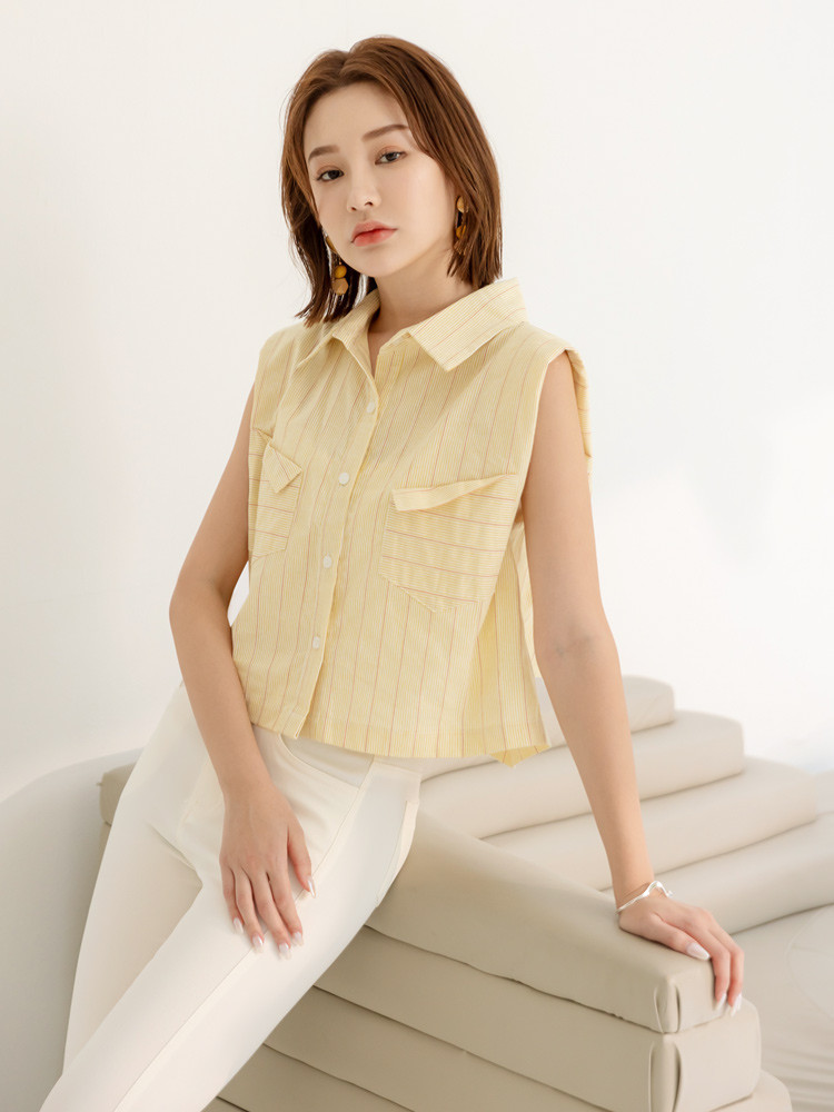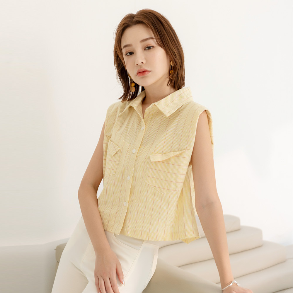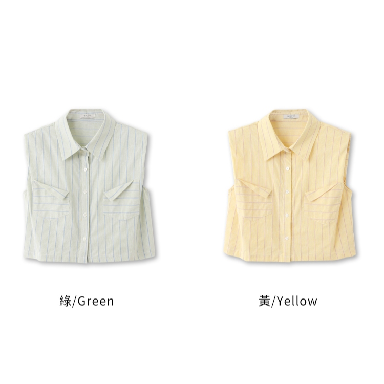 OB嚴選 棉質條紋無袖短版襯衫/上衣 《AB18866》大尺碼/現貨/女裝綠,F|綠,XL|綠,3L|黃,F|黃,XL|黃,3LShirts & BlousesOB嚴選官方旗艦店