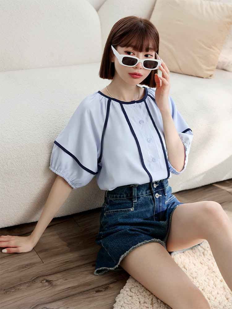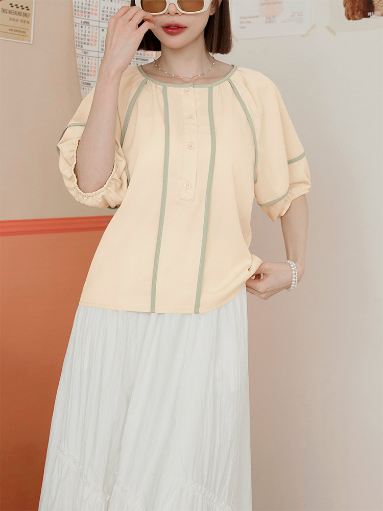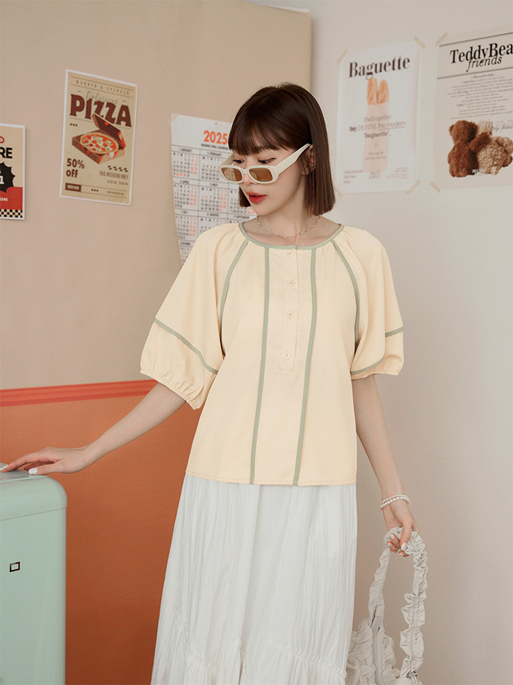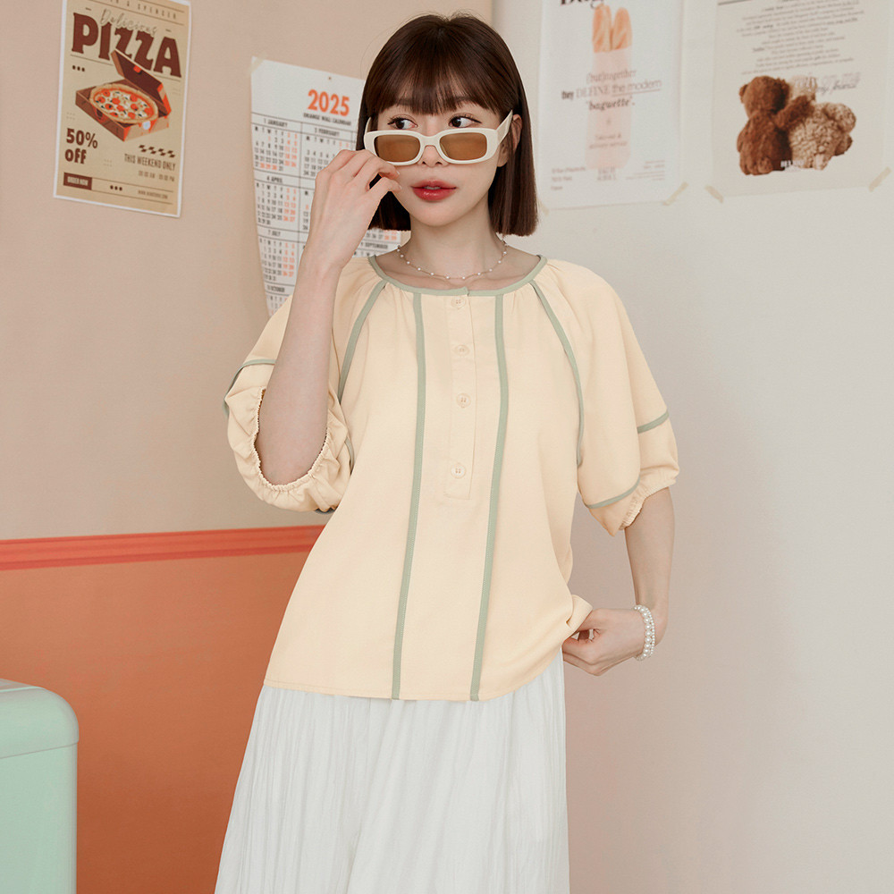 OB嚴選 圓領撞色滾邊半開襟泡泡袖上衣 《AB20353》杏,S|杏,M|杏,L|杏,XL|杏,2L|杏,3L|淺水藍,S|淺水藍,M|淺水藍,L|淺水藍,XL|淺水藍,2L|淺水藍,3LT-shirtsOB嚴選官方旗艦店