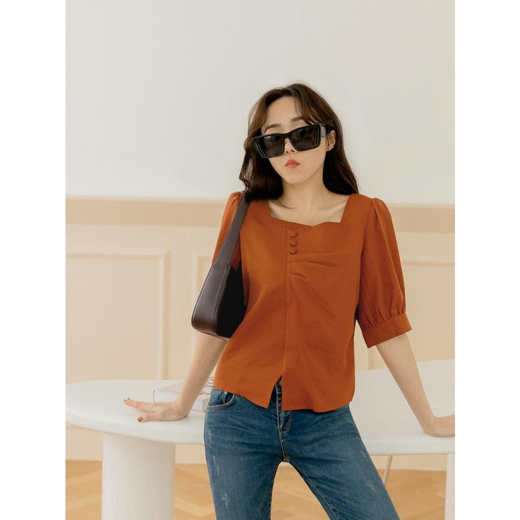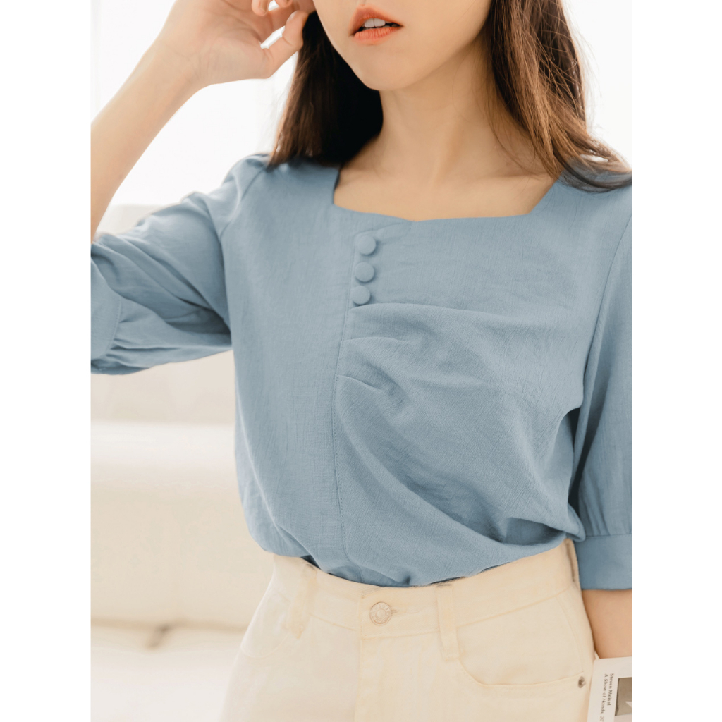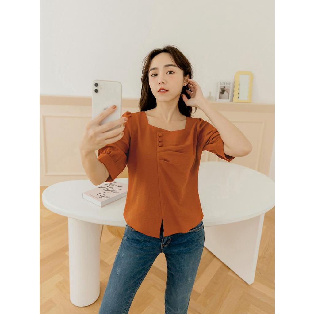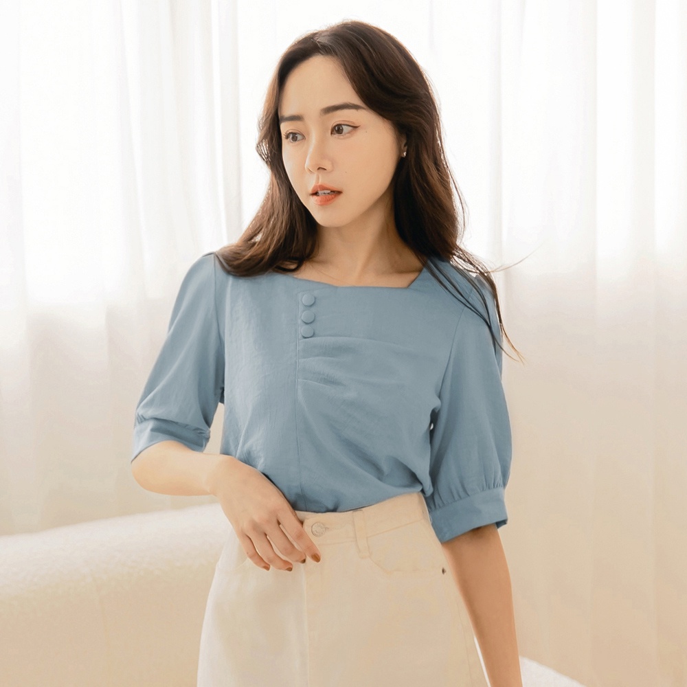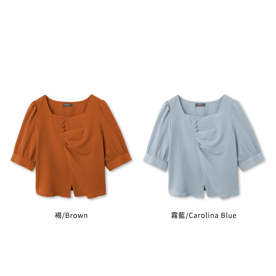 OB嚴選 小V臉.桃心領排釦抓皺七分拋袖短版上衣 《AB18176》大尺碼/女裝/現貨霧藍,2L|褐,L|褐,XL|褐,2L|褐,3L|霧藍,M|霧藍,L|霧藍,XL|褐,M|霧藍,S|霧藍,3L|褐,ST-shirtsOB嚴選官方旗艦店