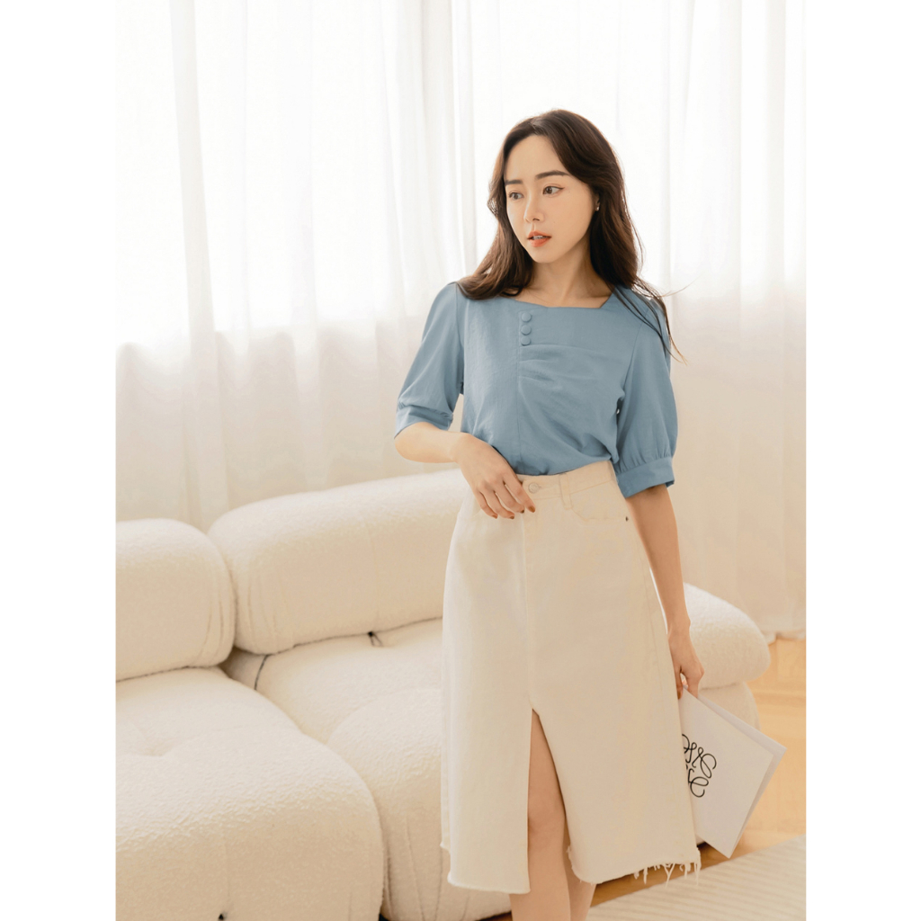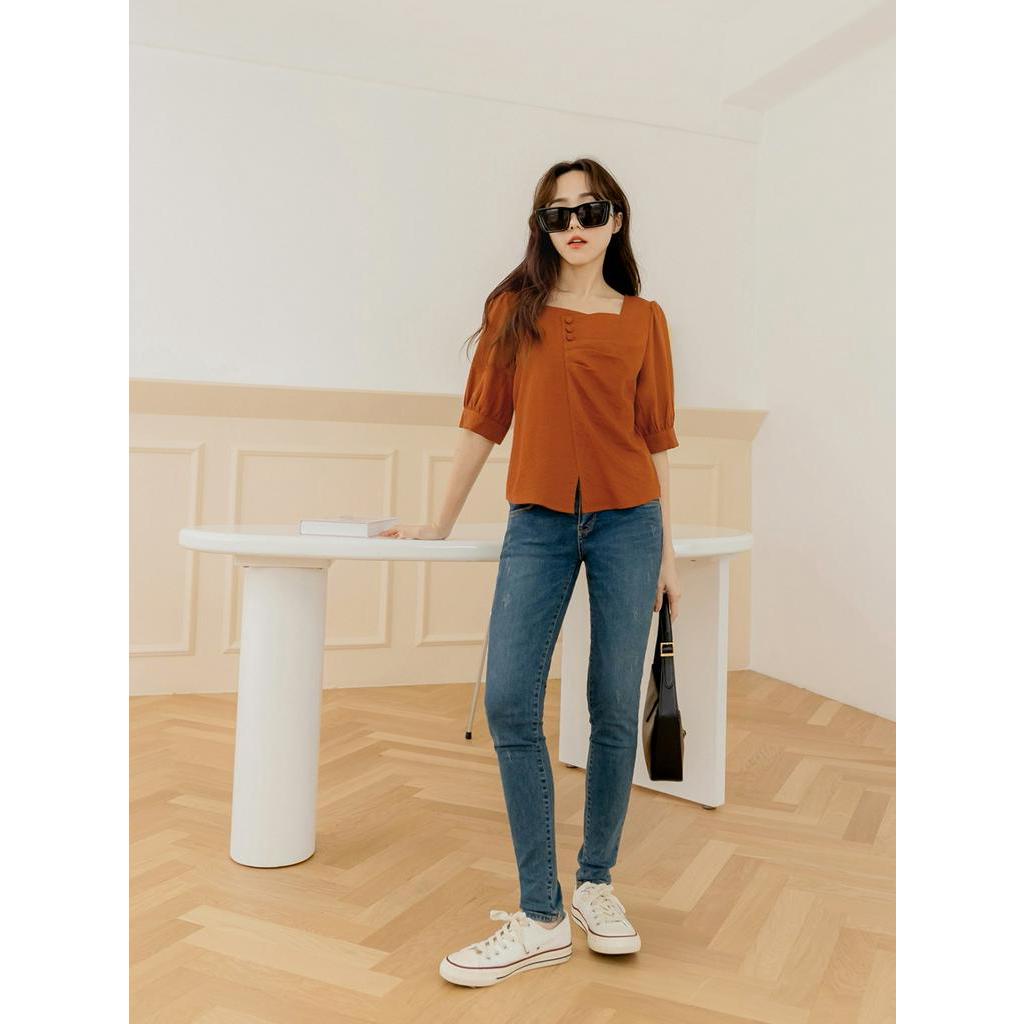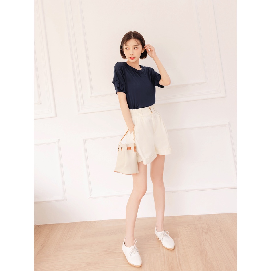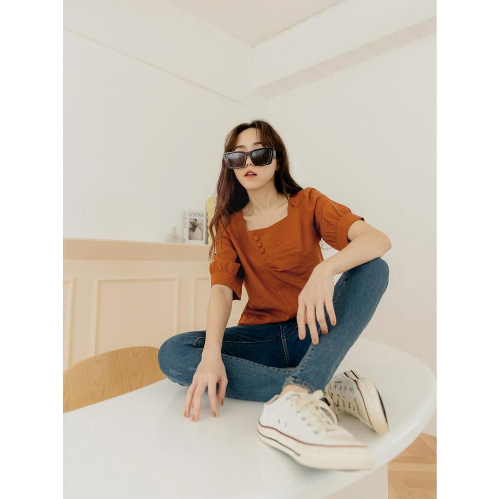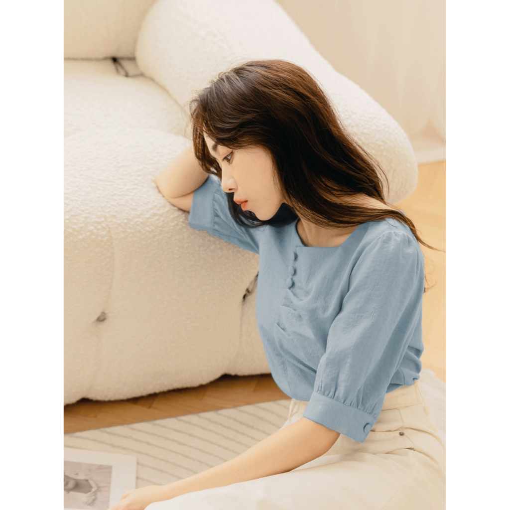 OB嚴選 小V臉.桃心領排釦抓皺七分拋袖短版上衣 《AB18176》大尺碼/女裝/現貨霧藍,2L|褐,L|褐,XL|褐,2L|褐,3L|霧藍,M|霧藍,L|霧藍,XL|褐,M|霧藍,S|霧藍,3L|褐,ST-shirtsOB嚴選官方旗艦店