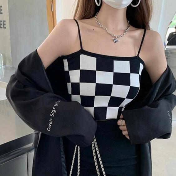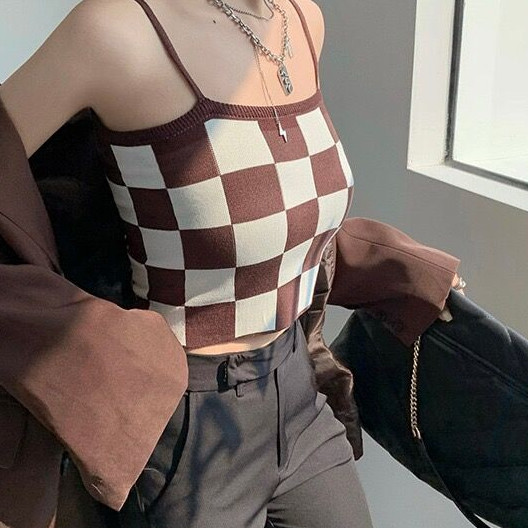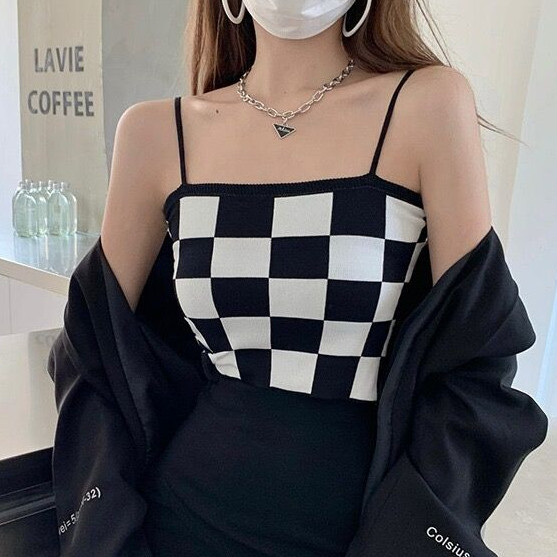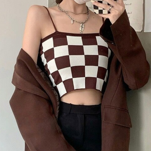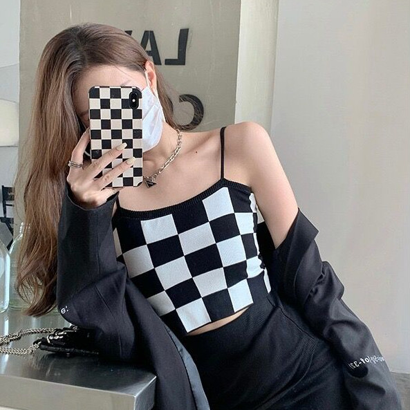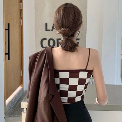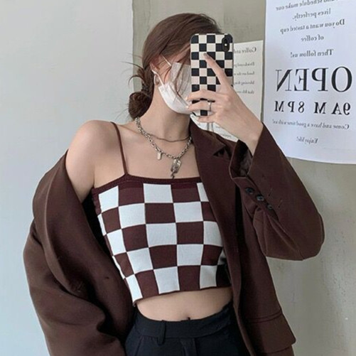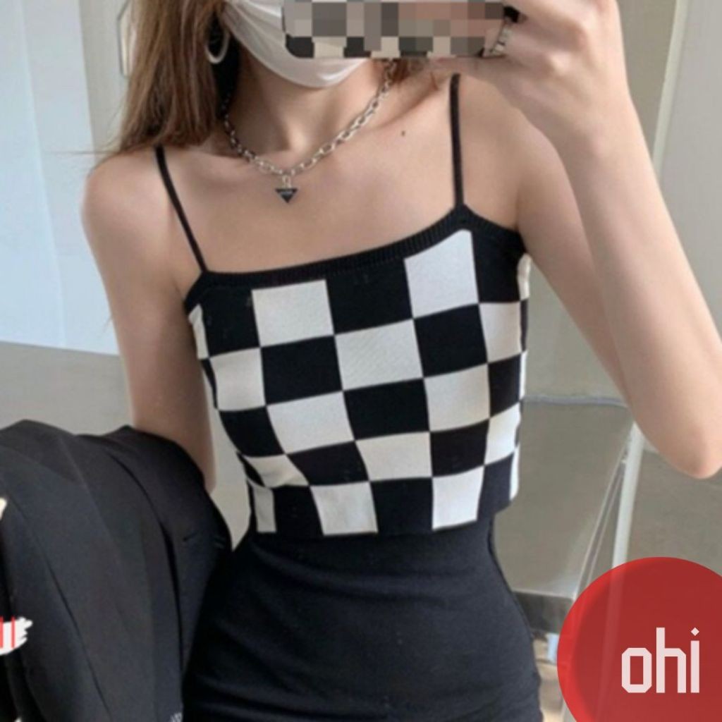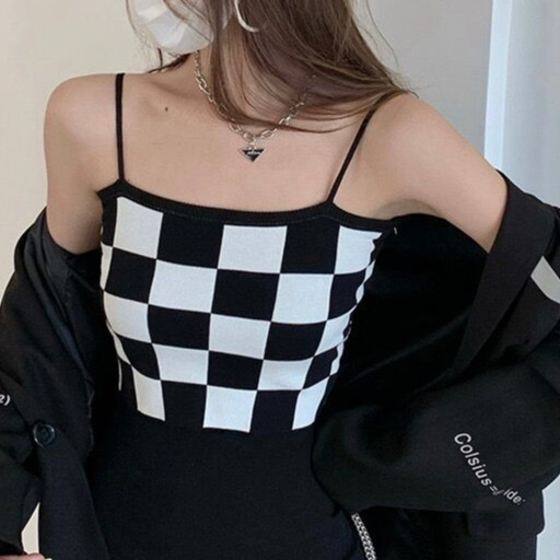 【ohi】純欲風旗盤格細肩帶背心 內衣 黑白格 小可愛 免穿內衣無袖背心女女背心短款背心GVH9001黑色,均碼|咖啡,均碼Tanks & CamisolesOHI衣著