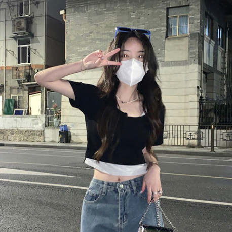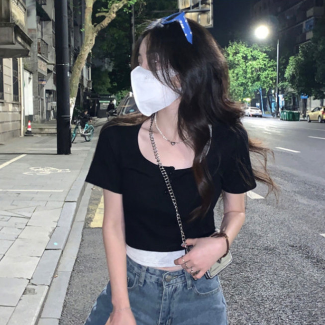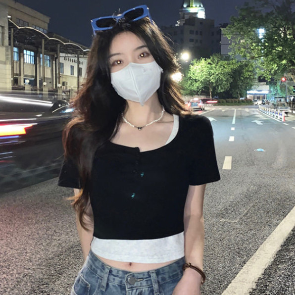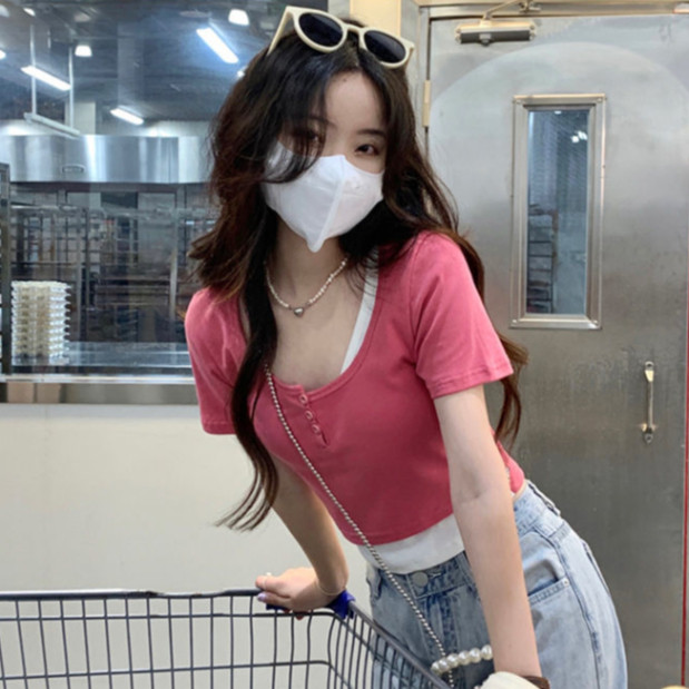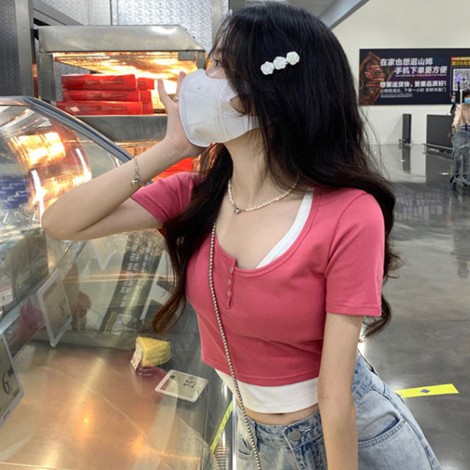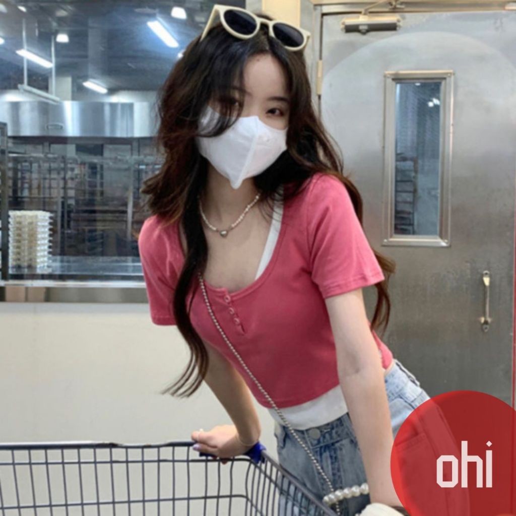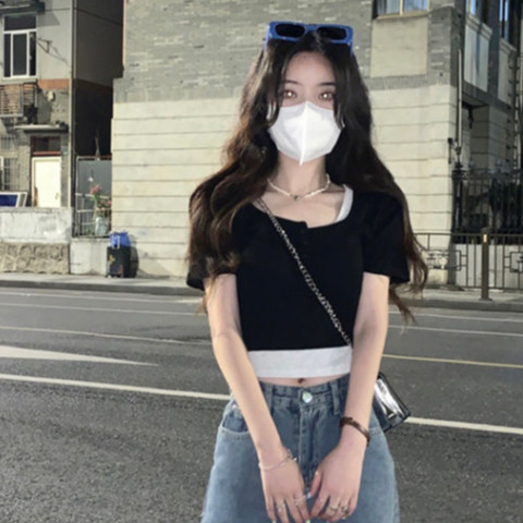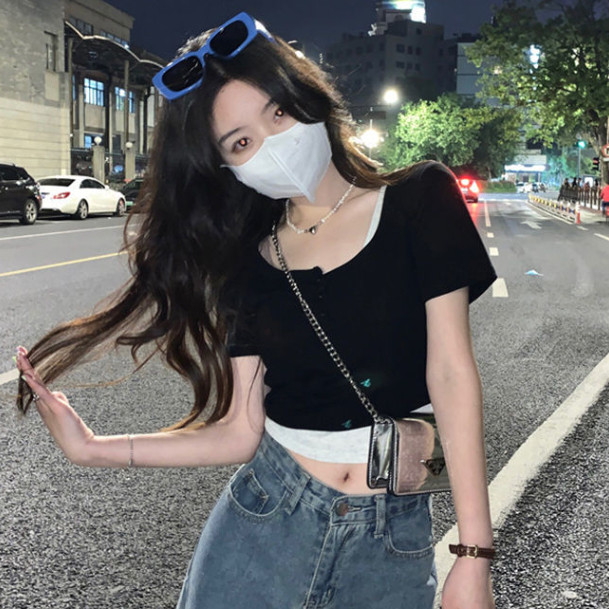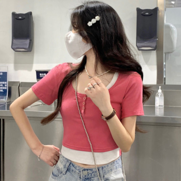 【ohi】短袖t恤女夏季顯瘦百搭小個子假兩件短款半袖上衣女 女生衣著 短版上衣 露臍上衣 短袖T恤 顯瘦GTM373黑色,XL|紅色,M|紅色,L|紅色,XL|黑色,M|黑色,LT-shirtsOHI衣著
