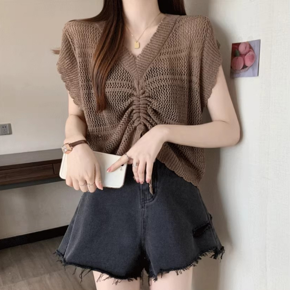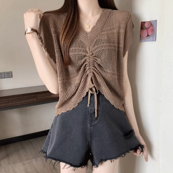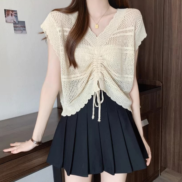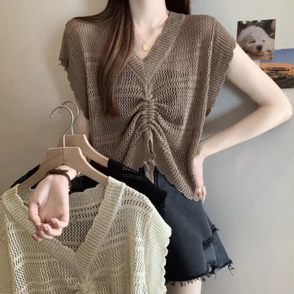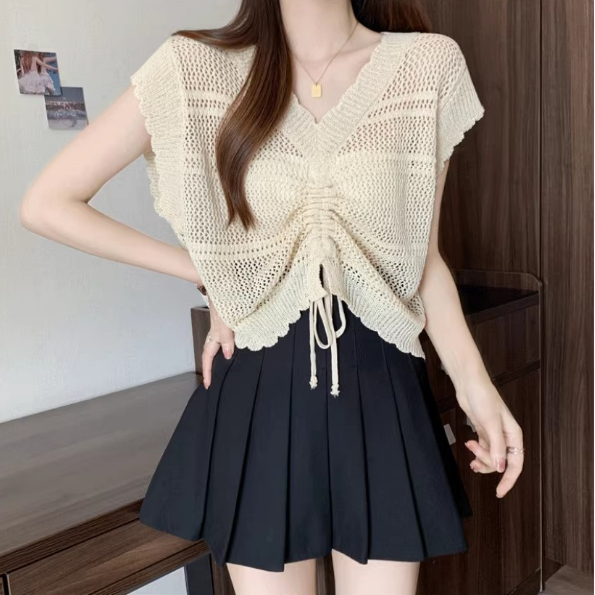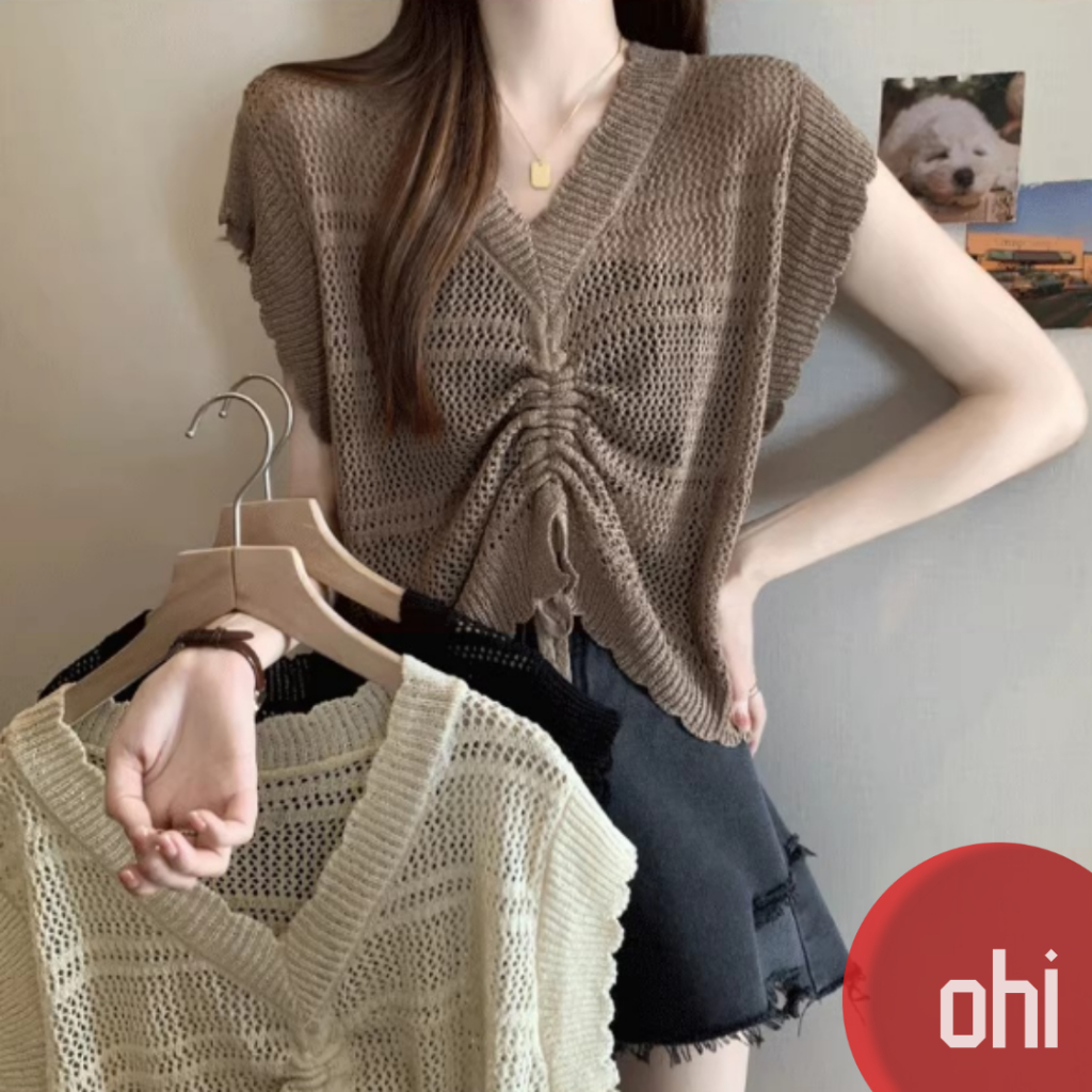 【ohi】V領皺褶抽繩背心 遮肚款皺褶小眾設計感顯瘦上衣 針織上衣T恤 夏天衣服 女裝 GWH6464