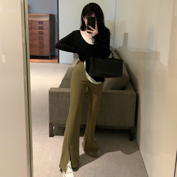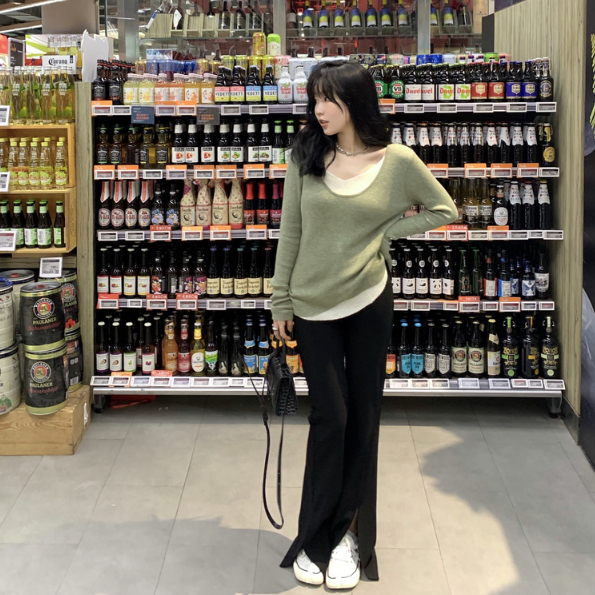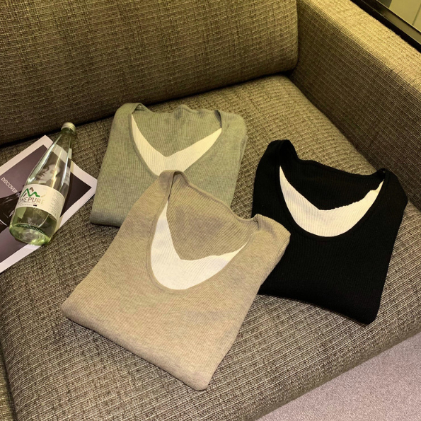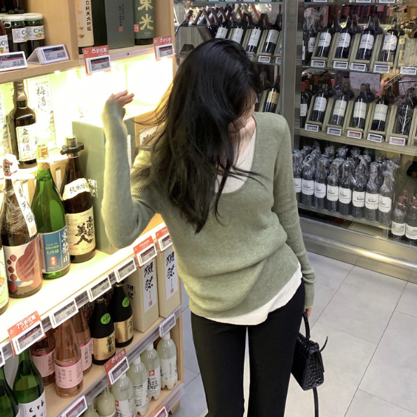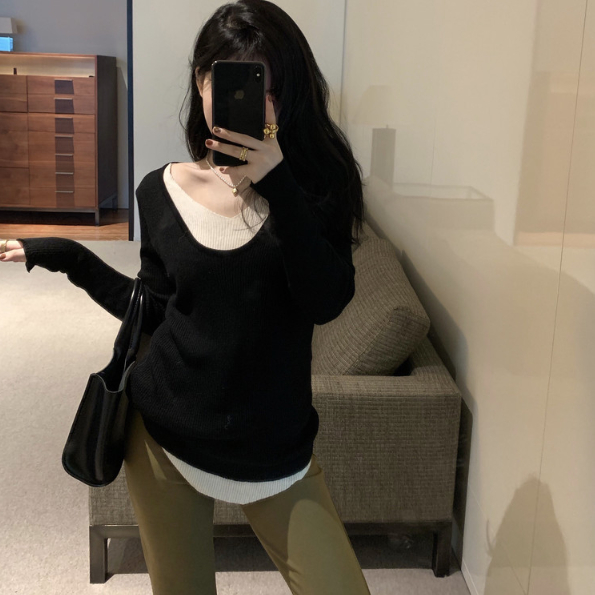 【ohi】V領不規則針織衫 假兩件休閒毛衣 小眾上衣 休閒百搭 上衣 針織衫 秋款女裝 GWD3930黑色,F-(均碼40-55KG可穿)|綠色,F-(均碼40-55KG可穿)|咖啡色,F-(均碼40-55KG可穿)OHI衣著