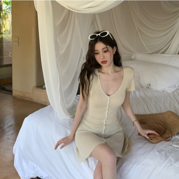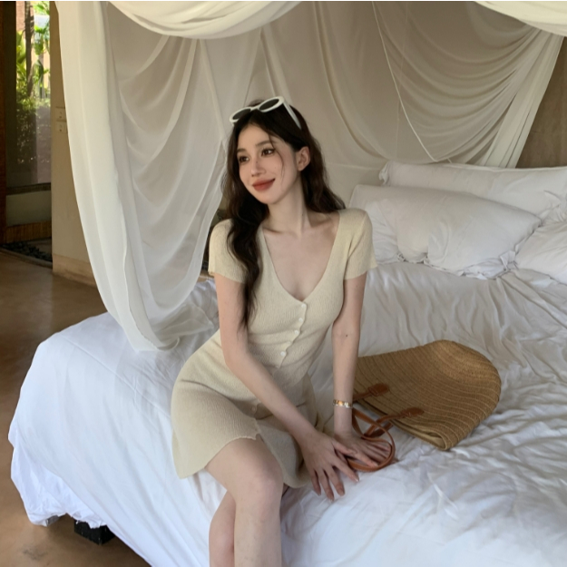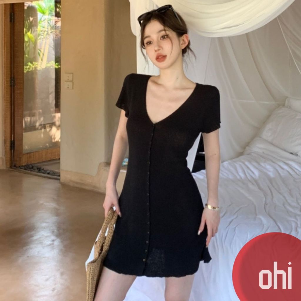 【ohi】純欲簡約V領針織連身裙 修身收腰A字裙 顯瘦連身裙 連身裙 短裙 裙子 洋裝 連衣裙 女裝 GKD5921杏色,F碼(40-65KG可穿)|黑色,F碼(40-65KG可穿)OHI衣著