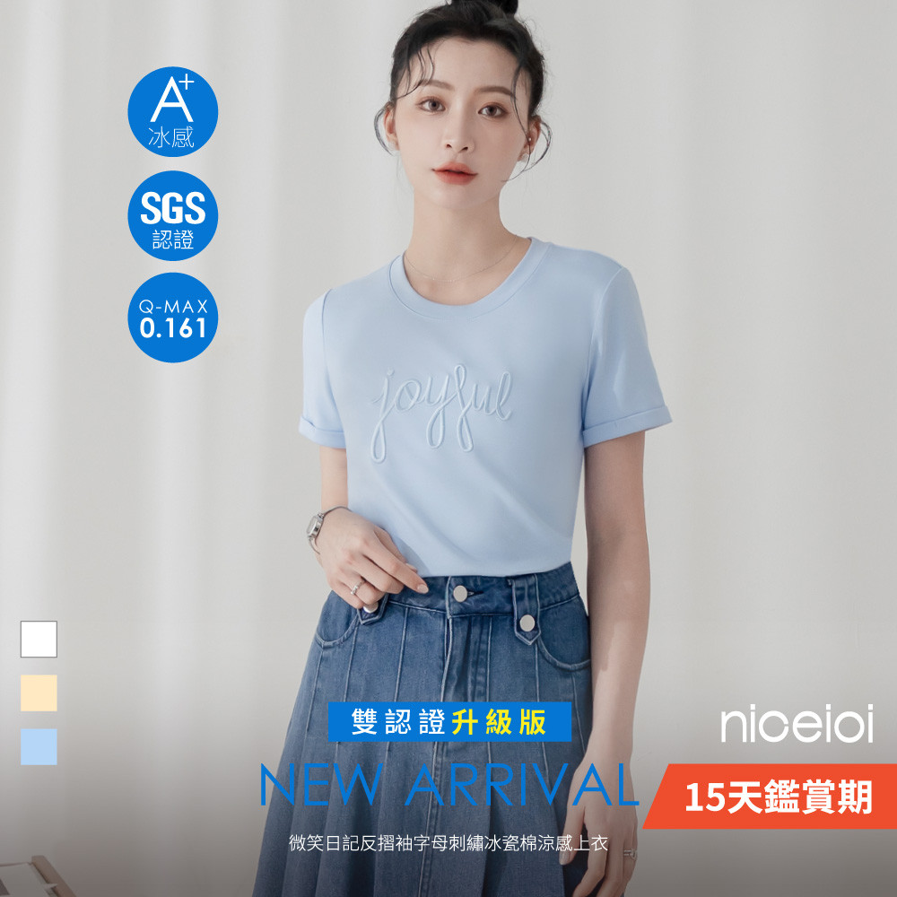 niceioi 涼感上衣 短袖 冰瓷棉上衣 淺藍色 [微笑日記反摺袖字母刺繡冰瓷棉涼感上衣] SGS認證 女裝涼感上衣-白,S|涼感上衣-白,L|涼感上衣-淺黃,S|涼感上衣-淺黃,M|涼感上衣-淺黃,XL|涼感上衣-淺藍,S|涼感上衣-白,M|涼感上衣-白,XL|涼感上衣-淺黃,L|涼感上衣-淺藍,M|涼感上衣-淺藍,L|涼感上衣-淺藍,XLT-shirtsniceioi 官方旗艦店