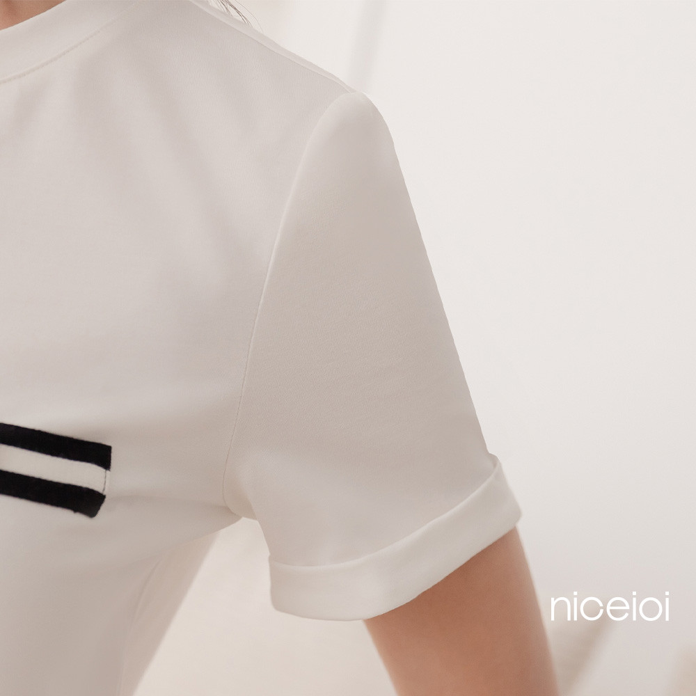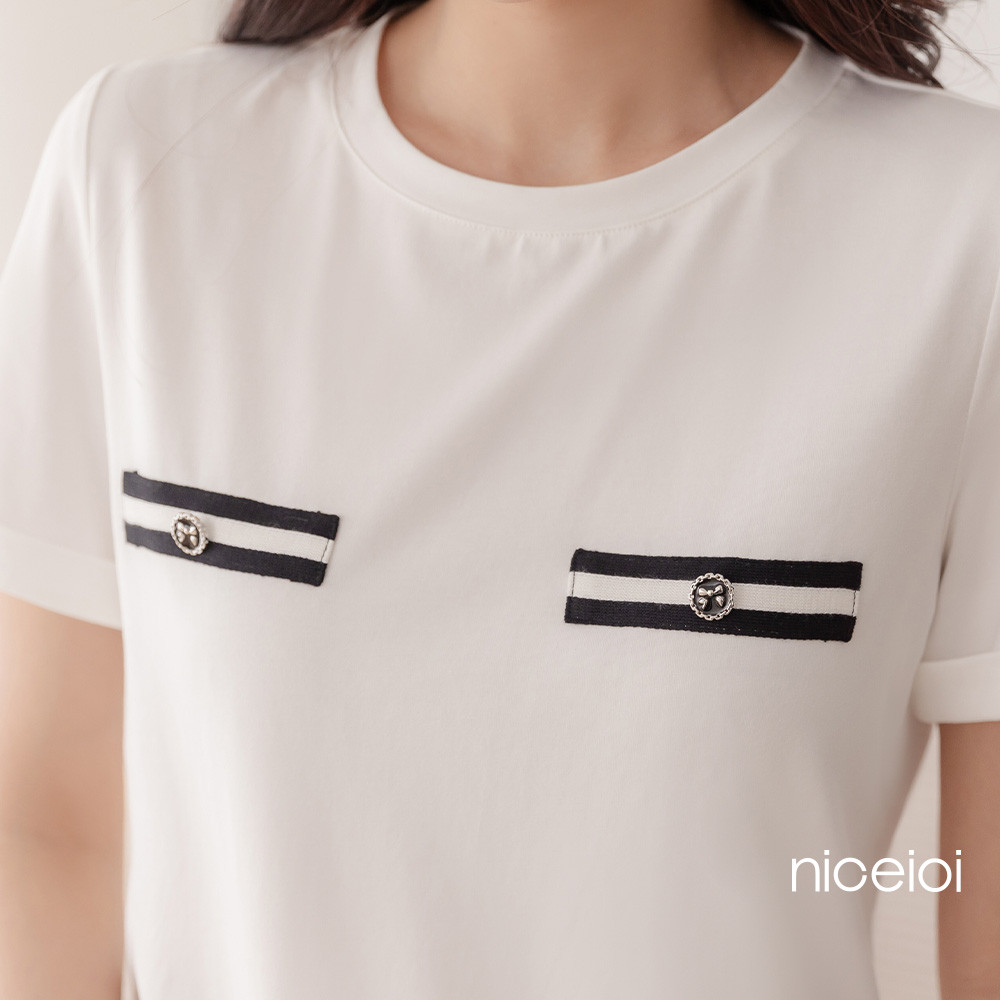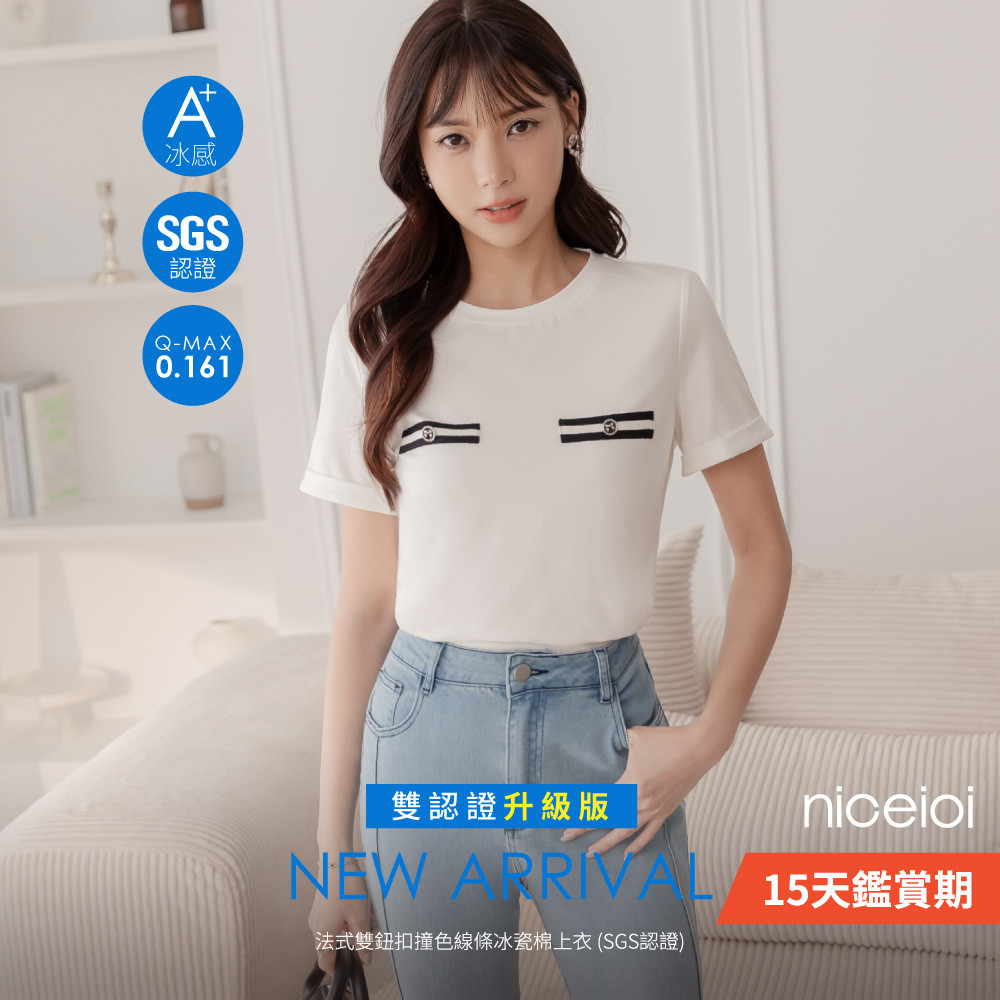 niceioi 涼感上衣 短袖 法式上衣 白色[法式雙鈕扣撞色線條冰瓷棉上衣] (SGS認證) 涼感t恤 女裝涼感上衣-白,S|涼感上衣-白,M|涼感上衣-白,L|涼感上衣-白,XLT-shirtsniceioi 官方旗艦店