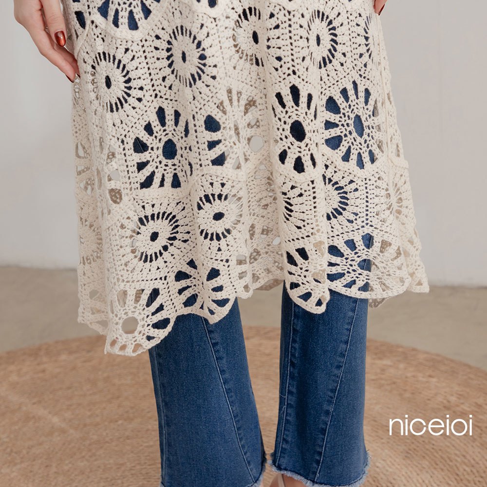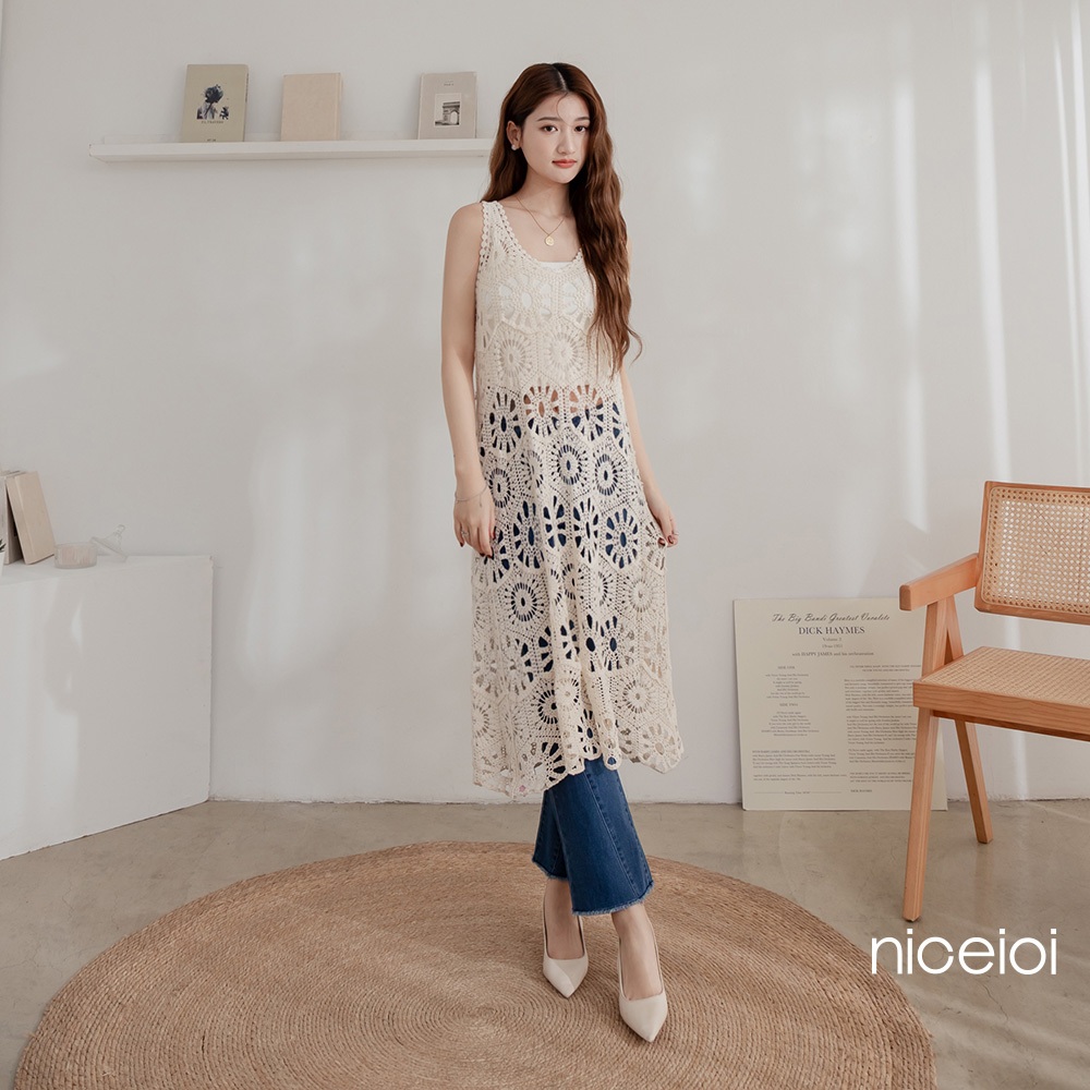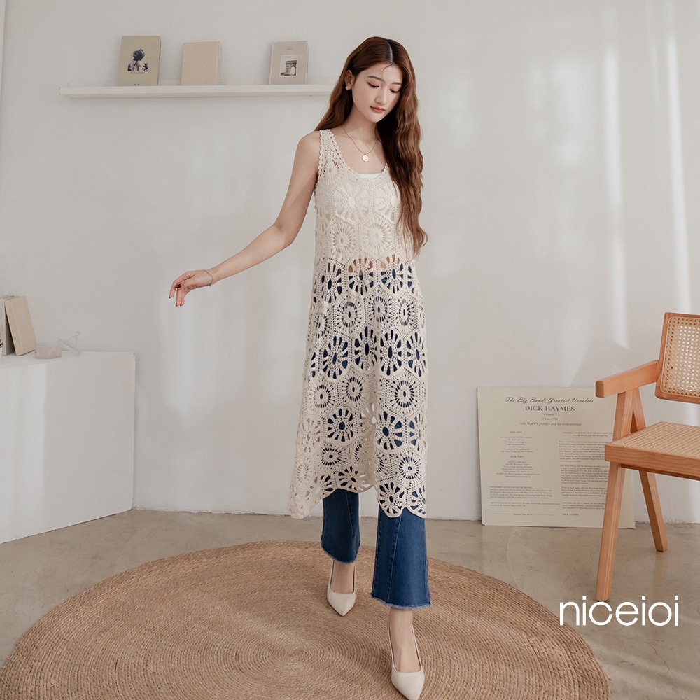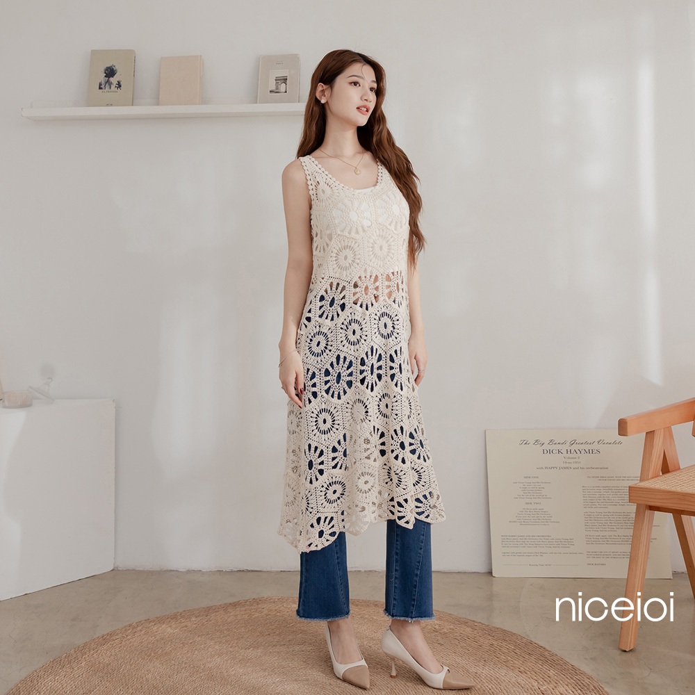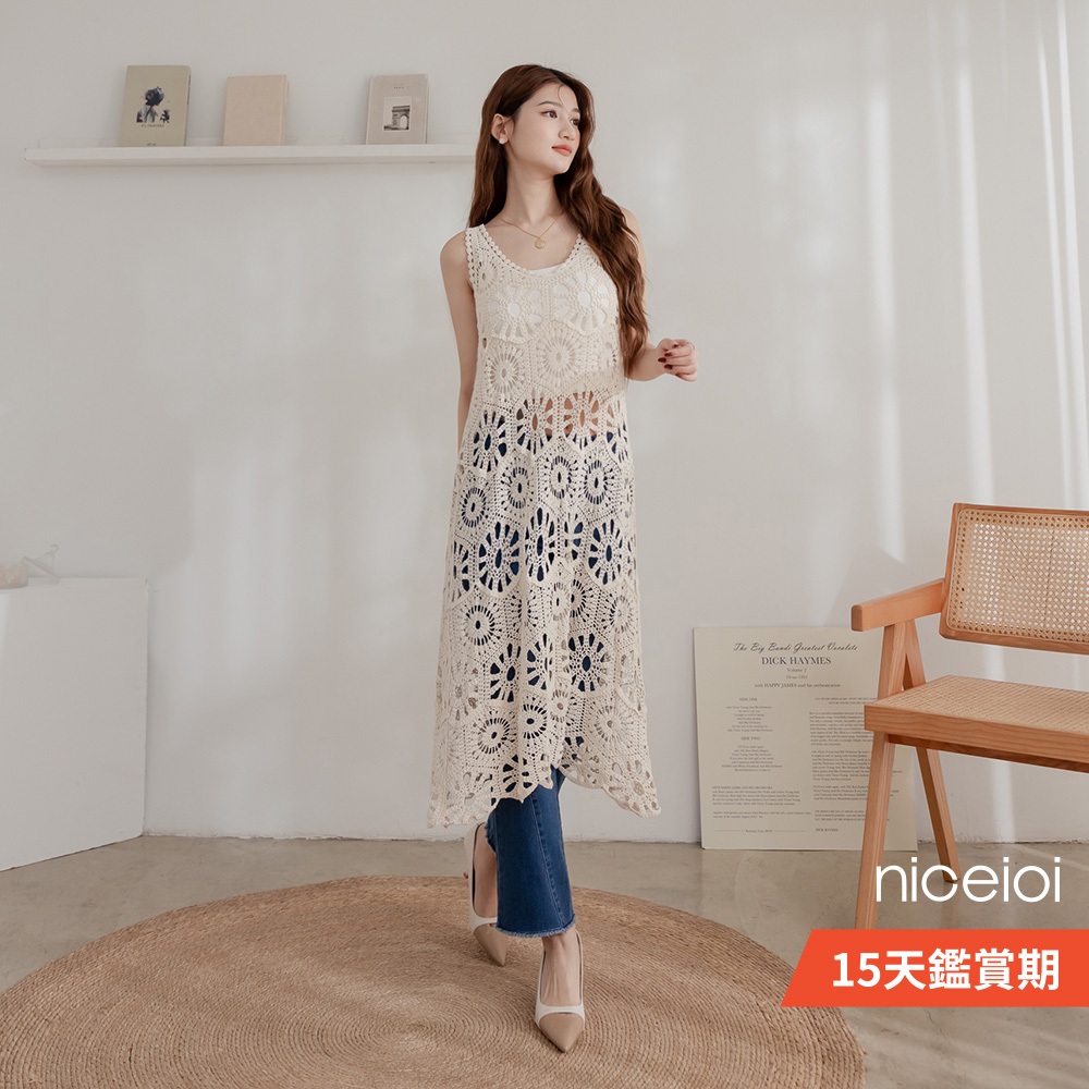niceioi 長洋裝 洋裝 碎花洋裝 米色 罩衫 [東南亞風無袖鏤空雕花外罩洋裝] 女裝長洋裝-米,Fniceioi 官方旗艦店
