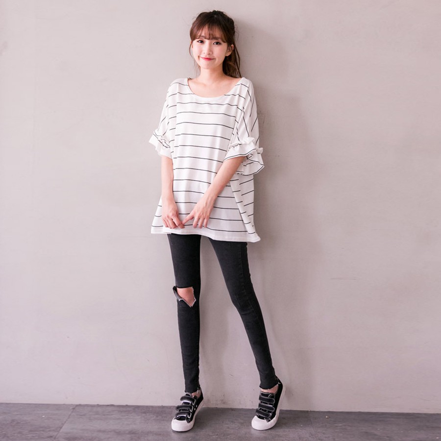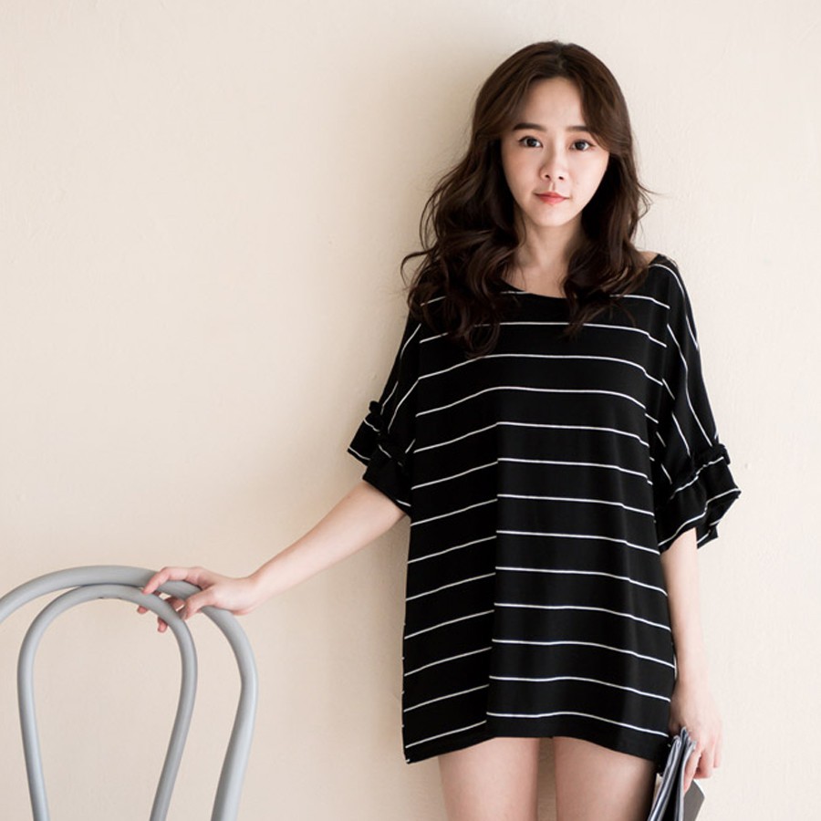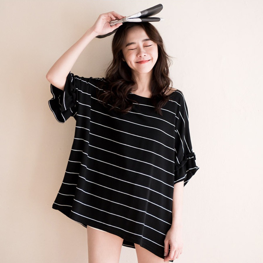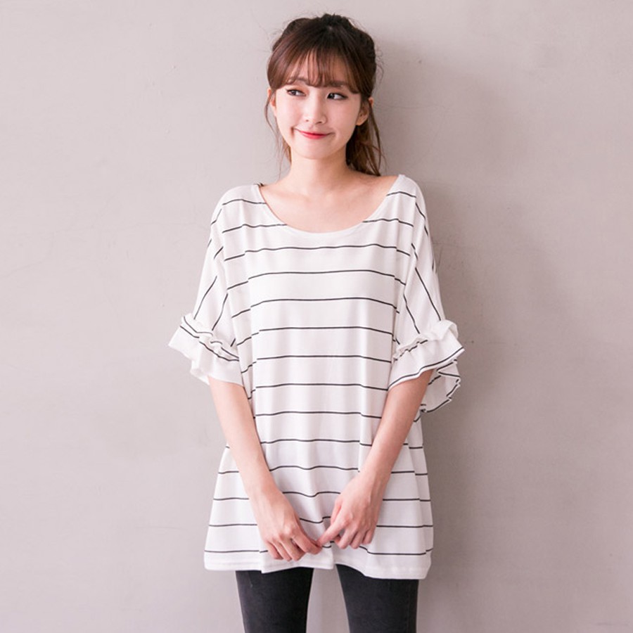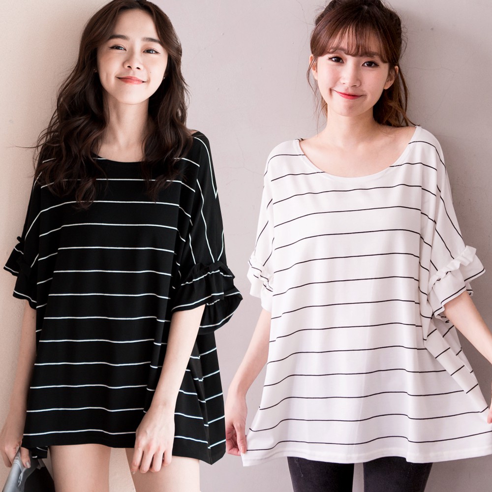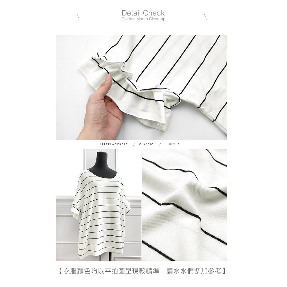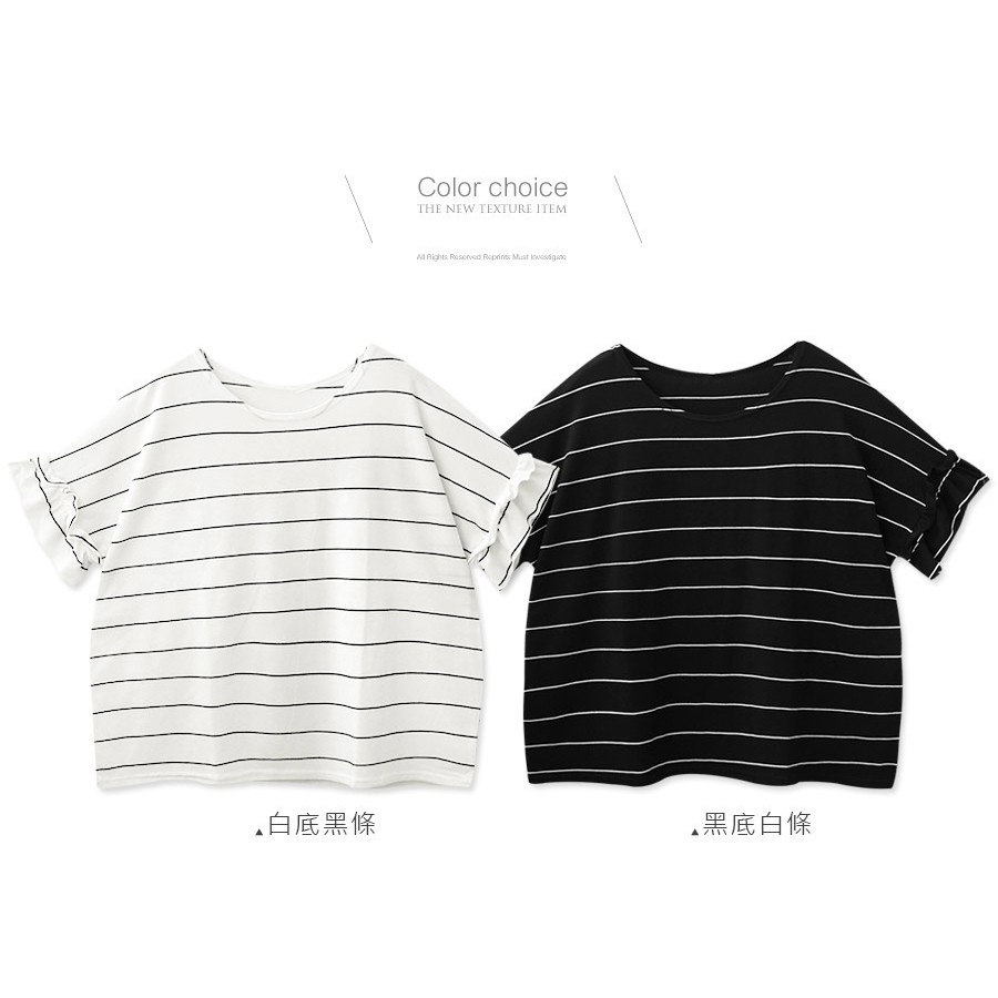 MIUSTAR 正韓 橫條荷葉袖超寬版棉質上衣(共2色)0125 預購 【NL0177RE】白底黑條F|黑底白條FT-shirtsMIUSTAR