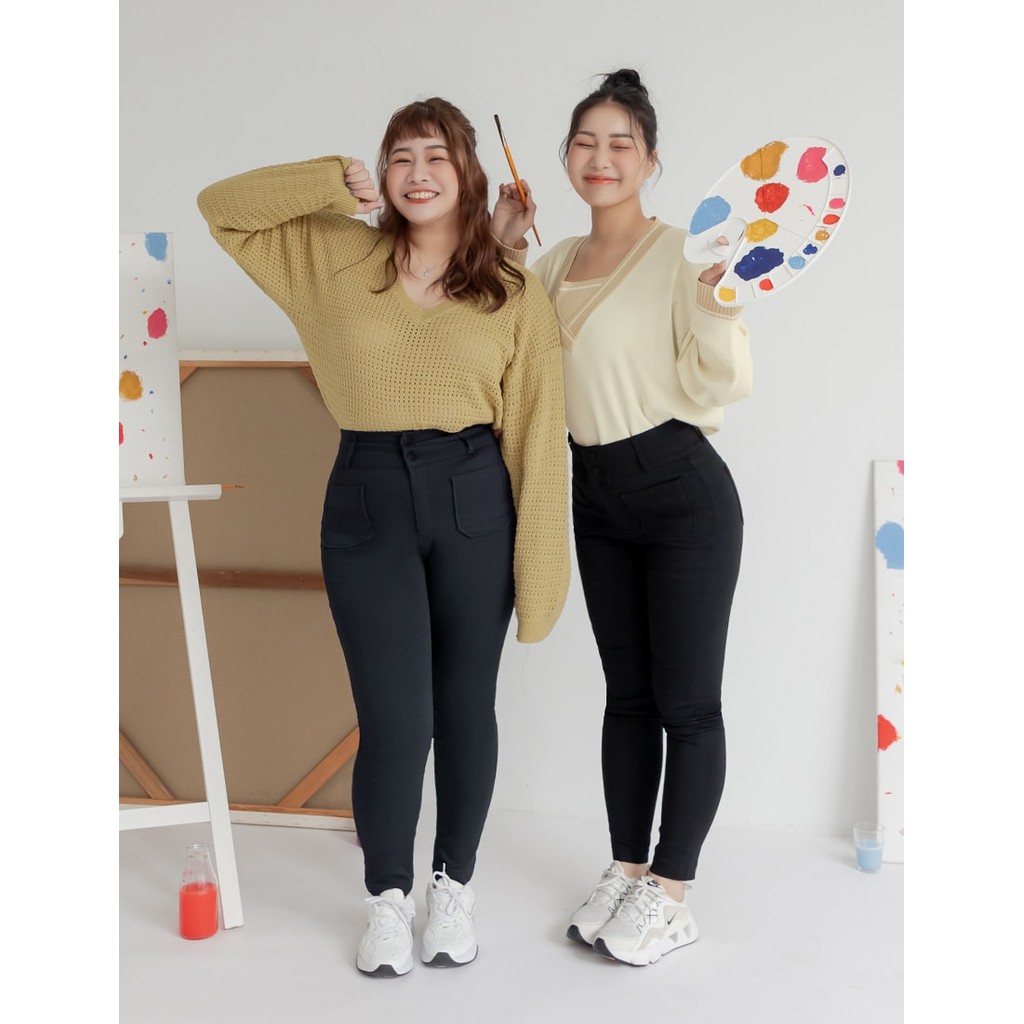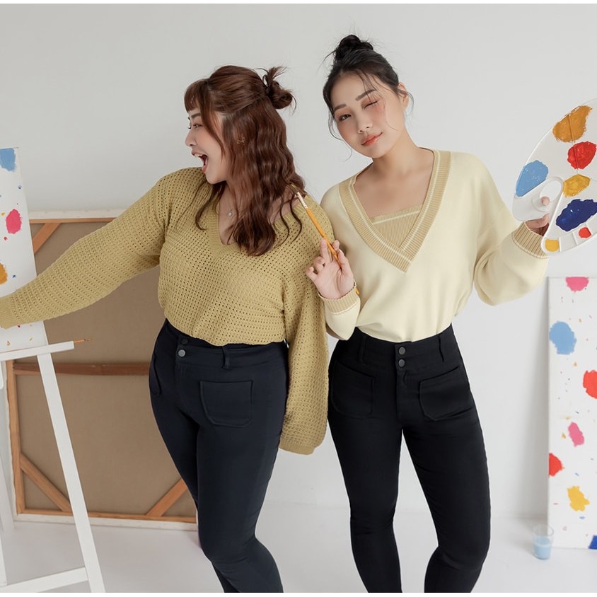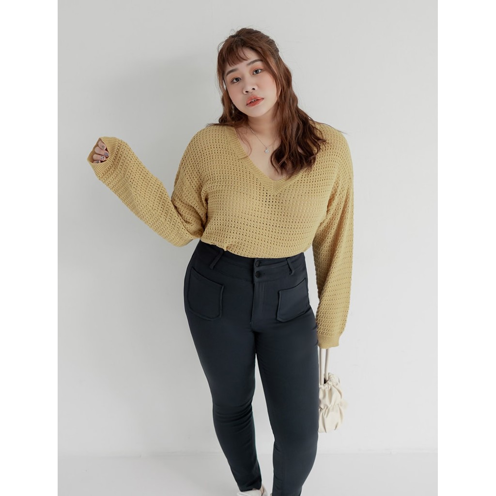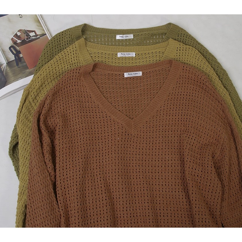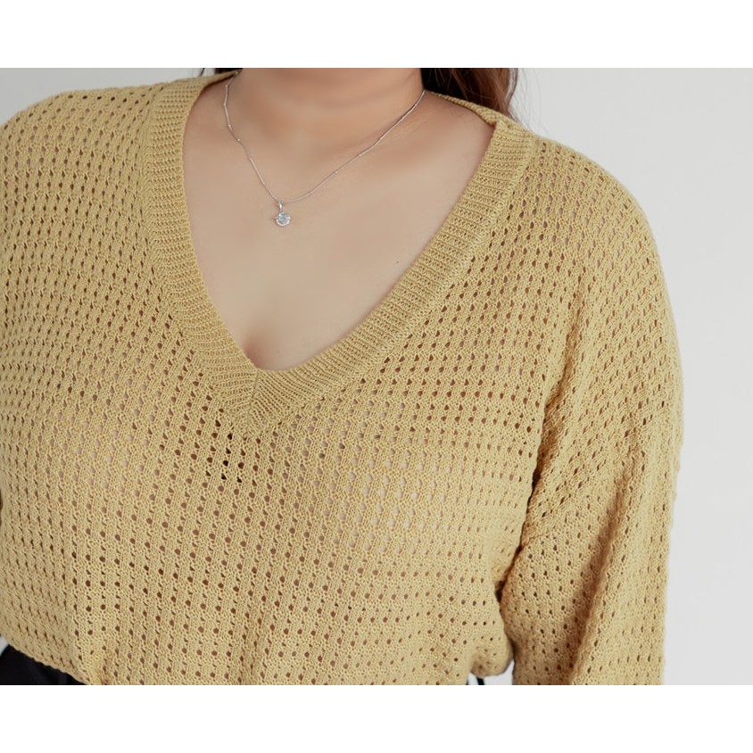 【PolyLulu】 慵懶歐蕾系V領鏤空針織長袖上衣 中大尺碼上衣 淺黃色XL|2XL|3XL|LPOLY LULU丨BEAUTY HAS NO SIZE 中大尺碼女裝