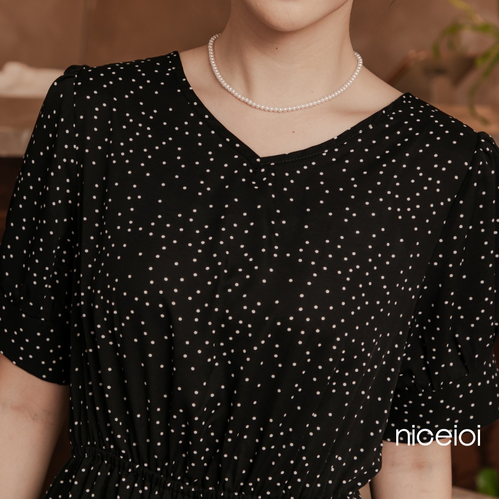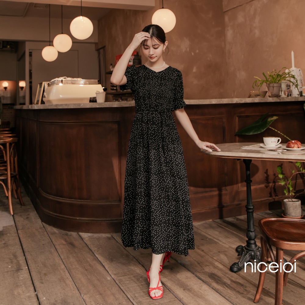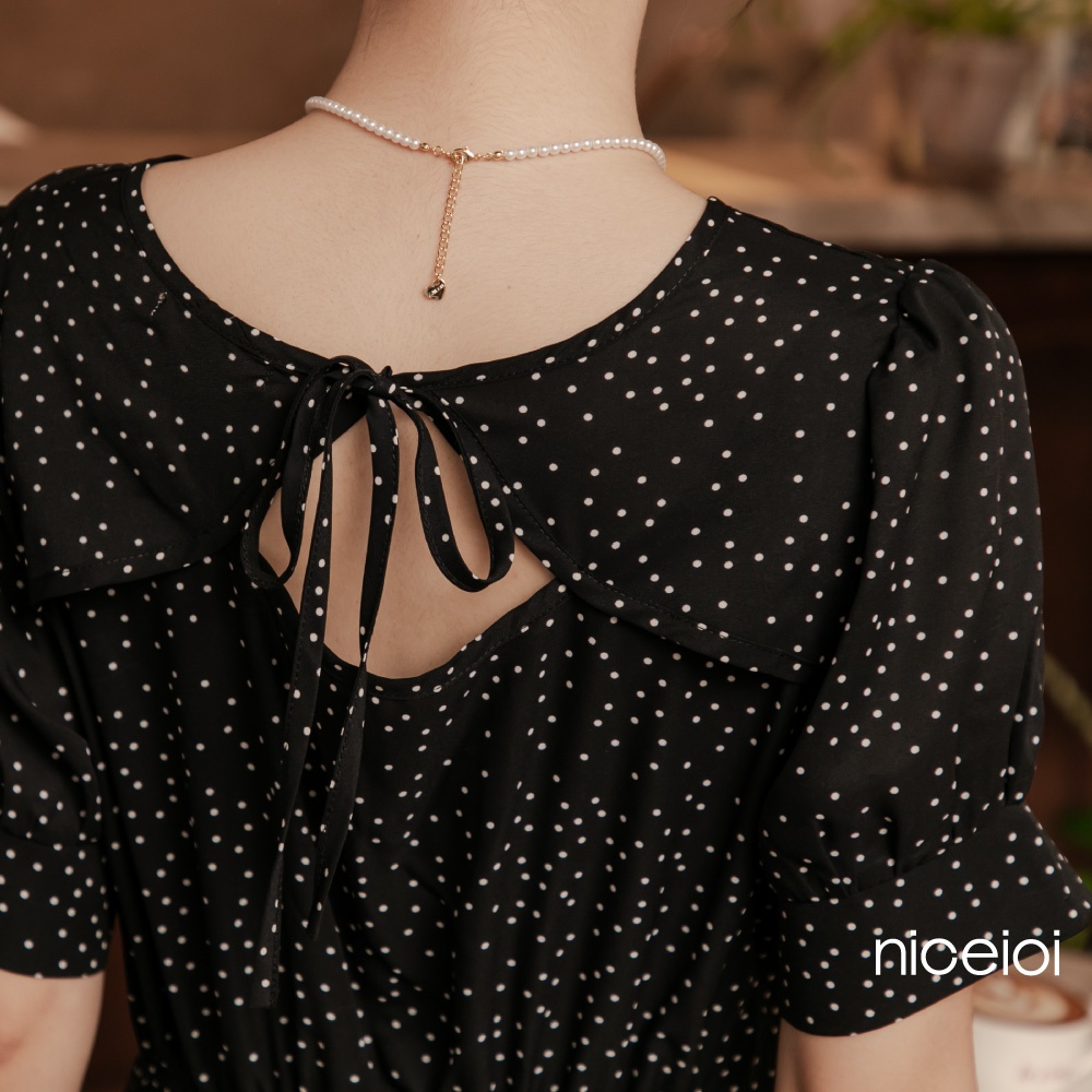 niceioi【特惠】收腰洋裝 長洋 鏤空洋裝 黑色 [復古點點後鏤空綁帶收腰洋裝] 公主袖洋裝 女裝
