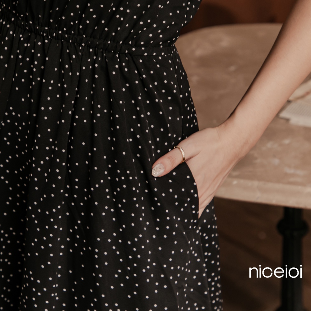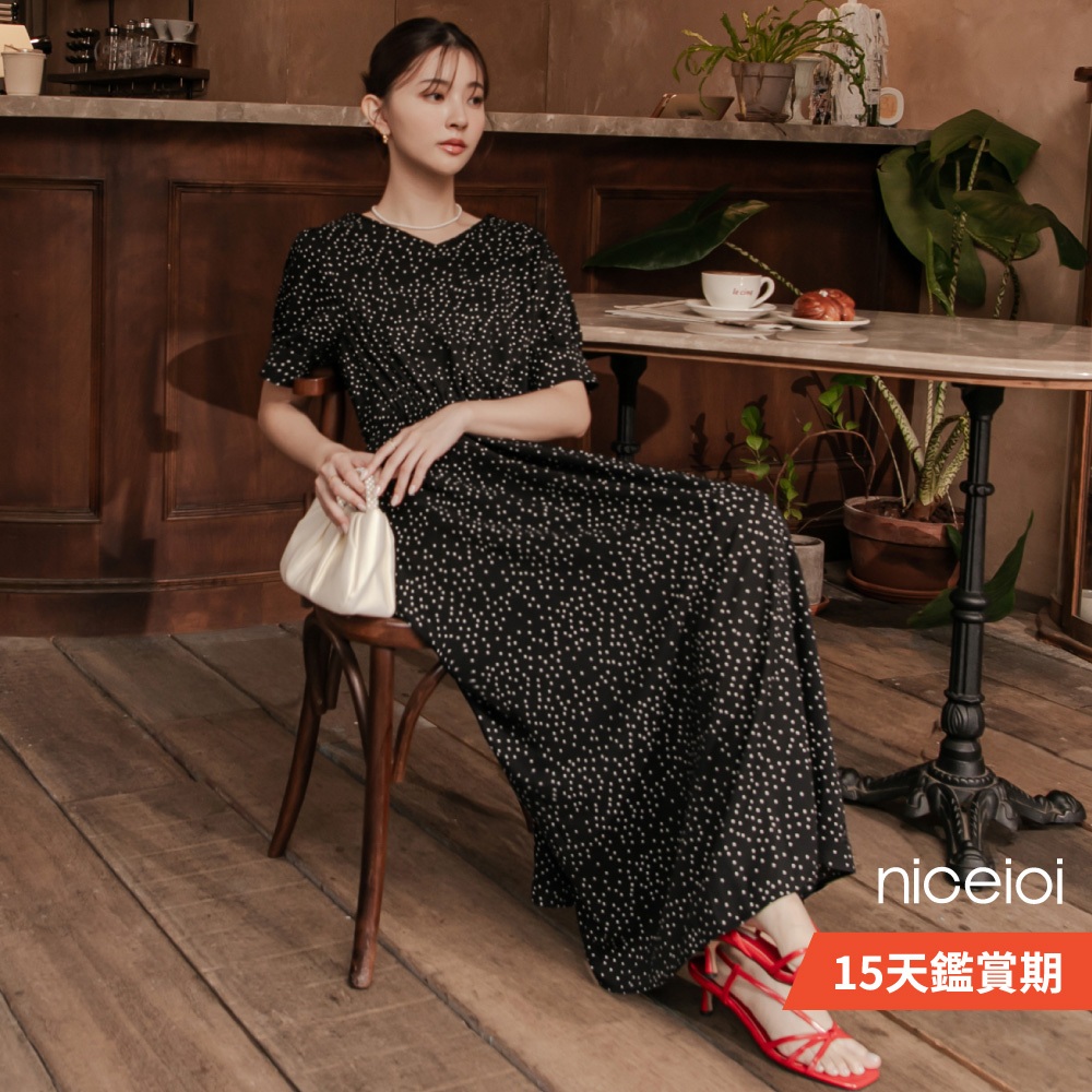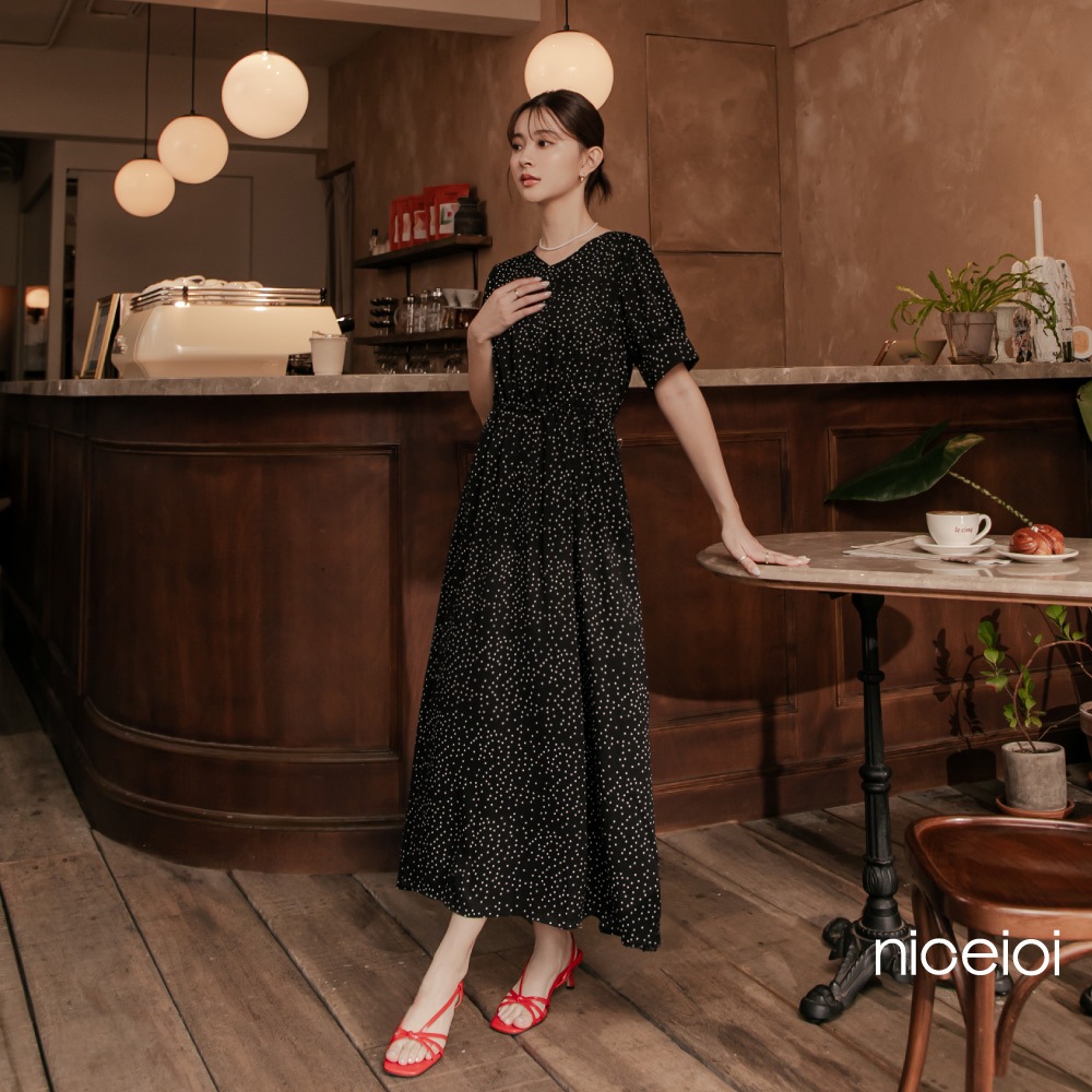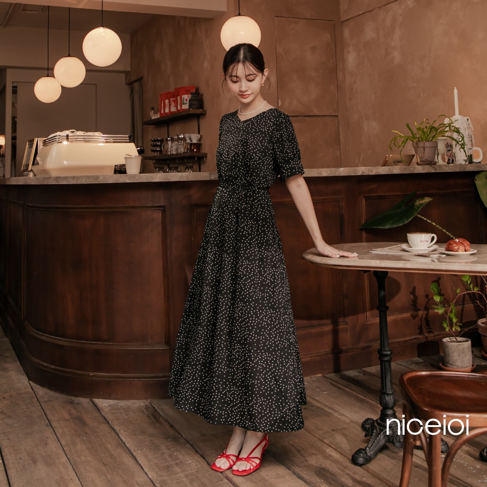 niceioi【特惠】收腰洋裝 長洋 鏤空洋裝 黑色 [復古點點後鏤空綁帶收腰洋裝] 公主袖洋裝 女裝