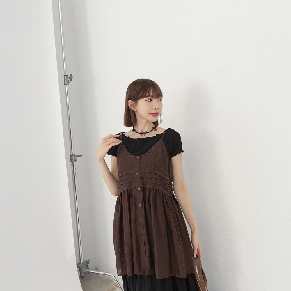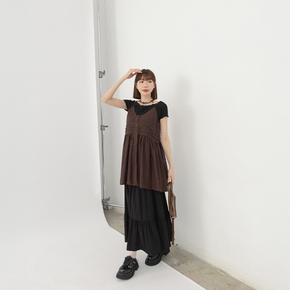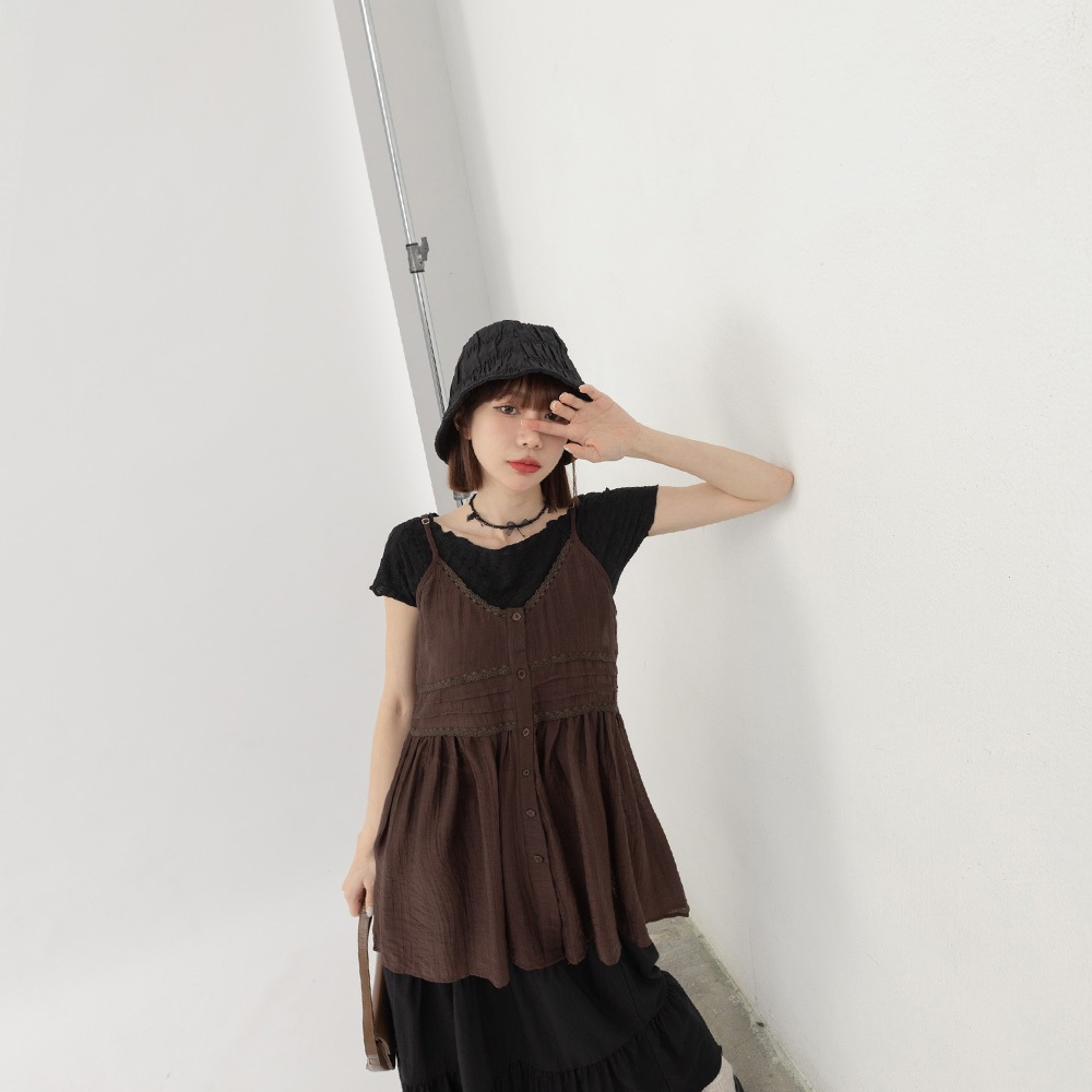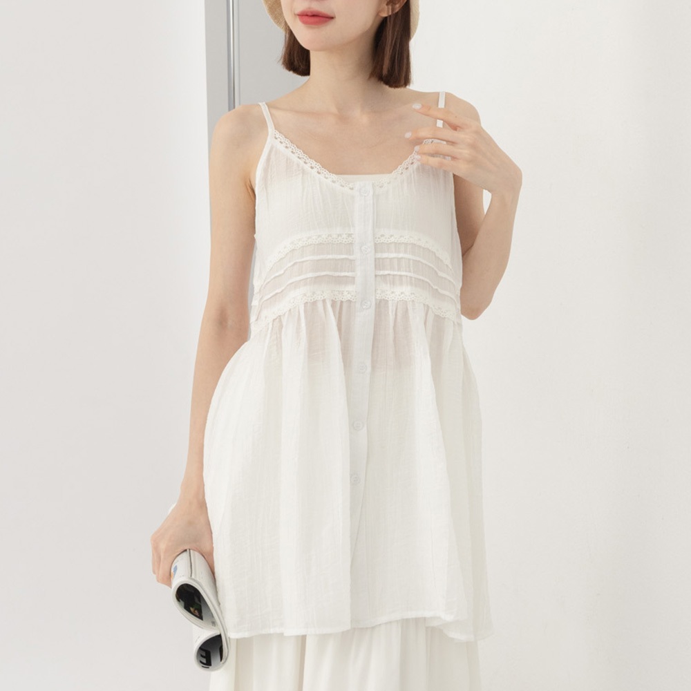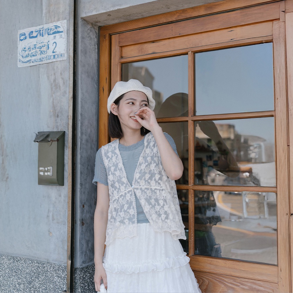 QUEENSHOP_ S 女裝 單釦蕾絲緹花傘擺罩衫背心 兩色售 現+預 【01099020】白|杏Tanks & CamisolesQUEENSHOP