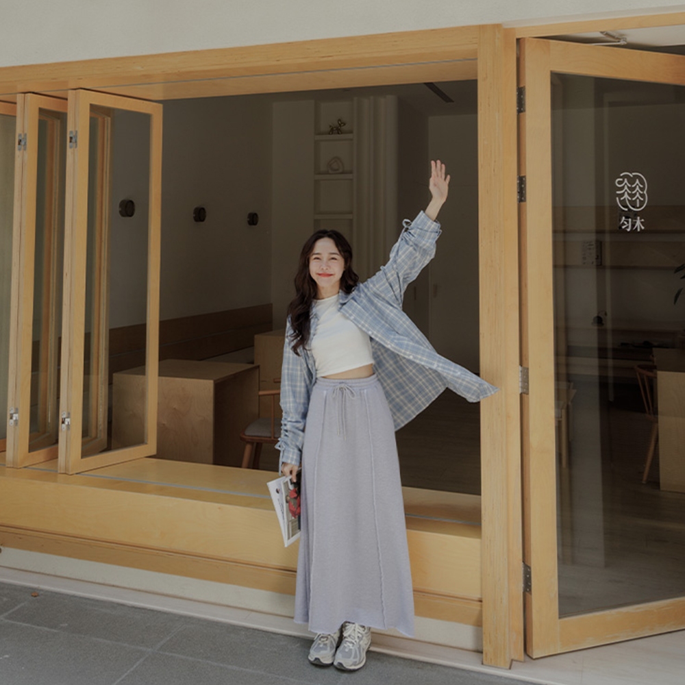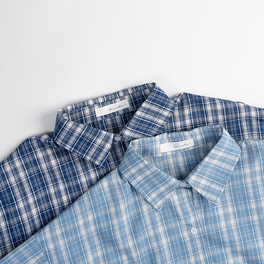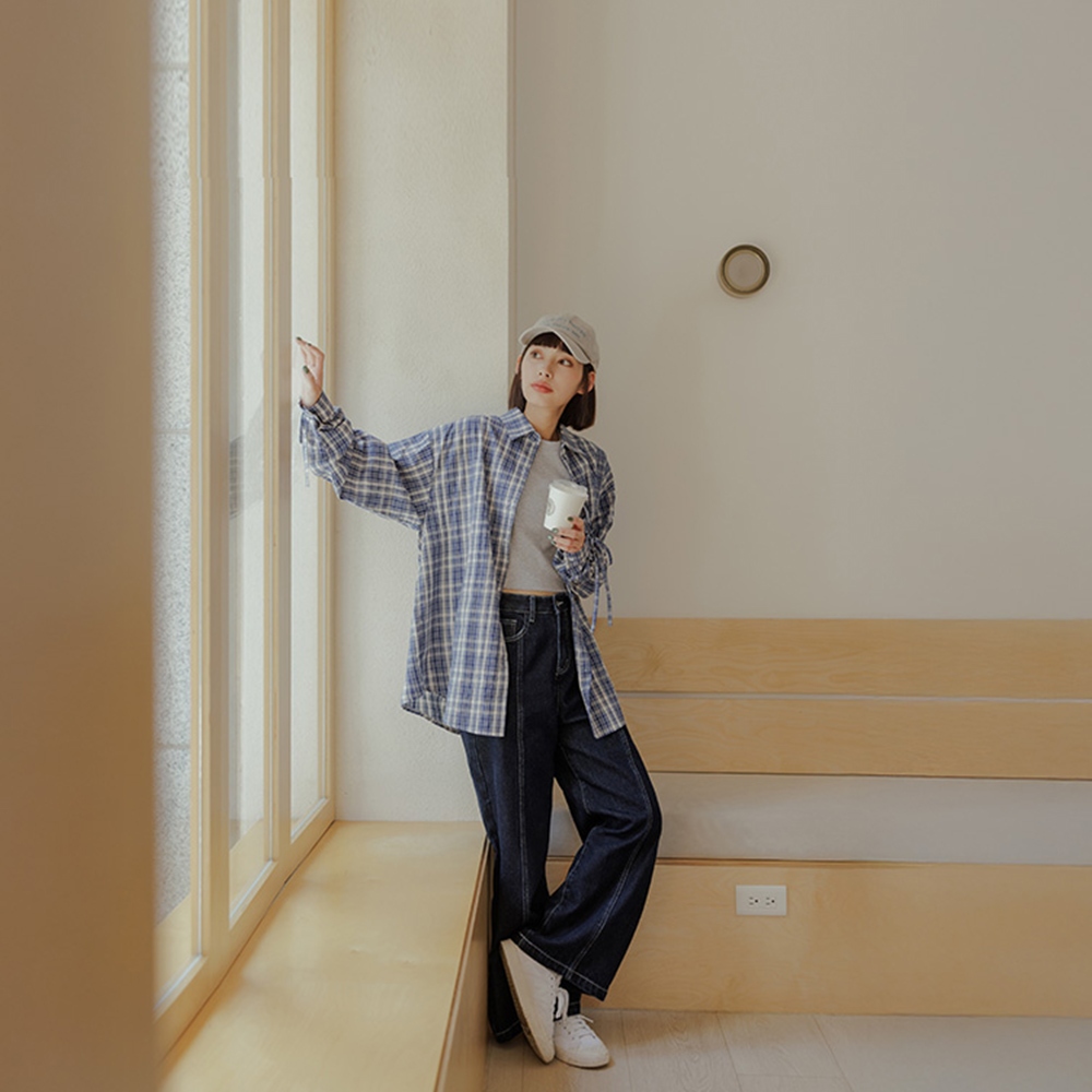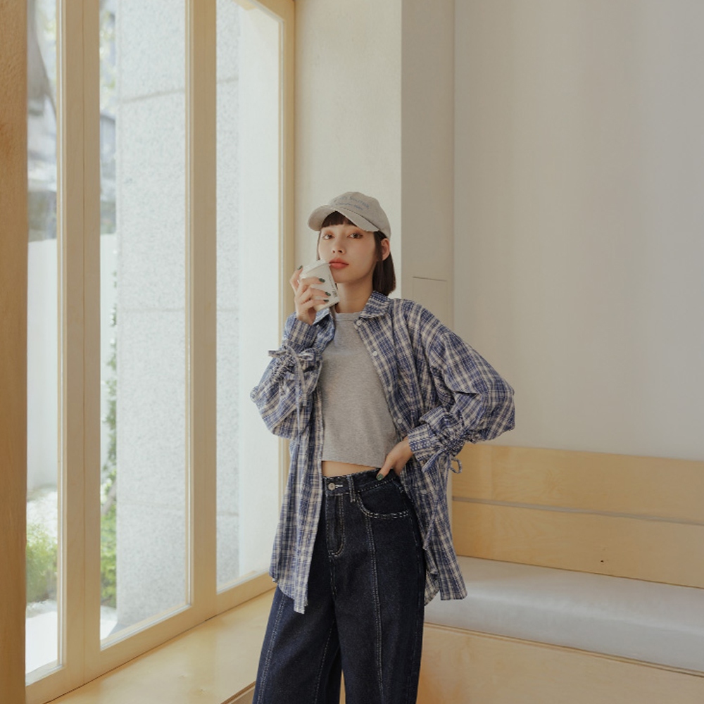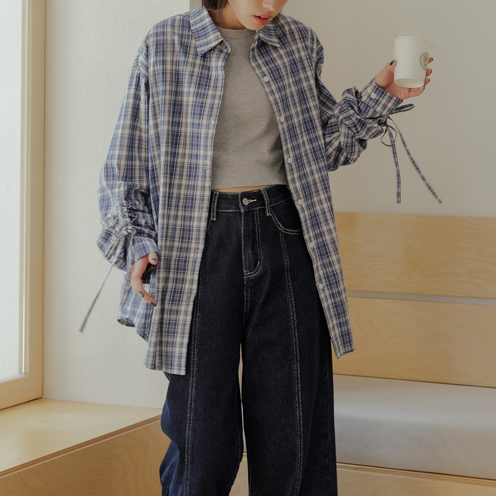 QUEENSHOP_ S 女裝 長袖 格紋袖抽繩綁帶設計寬版襯衫 兩色售 現+預 【01025579】藍|深藍Shirts & BlousesQUEENSHOP
