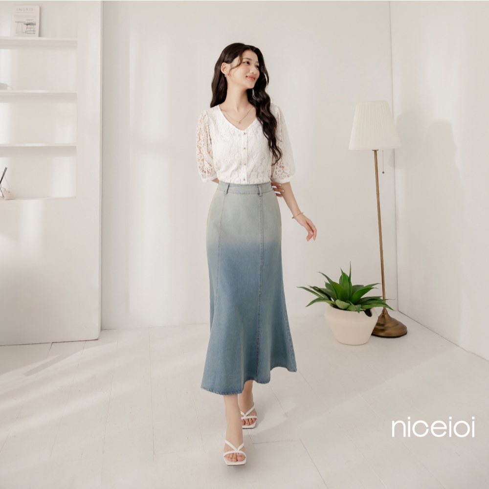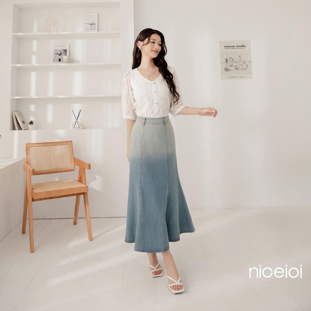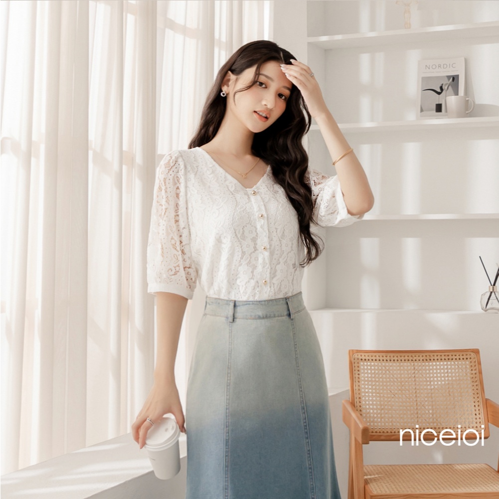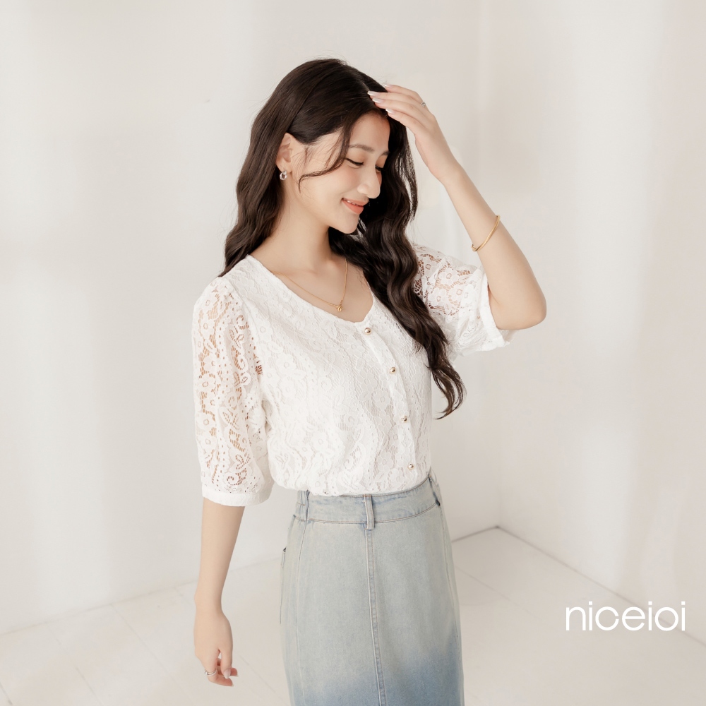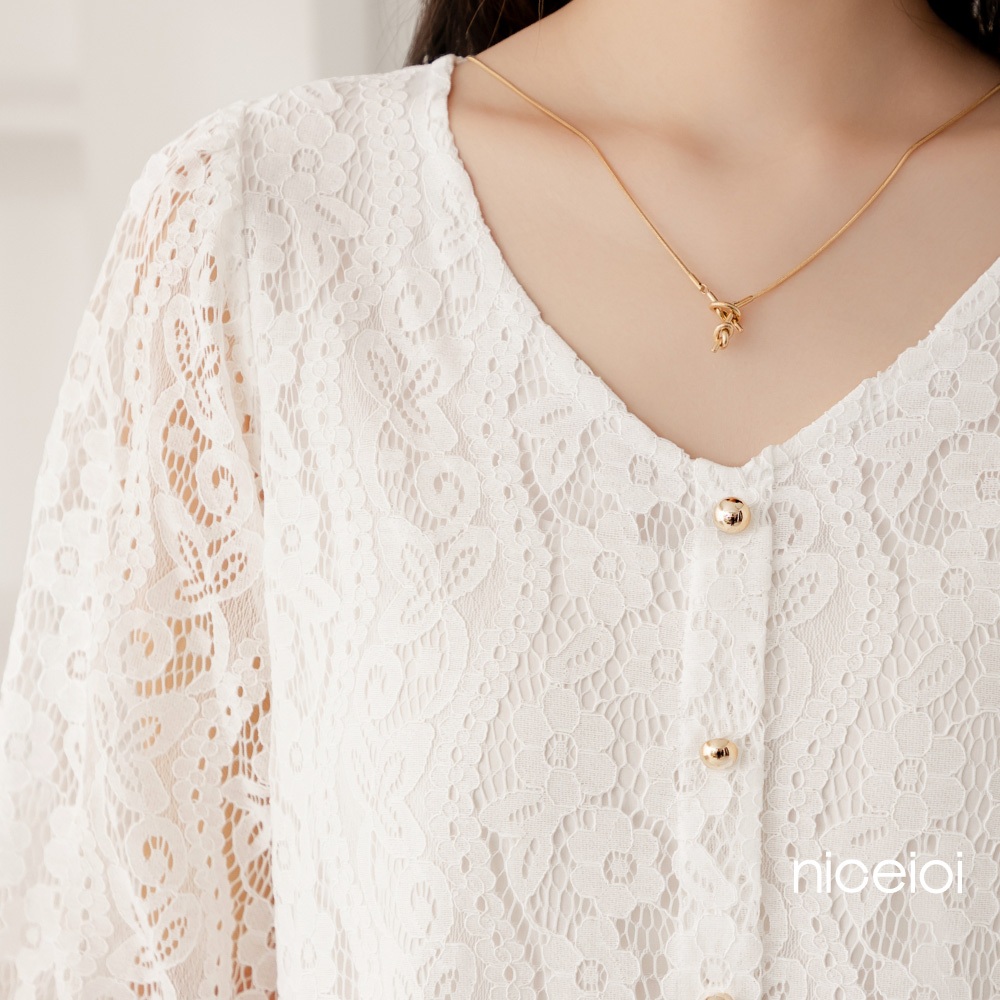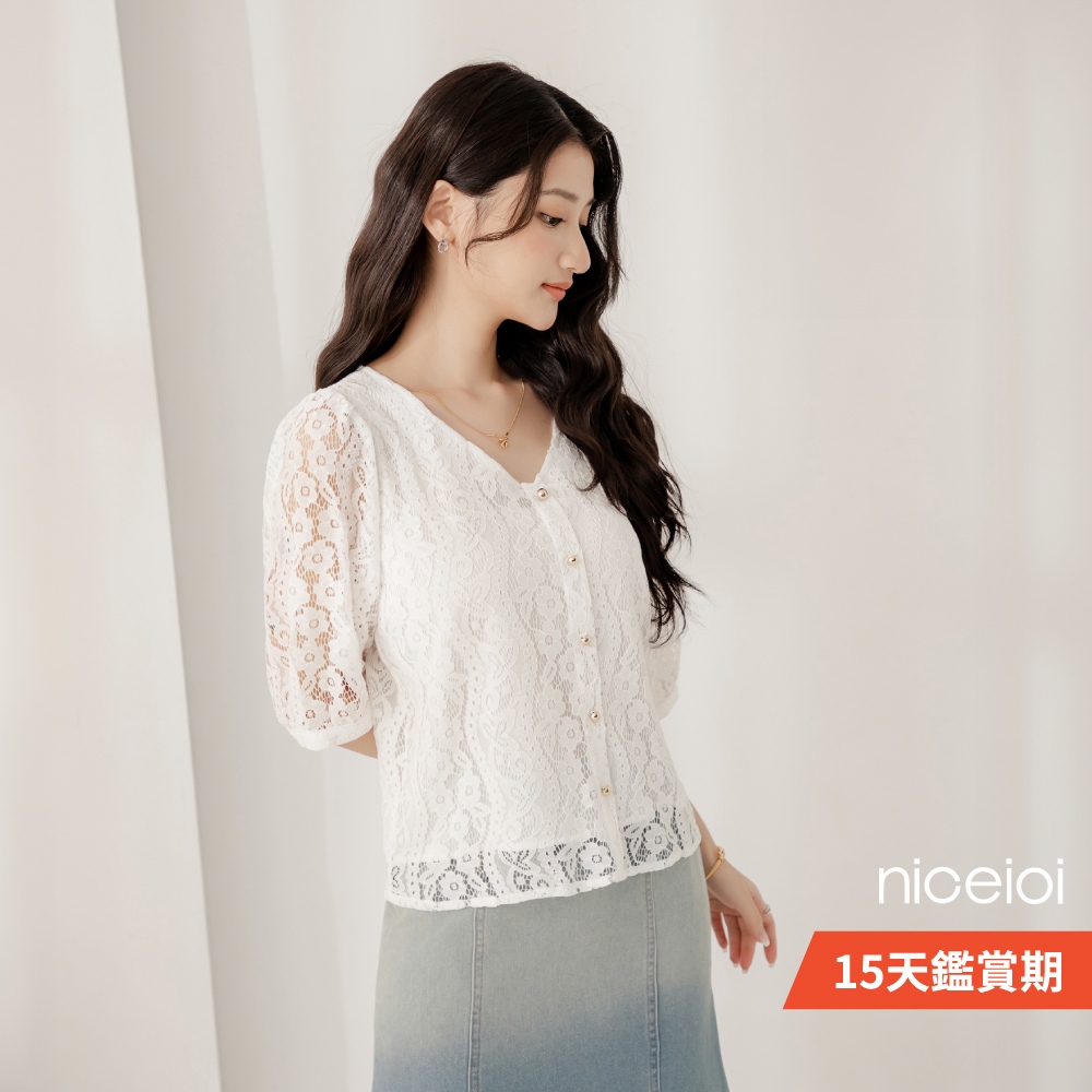 niceioi【特惠】法式金釦鏤空蕾絲五分袖上衣 女裝