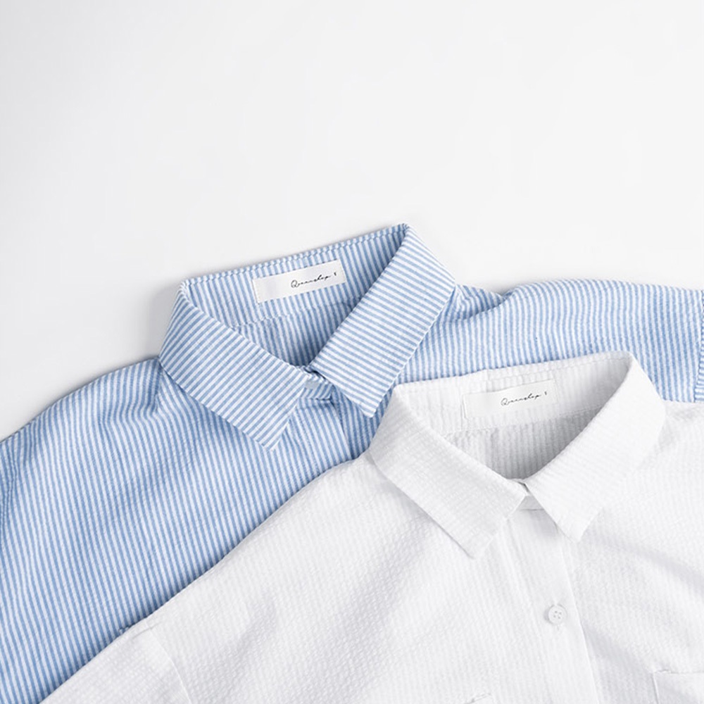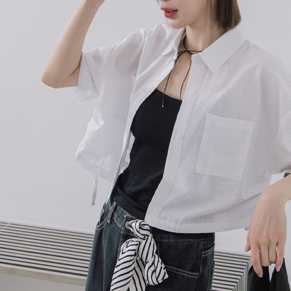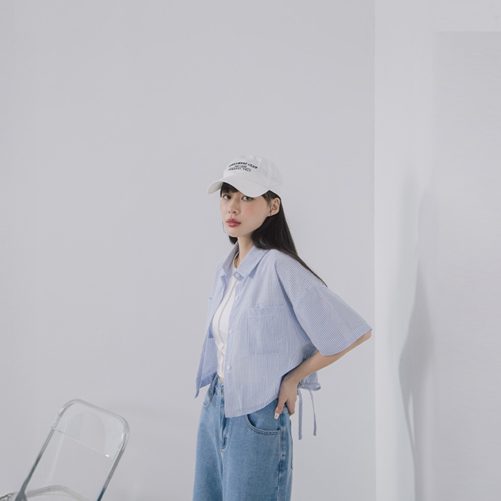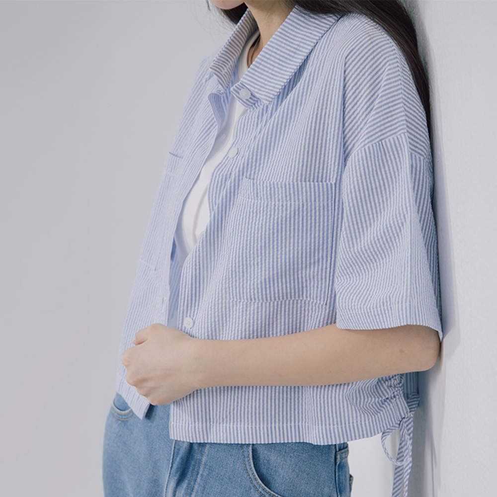 QUEENSHOP_ S 女裝 短袖 條紋側抽繩綁帶短版襯衫 兩色售 現+預 【01025584】白|藍Shirts & BlousesQUEENSHOP
