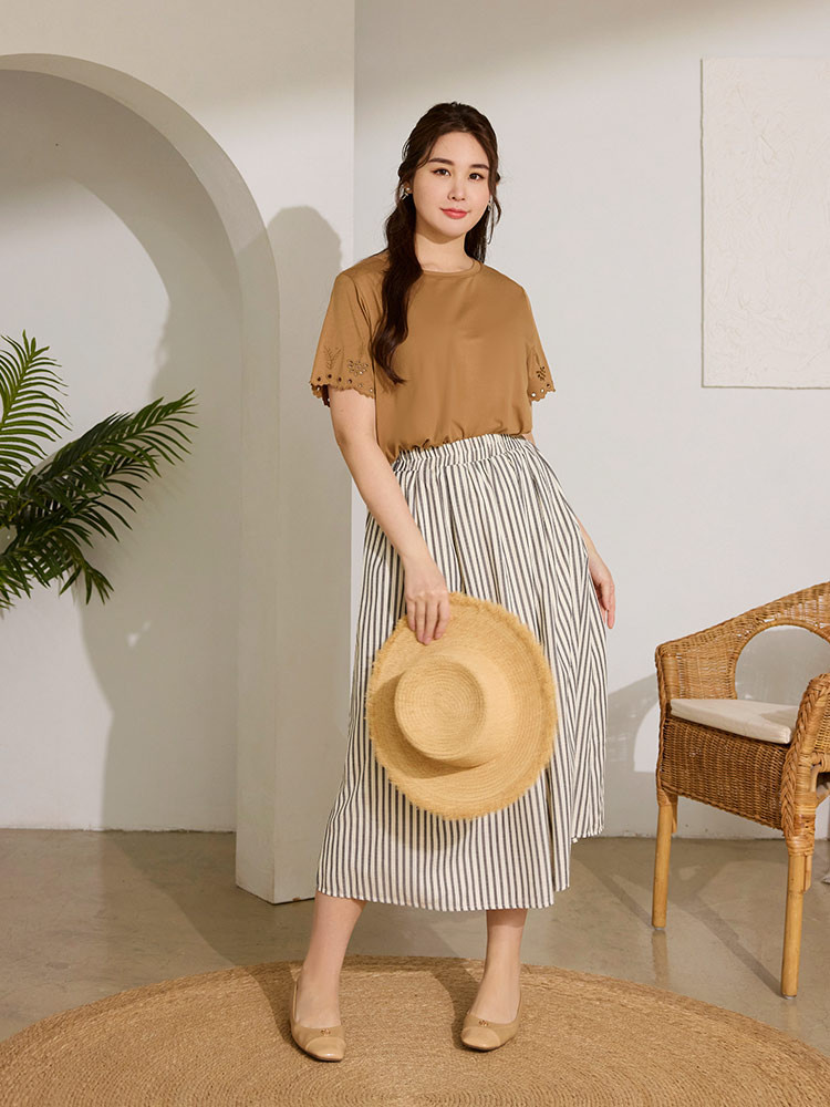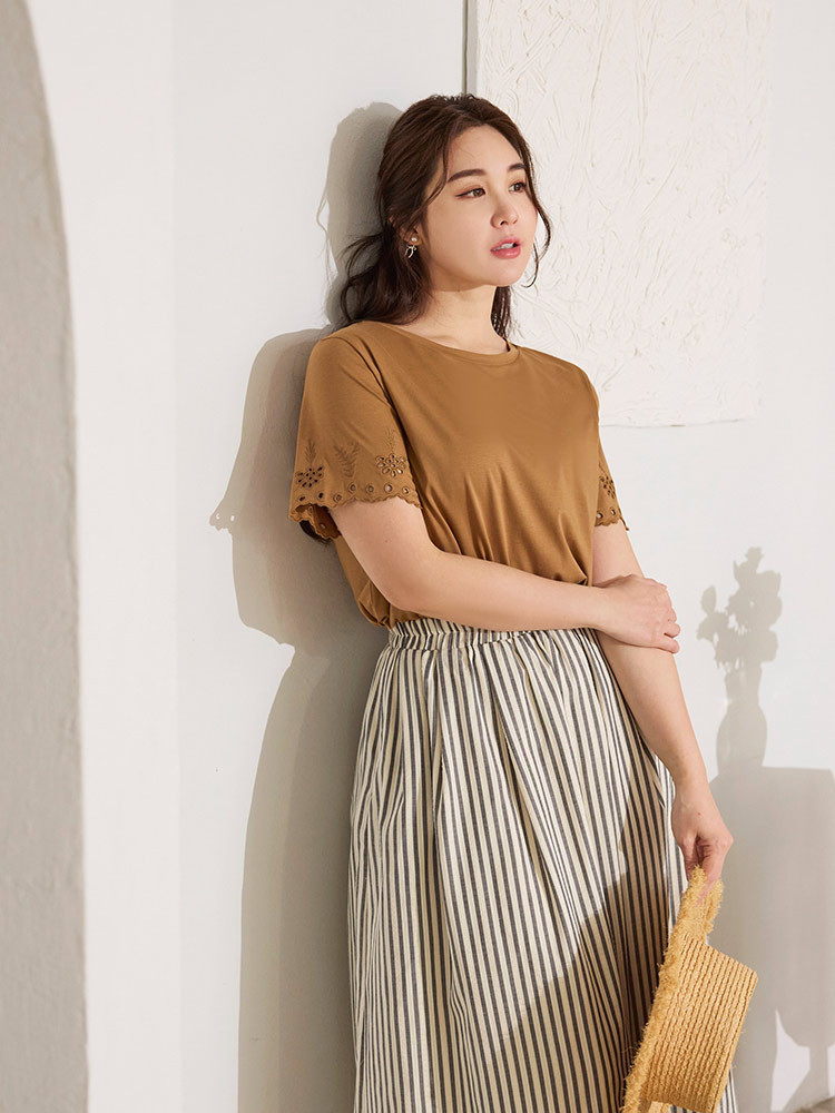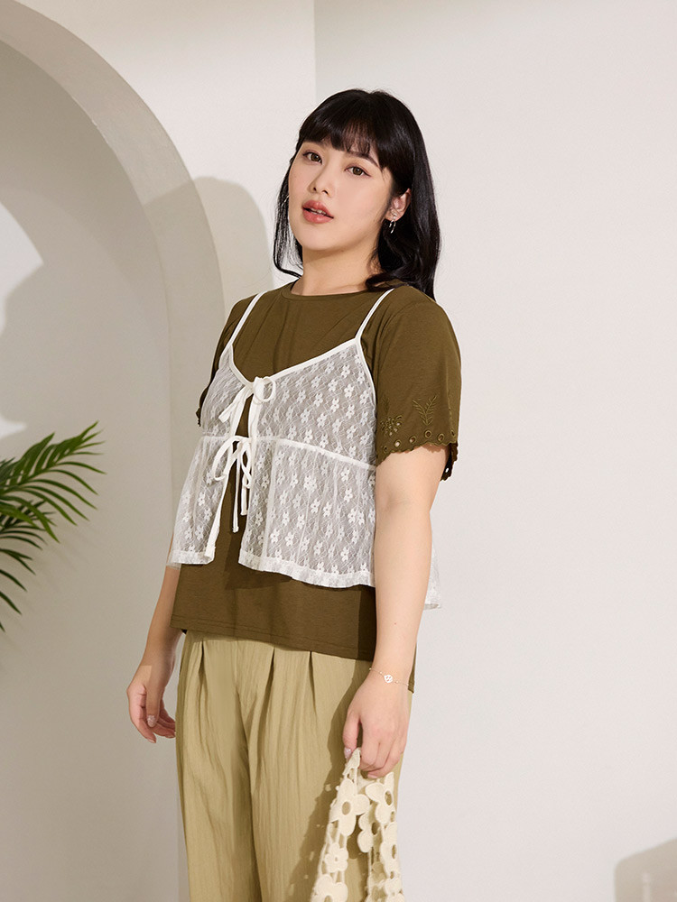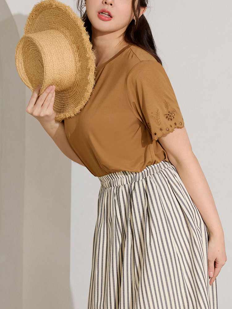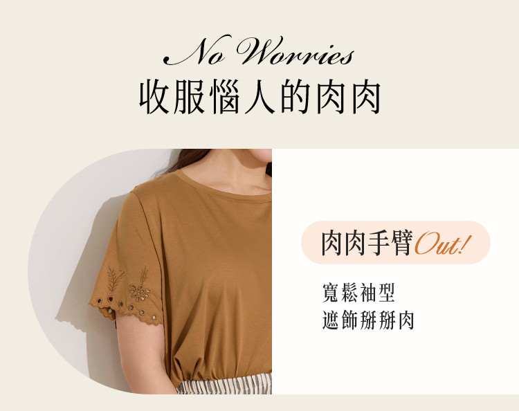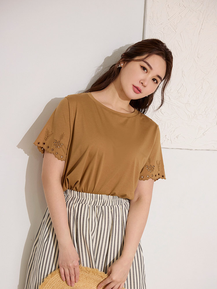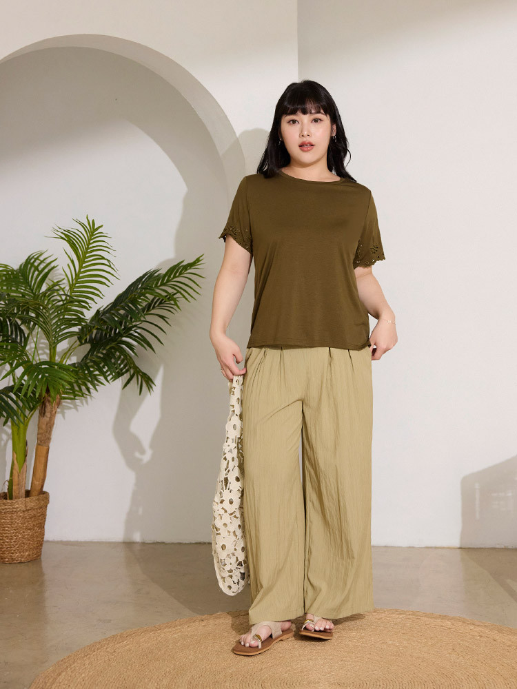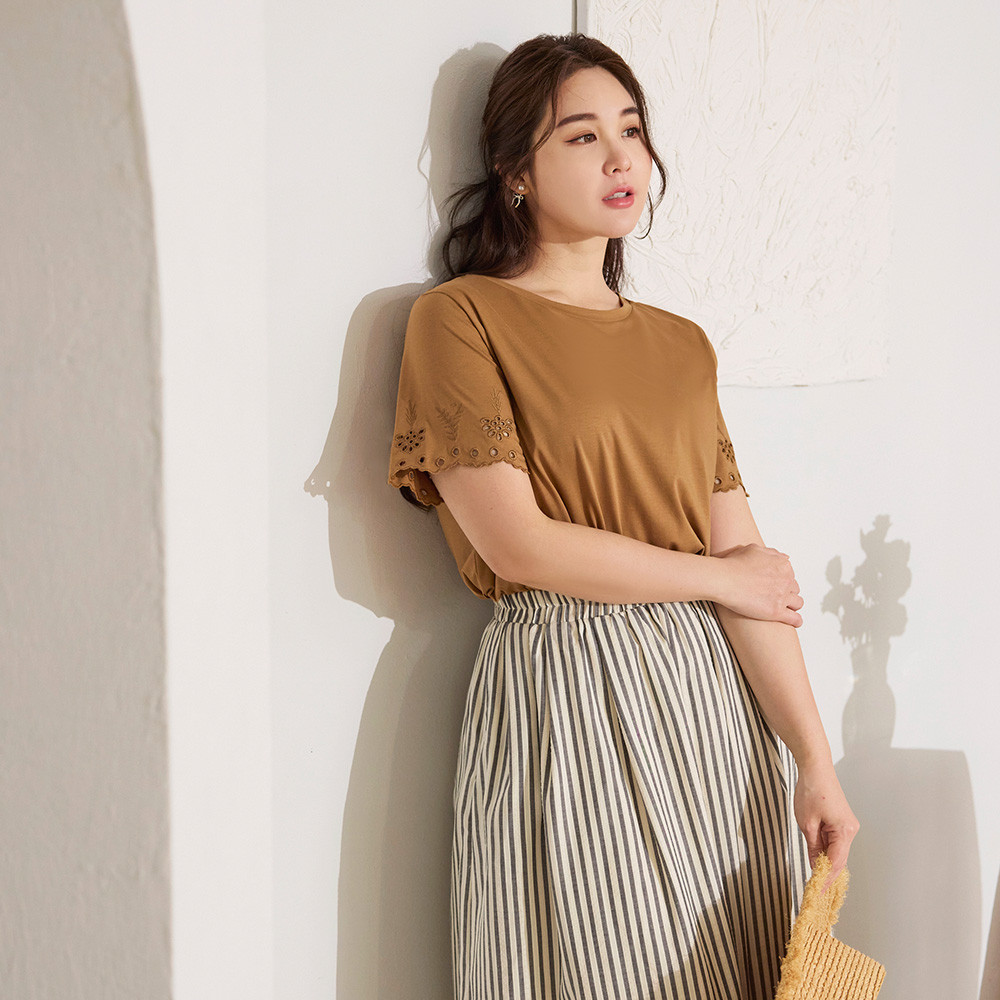 OB嚴選 雲朵自訂款-柔彈棉質燒花短袖上衣 《AB20273》駝,XL|駝,2L|駝,3L|駝,4L|墨綠,XL|墨綠,2L|墨綠,3L|墨綠,4LT-shirtsOB嚴選官方旗艦店