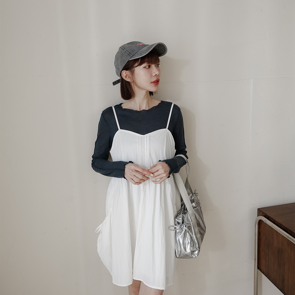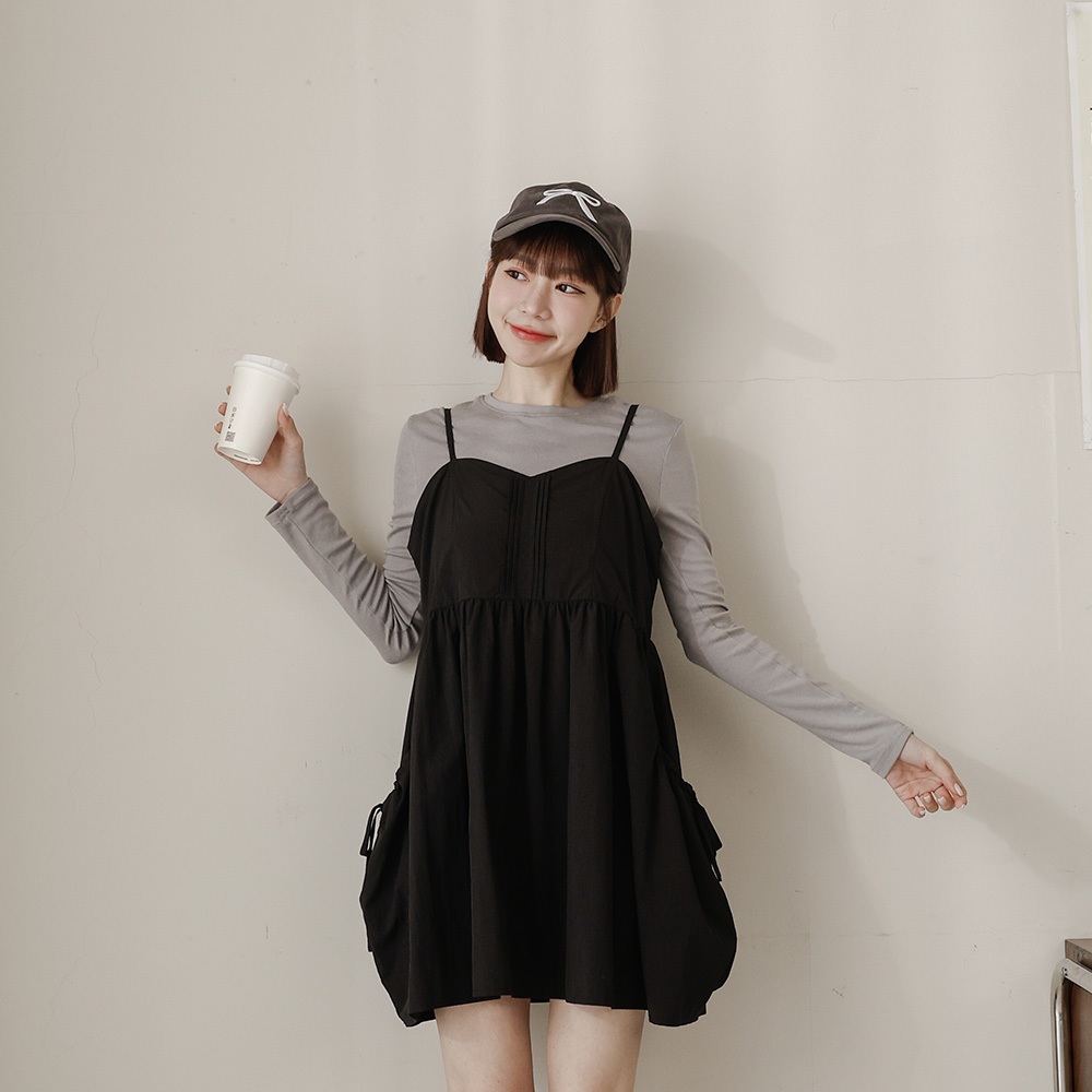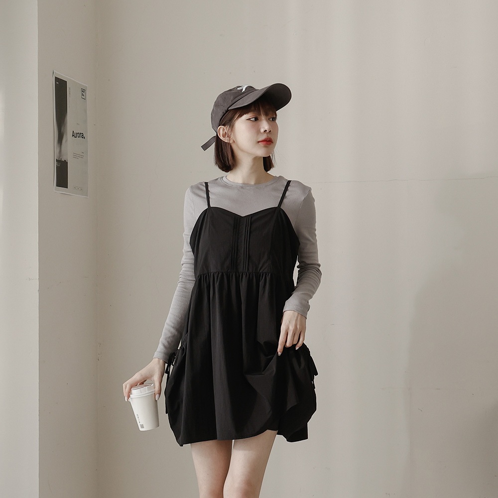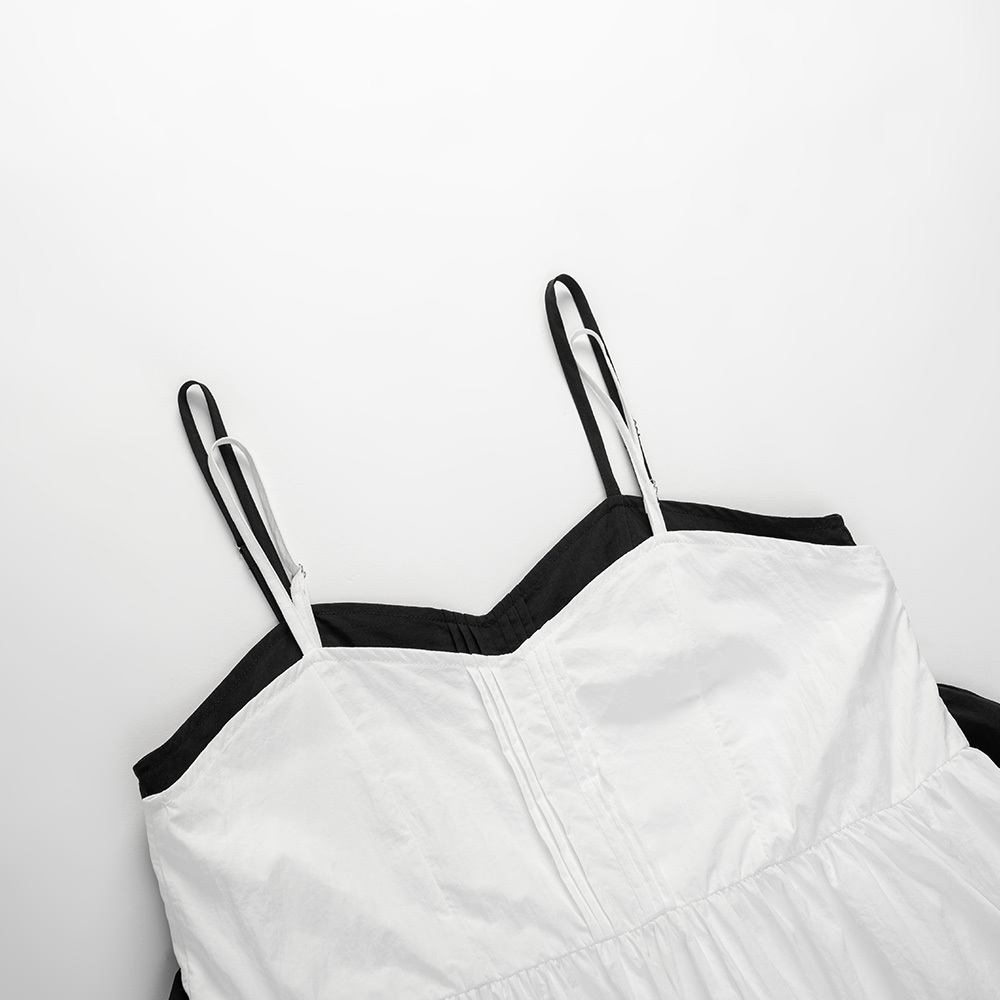 QUEENSHOP_ S 女裝 前打褶V領大口袋細肩短洋裝 兩色售 現+預 【01086975】黑|白QUEENSHOP