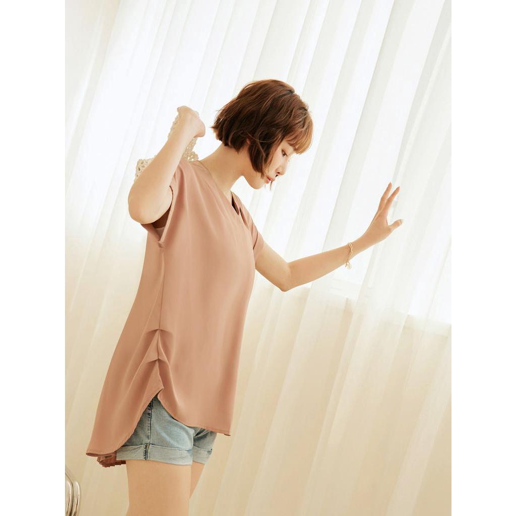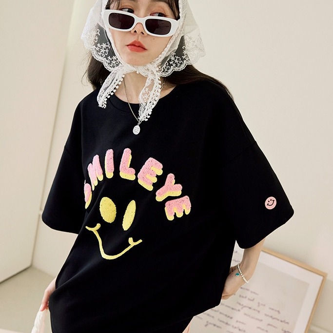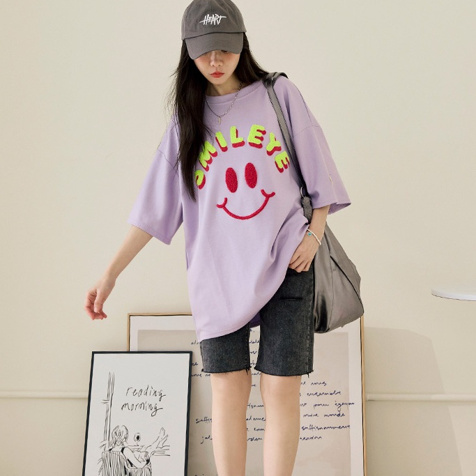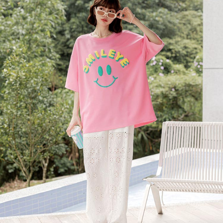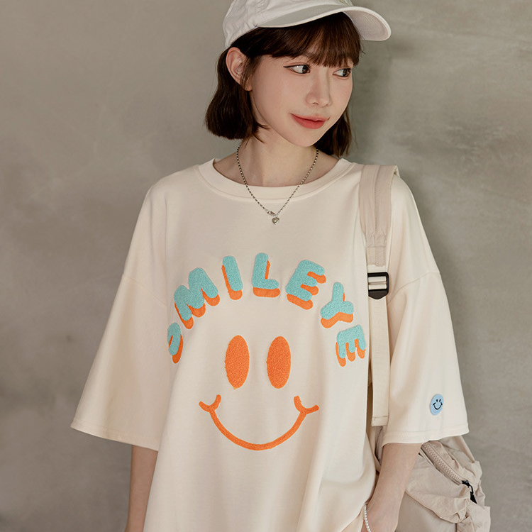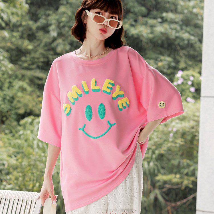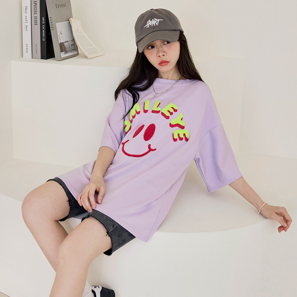 OB嚴選 太空棉微笑毛巾繡寬鬆短袖上衣 《AB20583》杏,F|淺紫,F|莓粉,F|黑,FT-shirtsOB嚴選官方旗艦店
