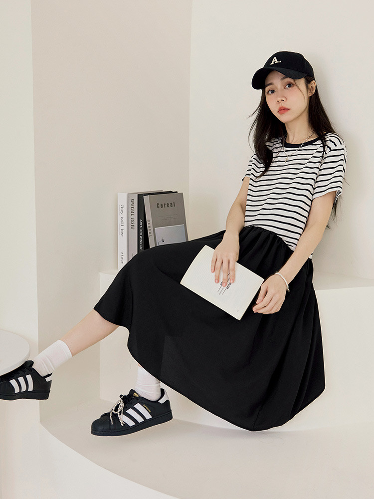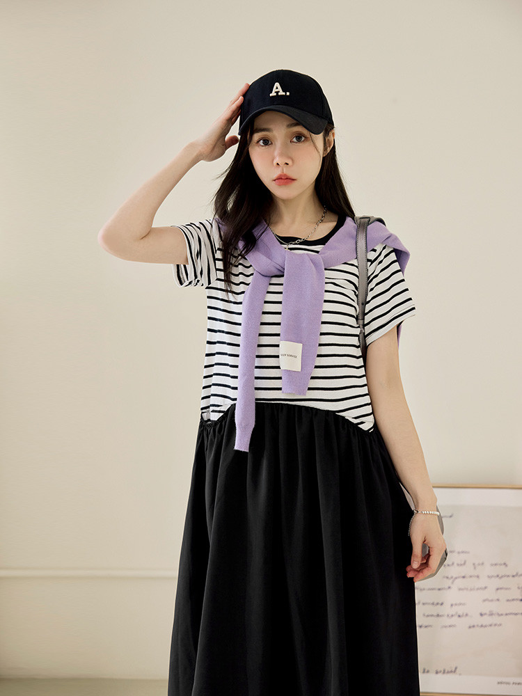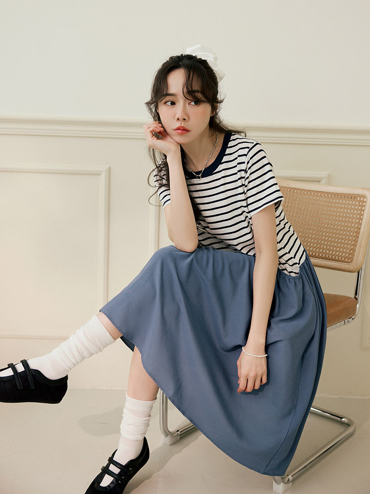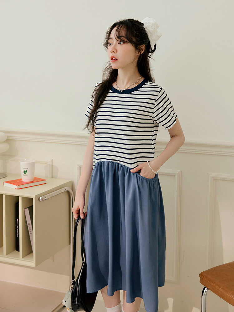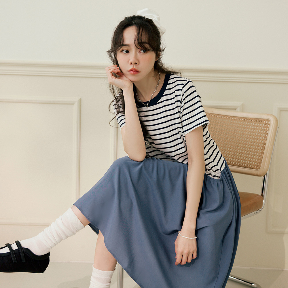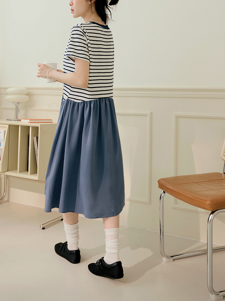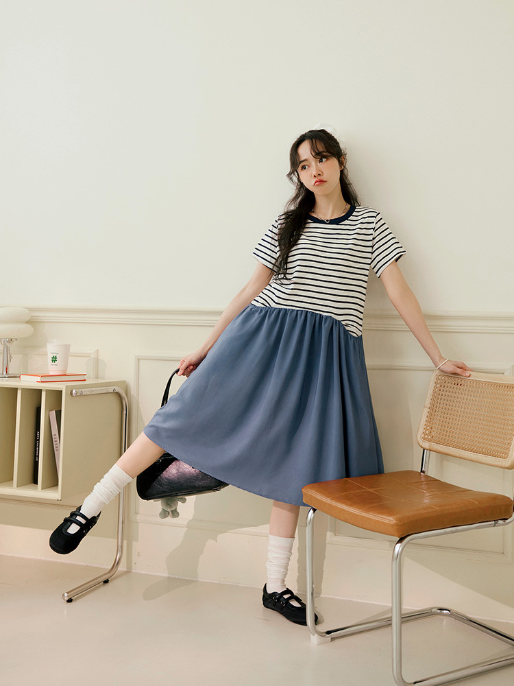 OB嚴選 假兩件橫條紋拼接寬版洋裝 《DA10448》灰藍,M|灰藍,L|灰藍,XL|灰藍,2L|灰藍,3L|灰藍,4L|黑,M|黑,L|黑,XL|黑,2L|黑,3L|黑,4LOB嚴選官方旗艦店