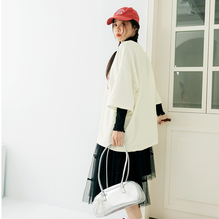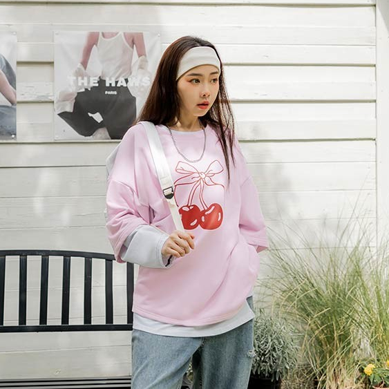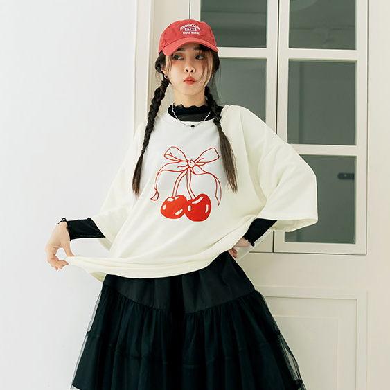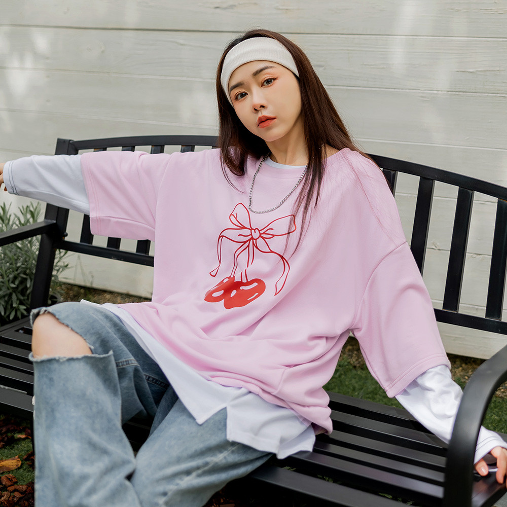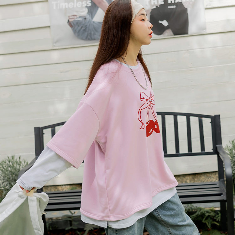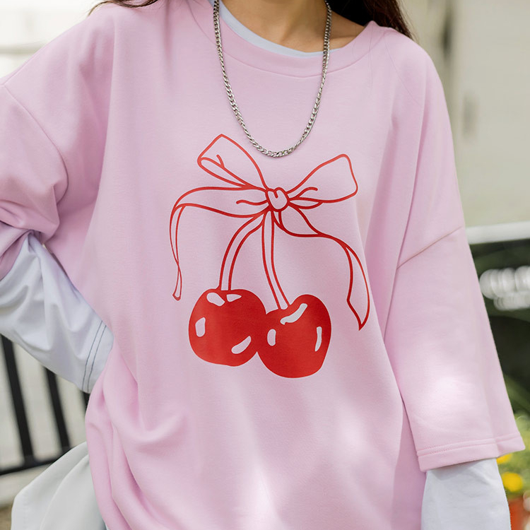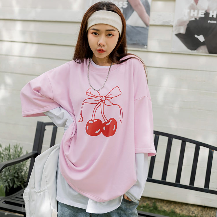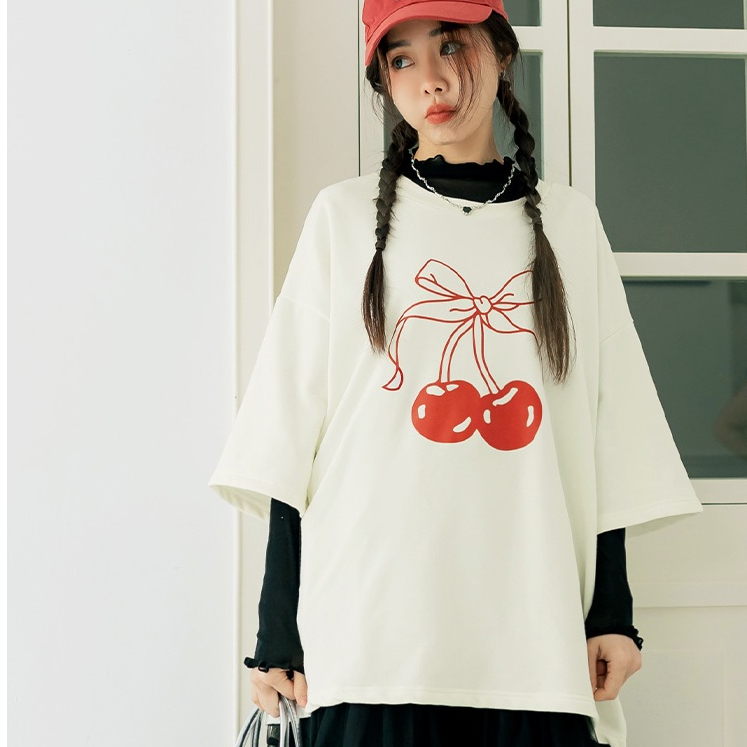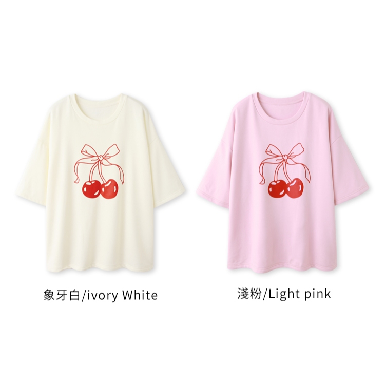 OB嚴選 寬版蝴蝶結櫻桃印花落肩短T 《AB19885》大尺碼/女裝/現貨/大尺碼T桖淺粉,F|象牙白,FT-shirtsOB嚴選官方旗艦店