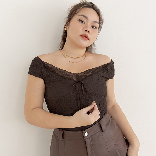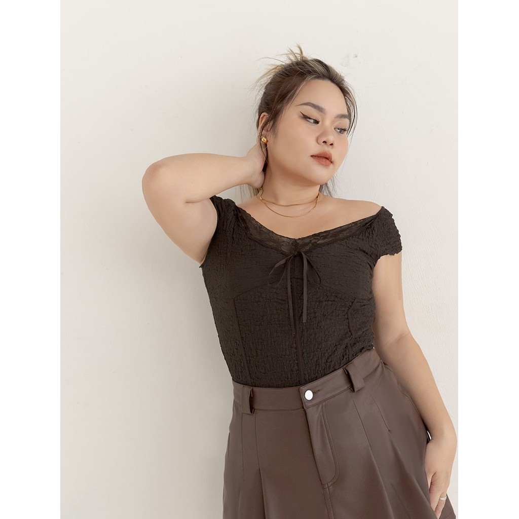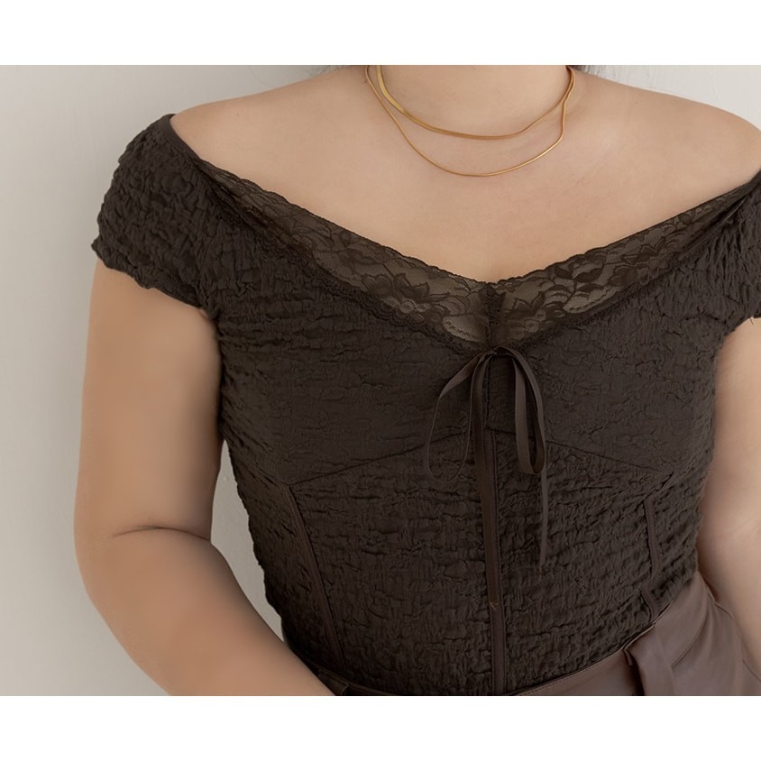 【PolyLulu】 MUA!辣妹蕾絲V領皺面小蓋袖上衣 中大尺碼上衣 深棕色L|XL|2XL|3XLOthersPOLY LULU丨BEAUTY HAS NO SIZE 中大尺碼女裝
