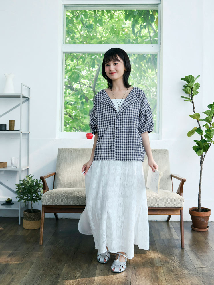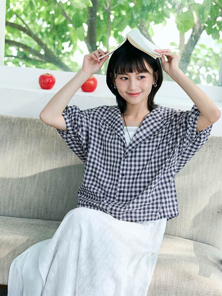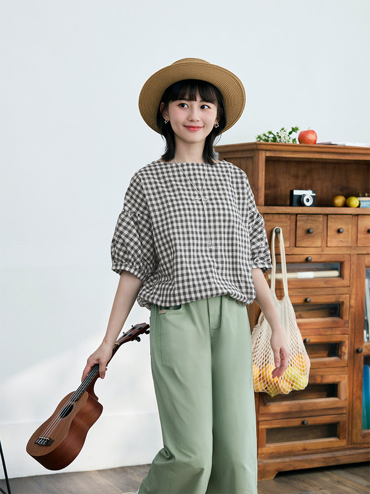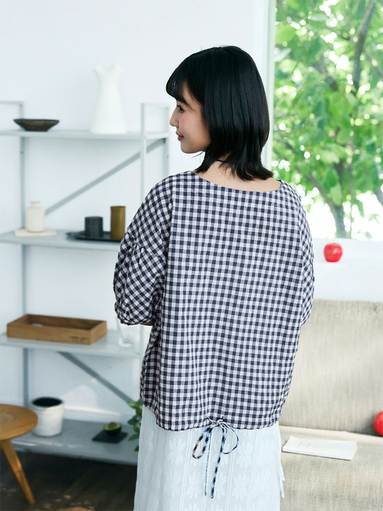 OB嚴選 日系2WAY純棉格紋下擺抽繩泡泡袖上衣 《AB20331》灰藍,F|灰藍,XL|灰藍,2L|灰藍,3L|黑,F|黑,XL|黑,2L|黑,3LT-shirtsOB嚴選官方旗艦店