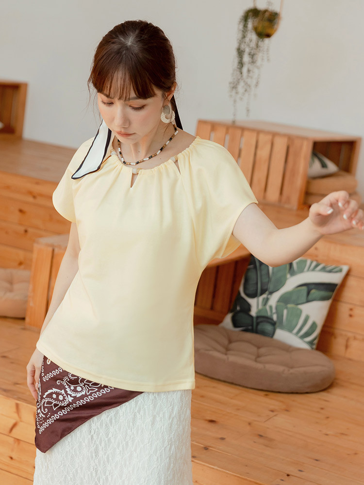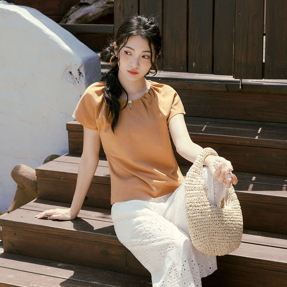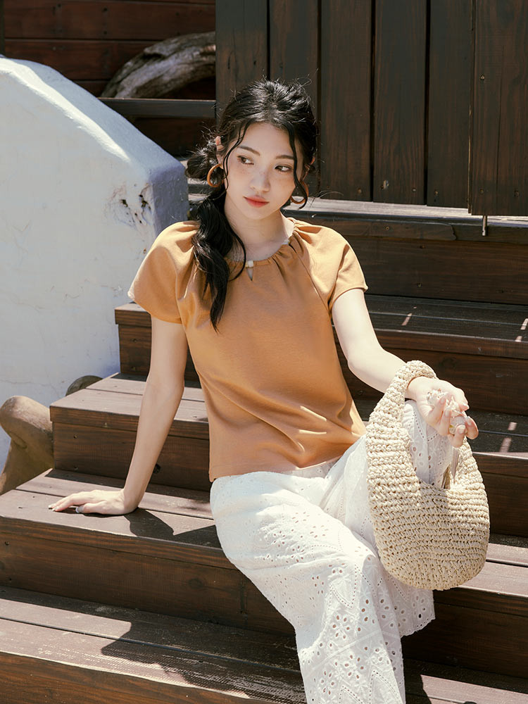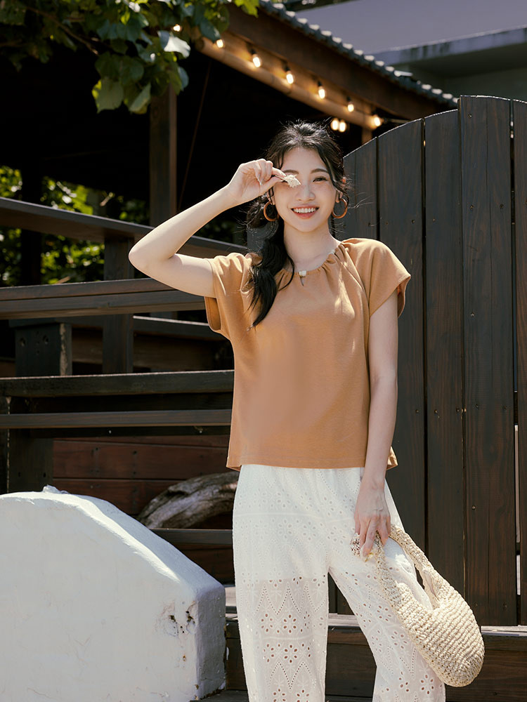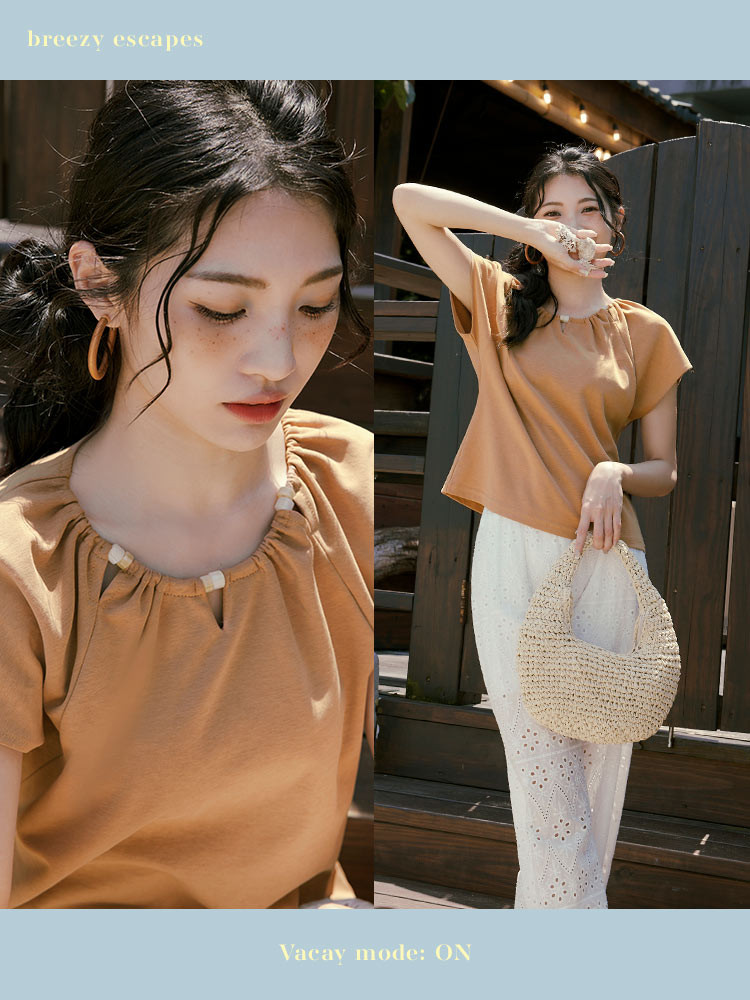 OB嚴選 棉質典雅抽皺圓領珠飾上衣 《AB20268》米黃,S|米黃,M|米黃,L|米黃,XL|米黃,2L|米黃,3L|咖啡,S|咖啡,M|咖啡,L|咖啡,XL|咖啡,2L|咖啡,3LT-shirtsOB嚴選官方旗艦店