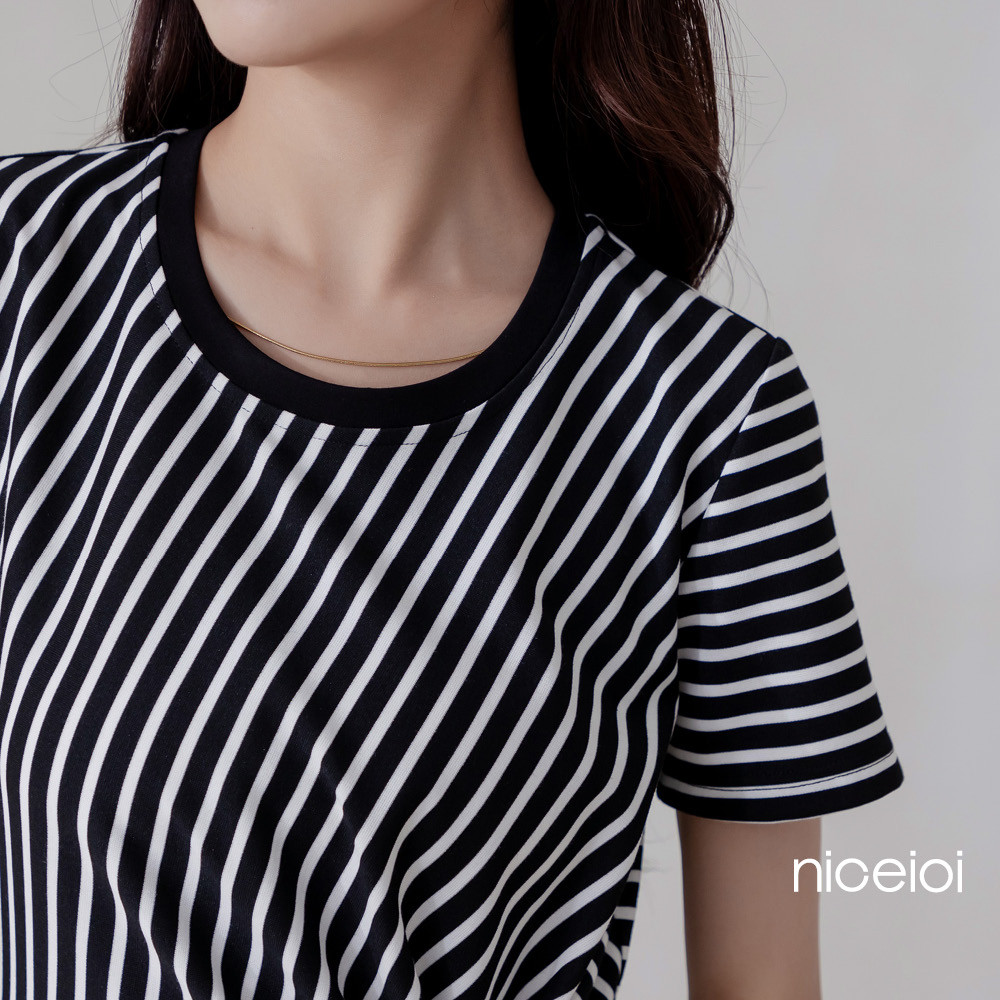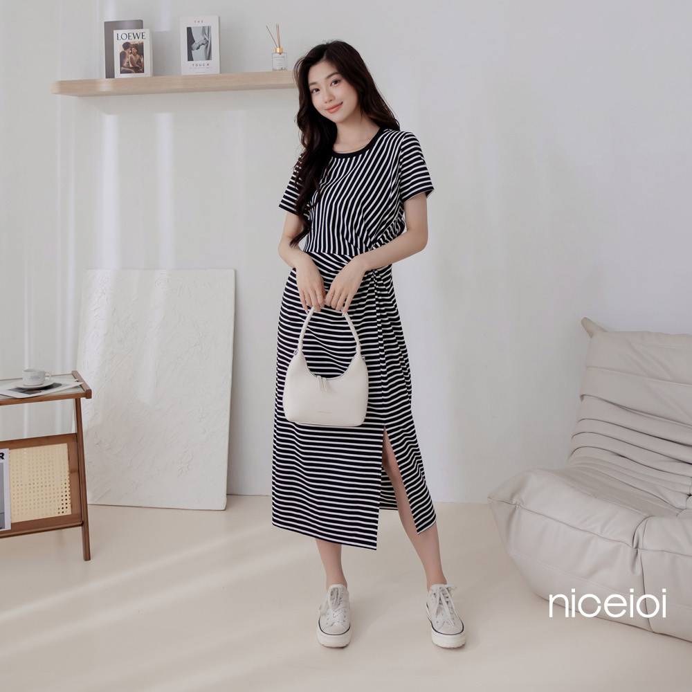 niceioi 夏日慵懶斜條紋側收腰羅馬布洋裝 女裝黑,S|黑,M|黑,L|黑,XLniceioi 官方旗艦店