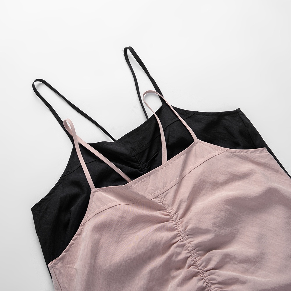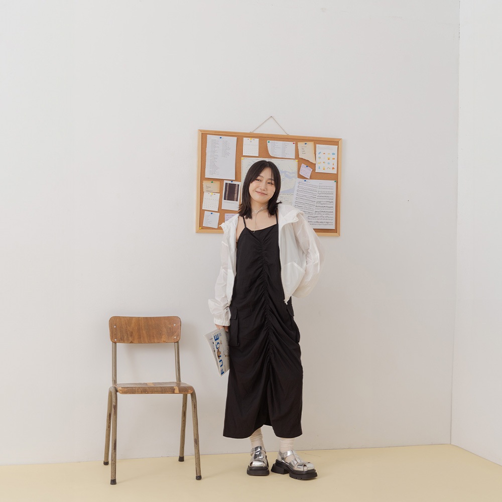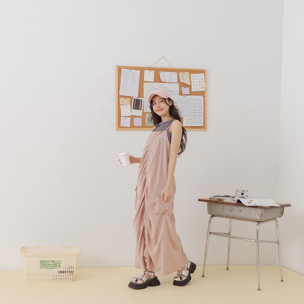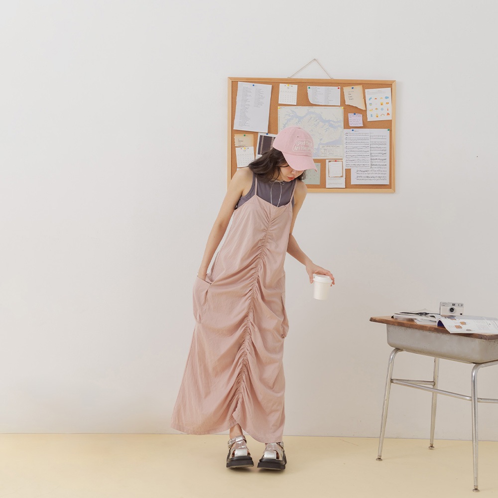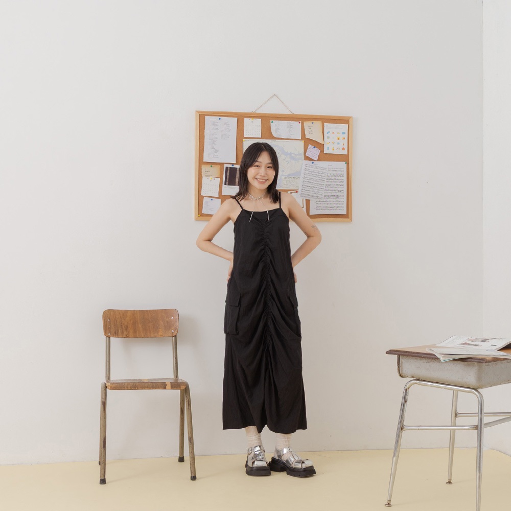 QUEENSHOP_ S 女裝 抽皺側邊大口袋造型細肩長洋裝 兩色售 現+預 【01087040】黑|粉QUEENSHOP