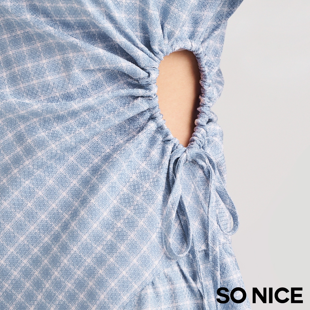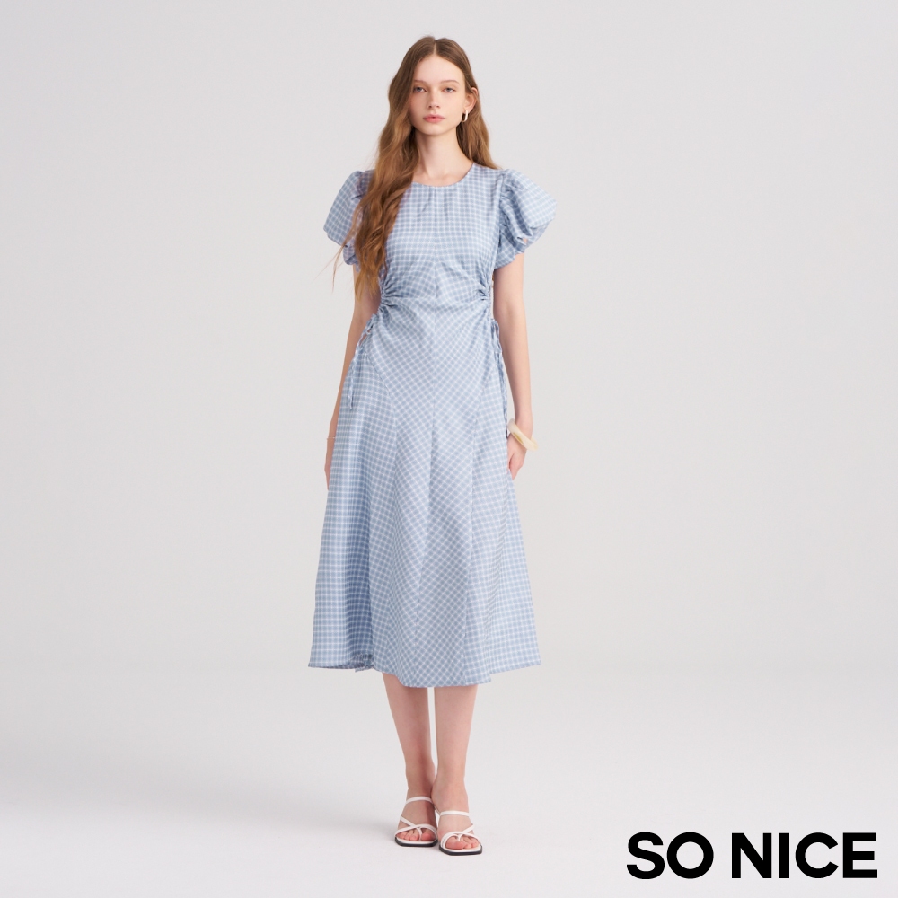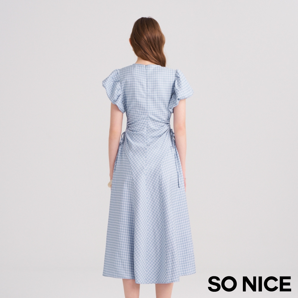 SO NICE【特惠】格紋圓領公主袖鏤空顯瘦抽繩洋裝|都會時尚女裝【58434005】藍,40(L)|藍,34(XS)|藍,36(S)|藍,38(M)SO NICE 官方旗艦店