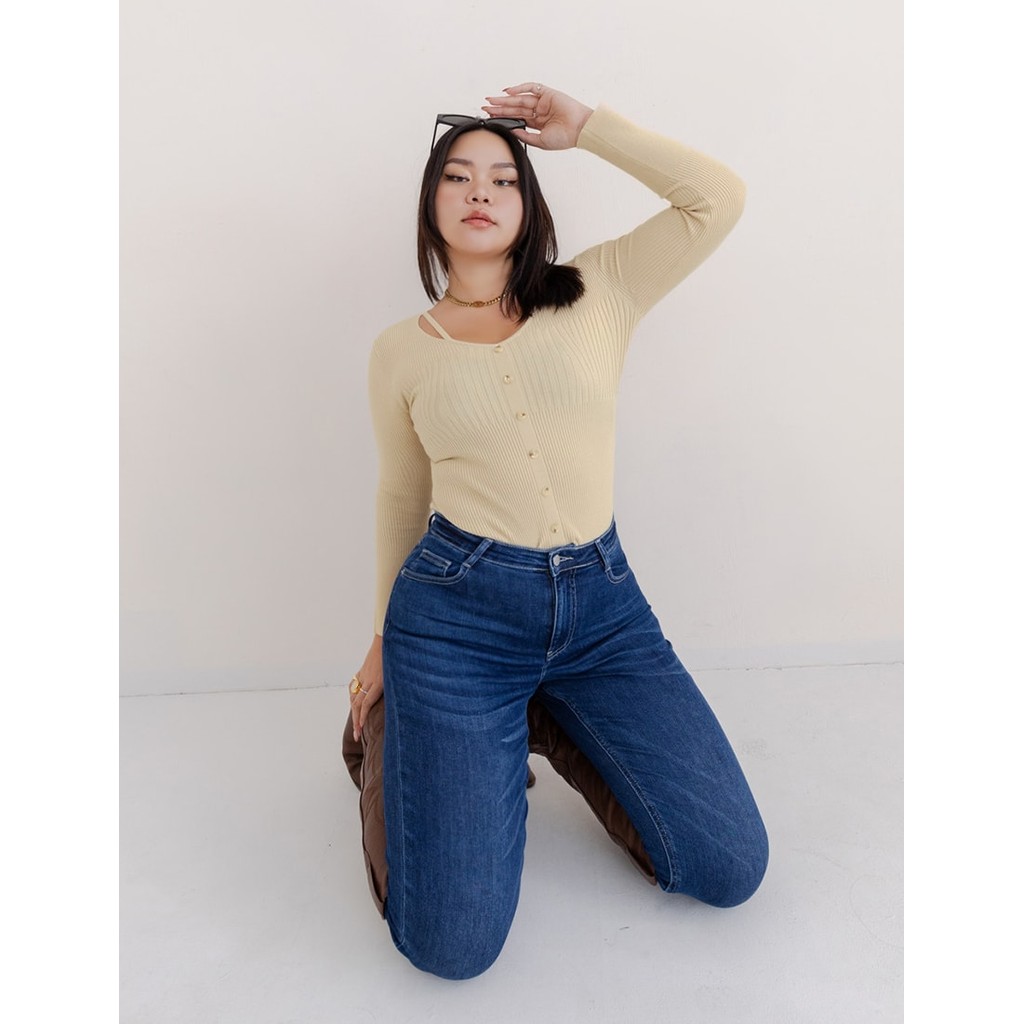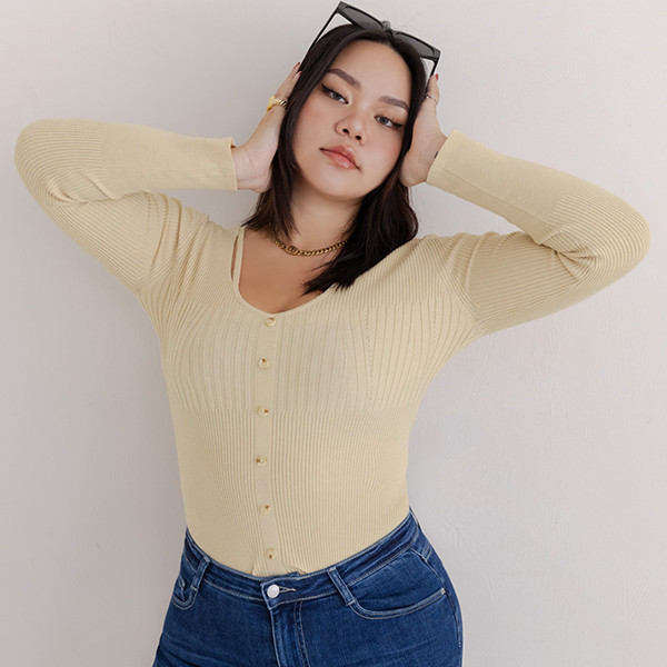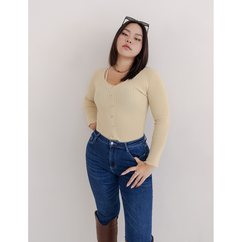 【PolyLulu】 MUA!微辣辣妹鏤空假排釦針織長袖上衣 中大尺碼上衣 杏色3XL|L|XL|2XLPOLY LULU丨BEAUTY HAS NO SIZE 中大尺碼女裝