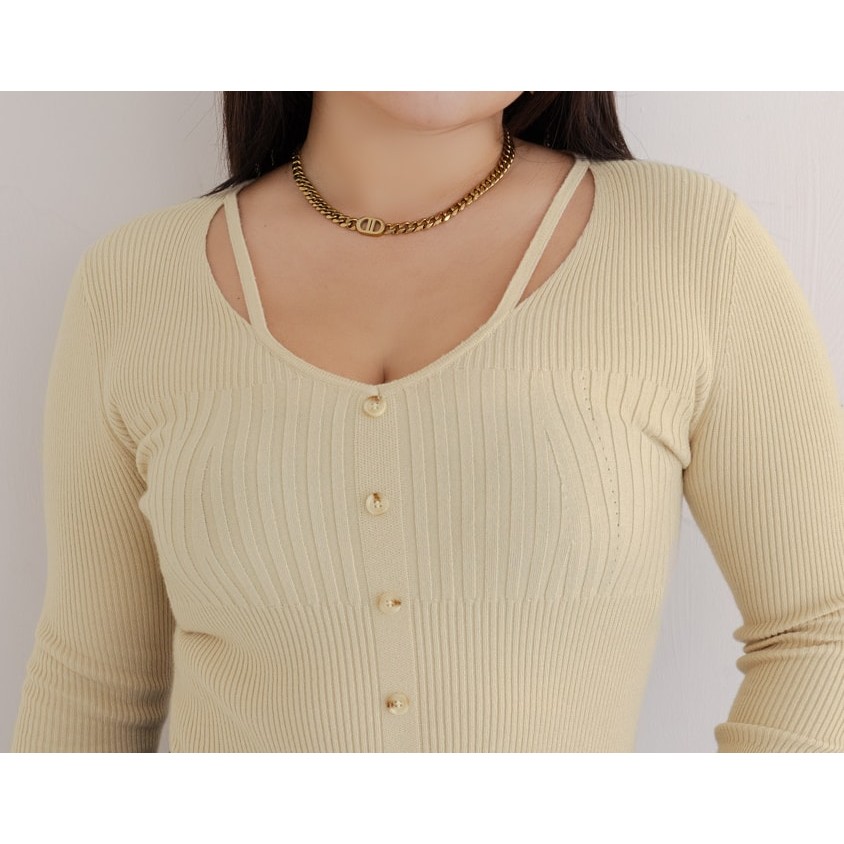 【PolyLulu】 MUA!微辣辣妹鏤空假排釦針織長袖上衣 中大尺碼上衣 杏色