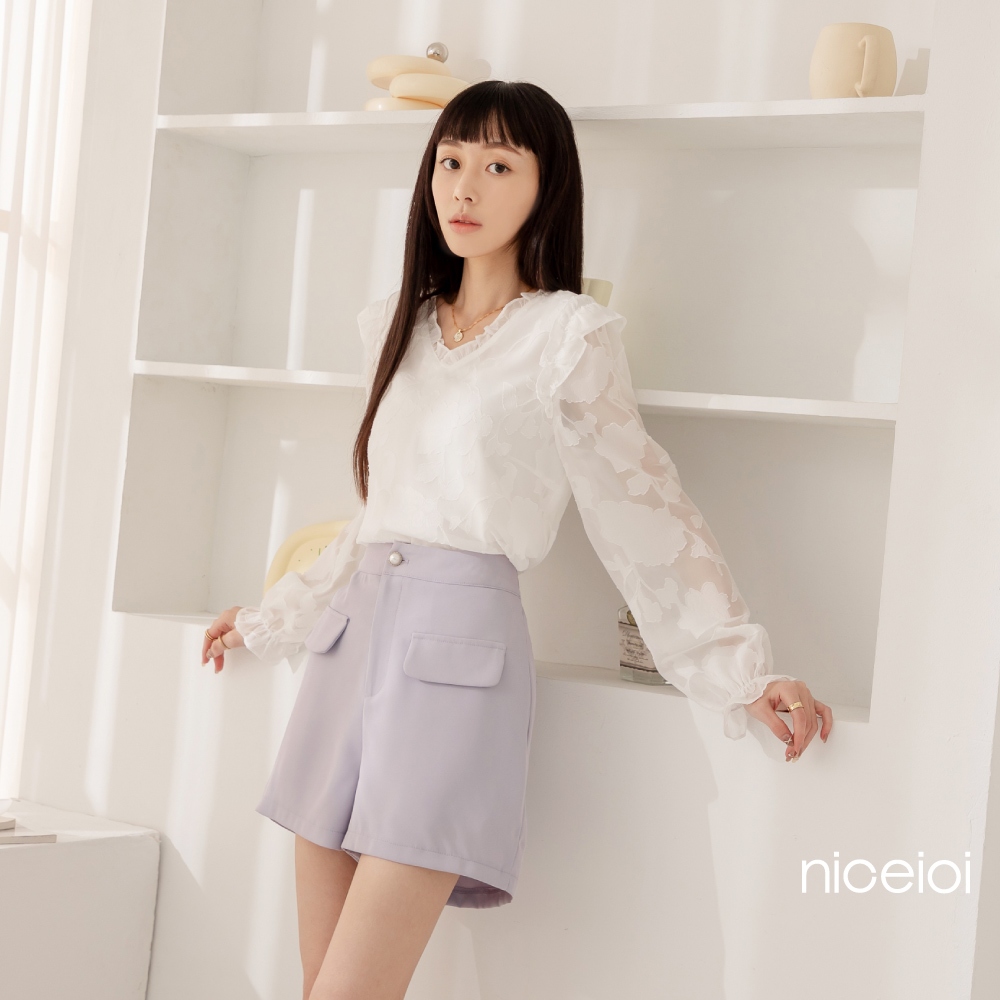 niceioi【特惠】小香風上衣 排釦上衣 荷葉短袖 米色 [溫婉小香綁帶拼接排釦上衣] 女裝米,L|米,XL|米,S|米,MT-shirtsniceioi 官方旗艦店