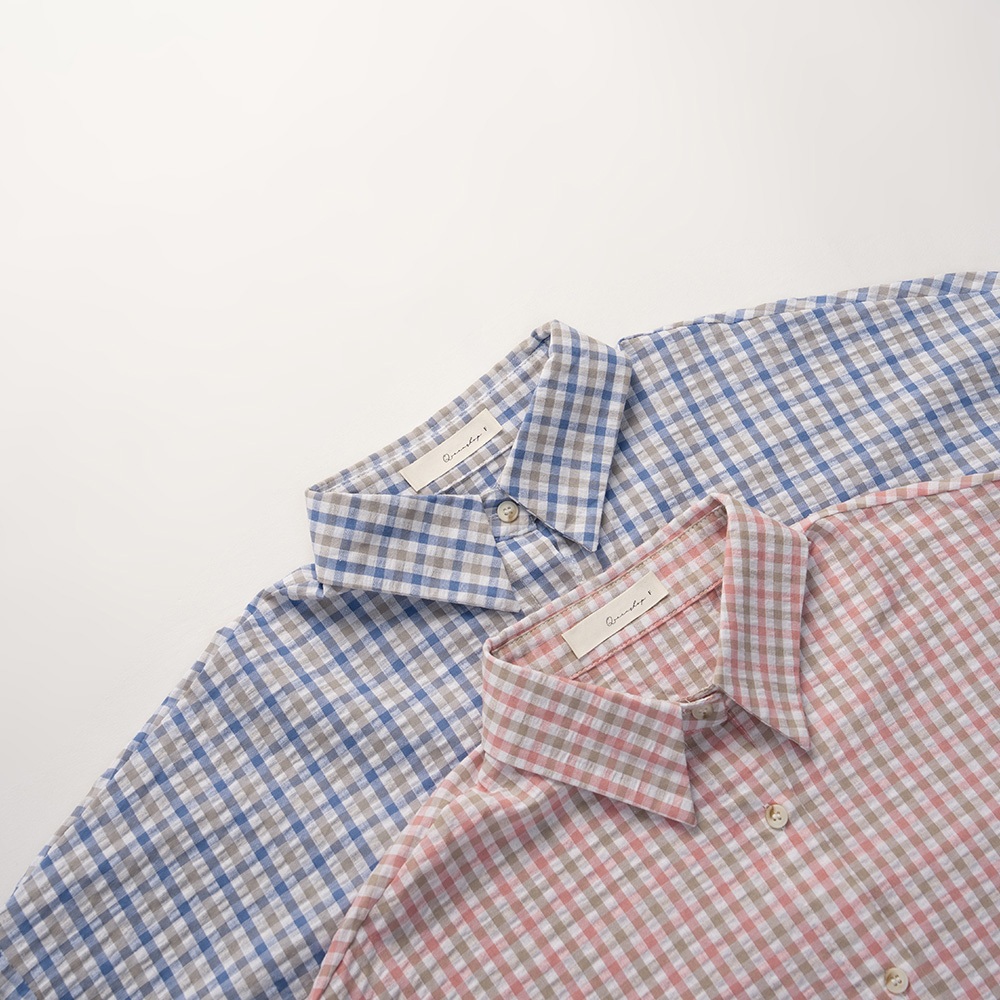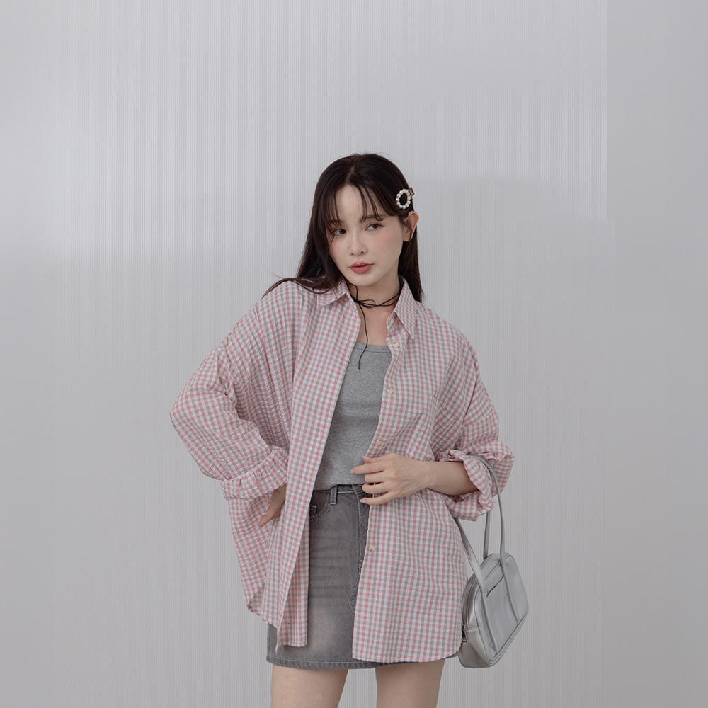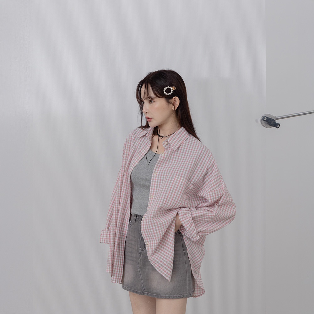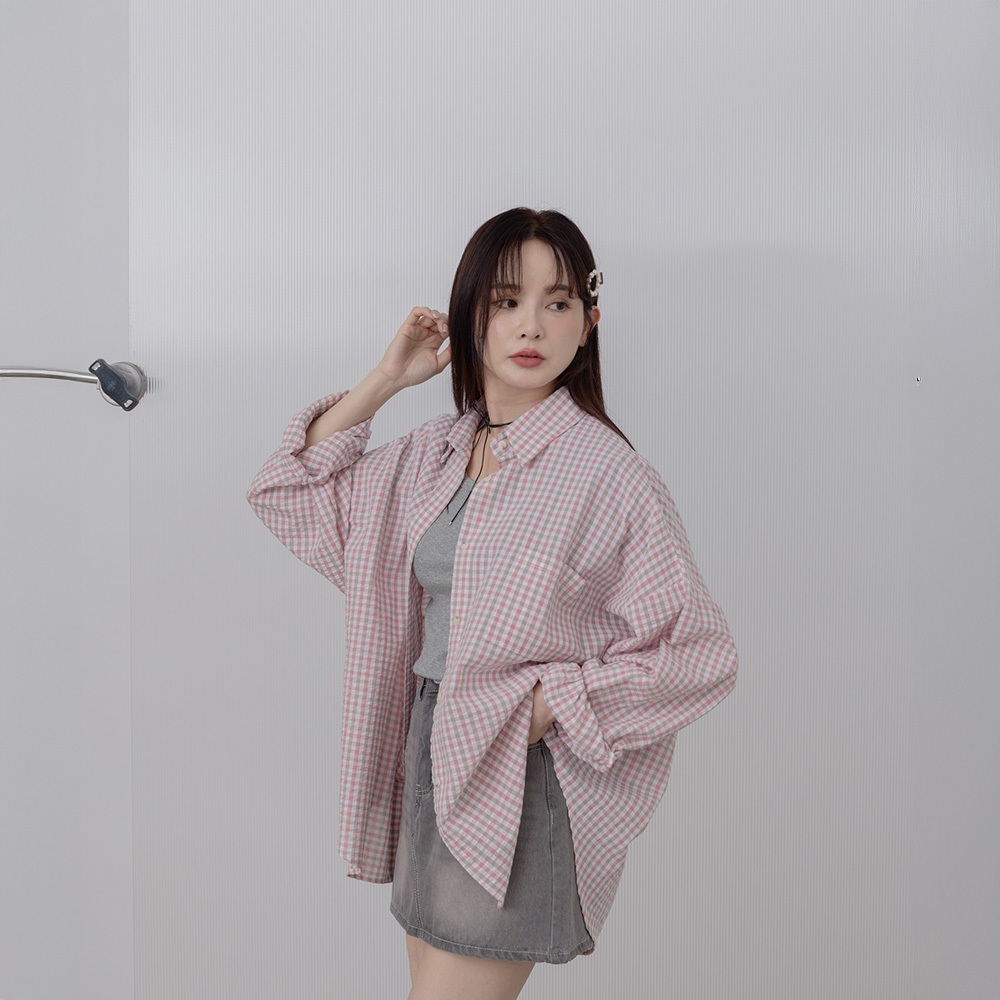 QUEENSHOP_ S 女裝 長袖 撞色細格紋理長袖寬版襯衫 兩色售 現+預 【01025608】粉|藍Shirts & BlousesQUEENSHOP