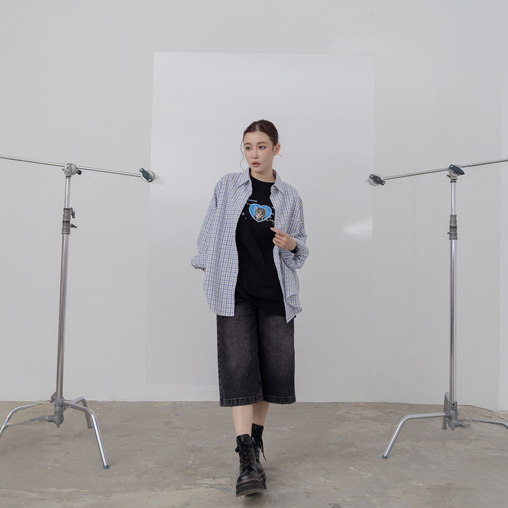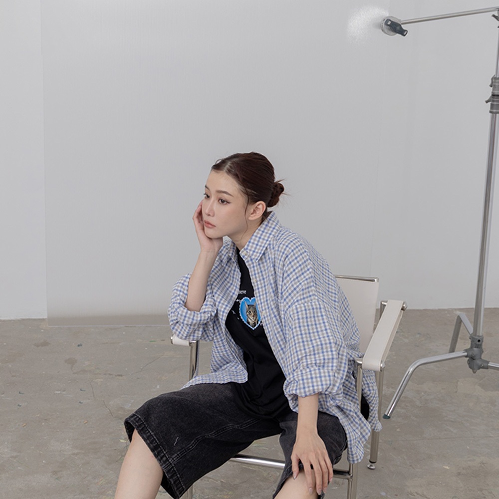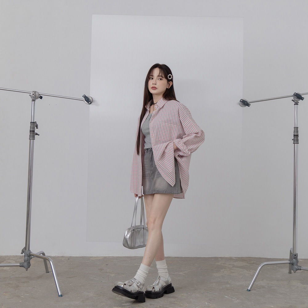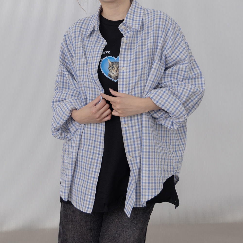 QUEENSHOP_ S 女裝 長袖 撞色細格紋理長袖寬版襯衫 兩色售 現+預 【01025608】粉|藍Shirts & BlousesQUEENSHOP